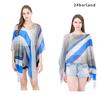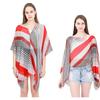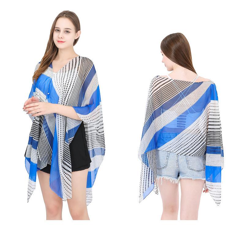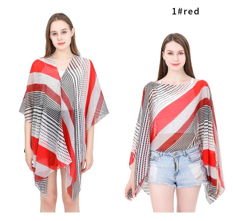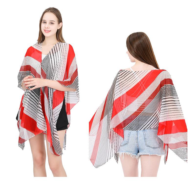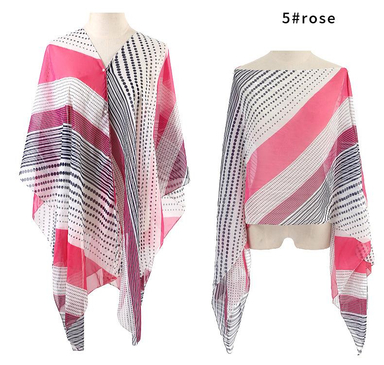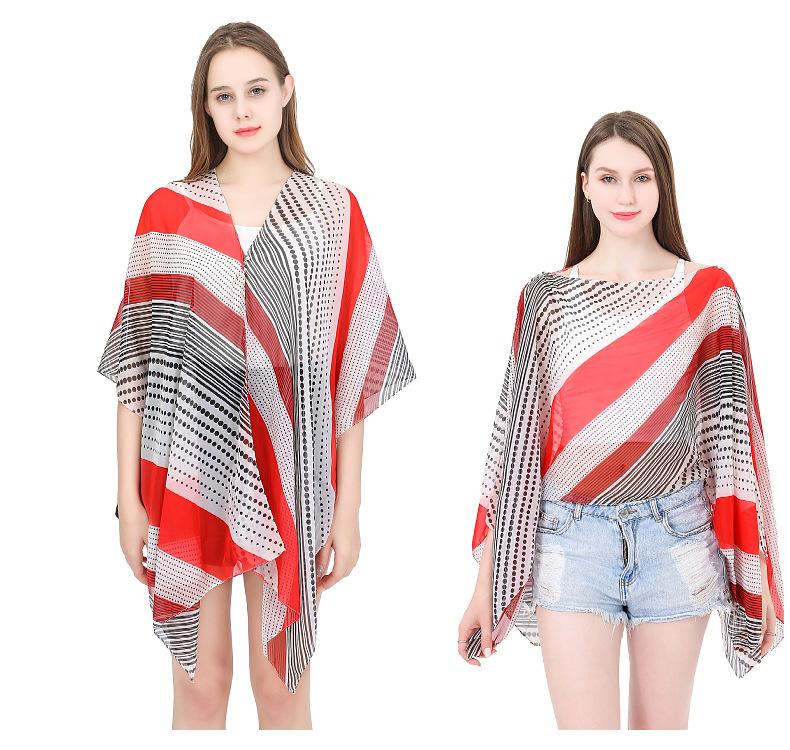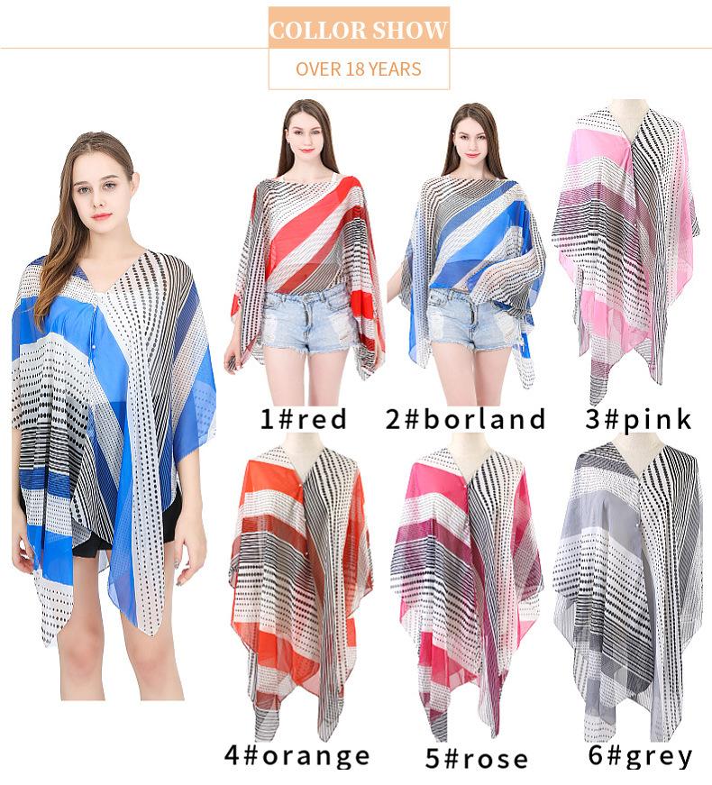 Capa tipo jersey de gasa con botones de perlas para mujer, venta al por mayor, suministro directo de fábrica, chal de protección solar de verano con rayas de colores impresos