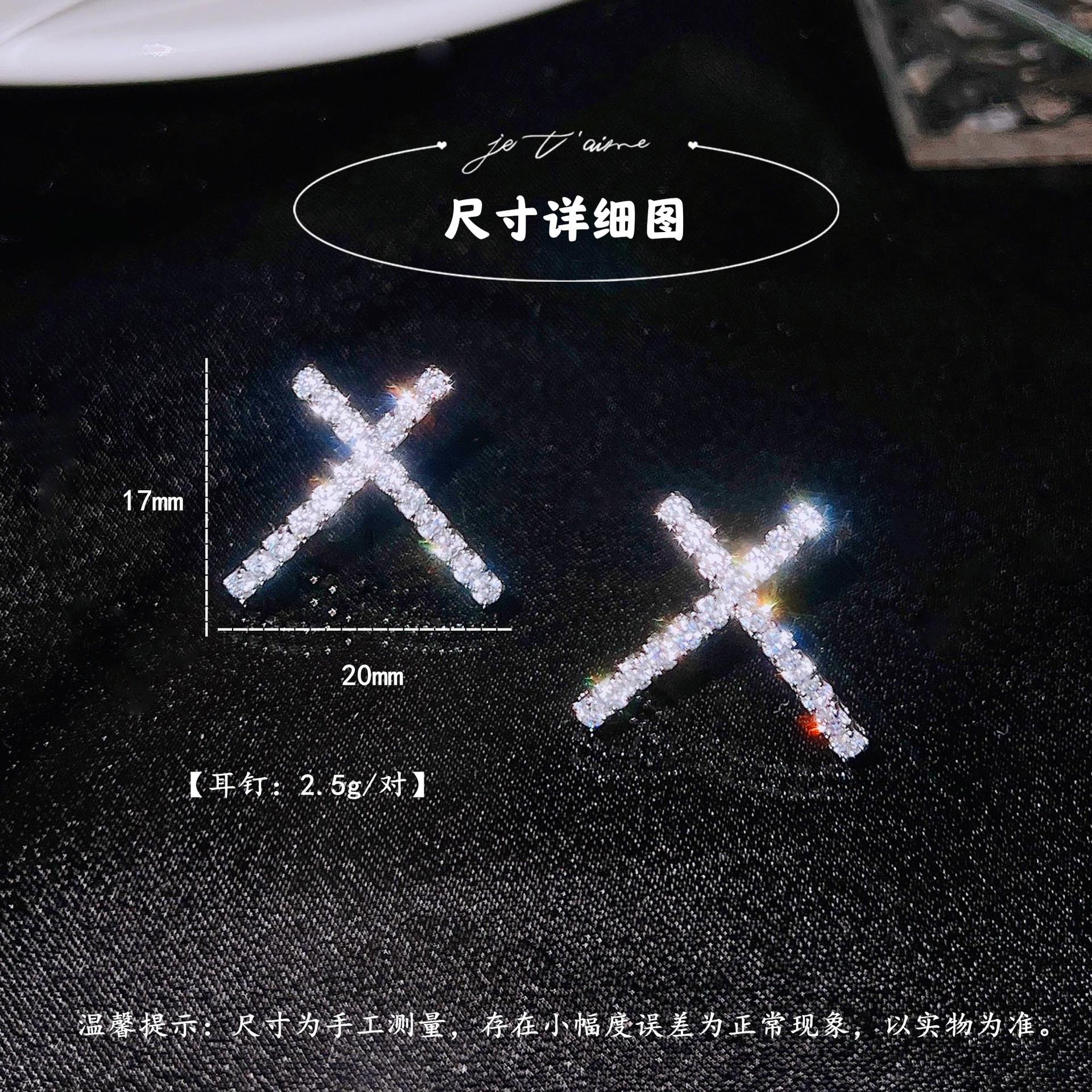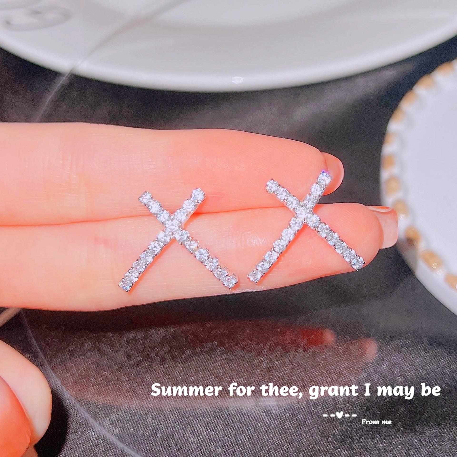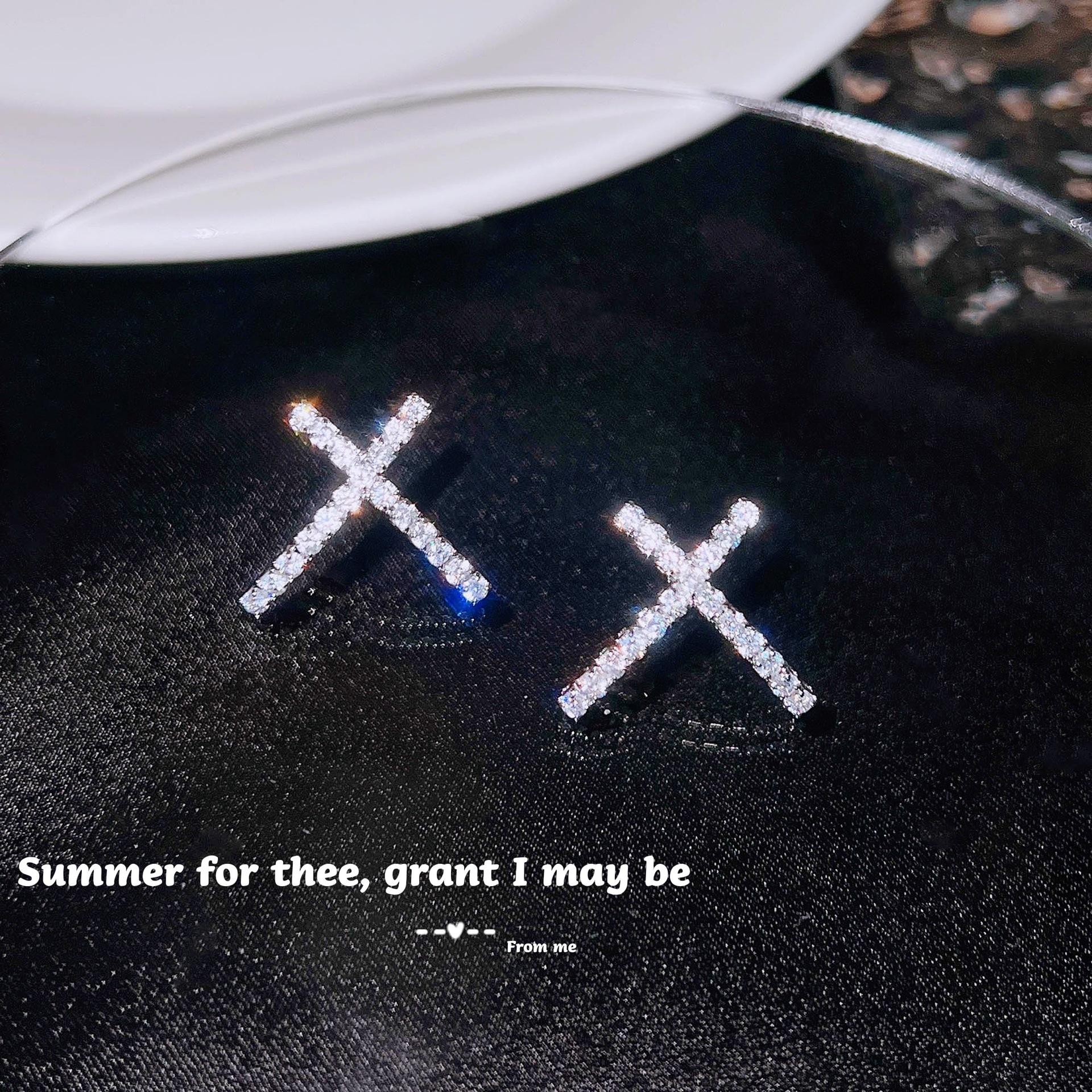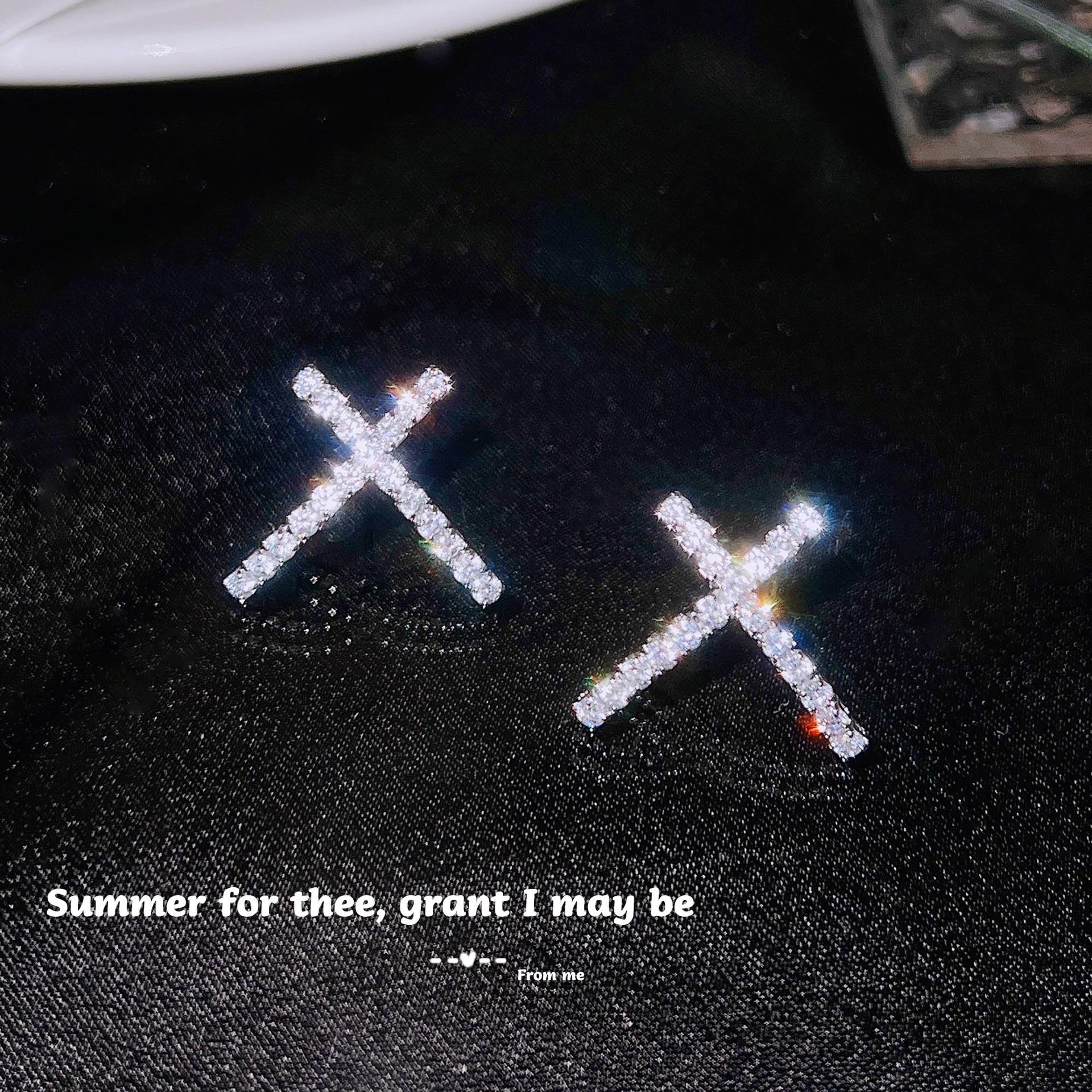 Pendientes pequeños exquisitos con forma de cruz en forma de X y diamantes de plata S925 para mujer, diseño de nicho, de lujo y ligeros para celebridades de Internet.