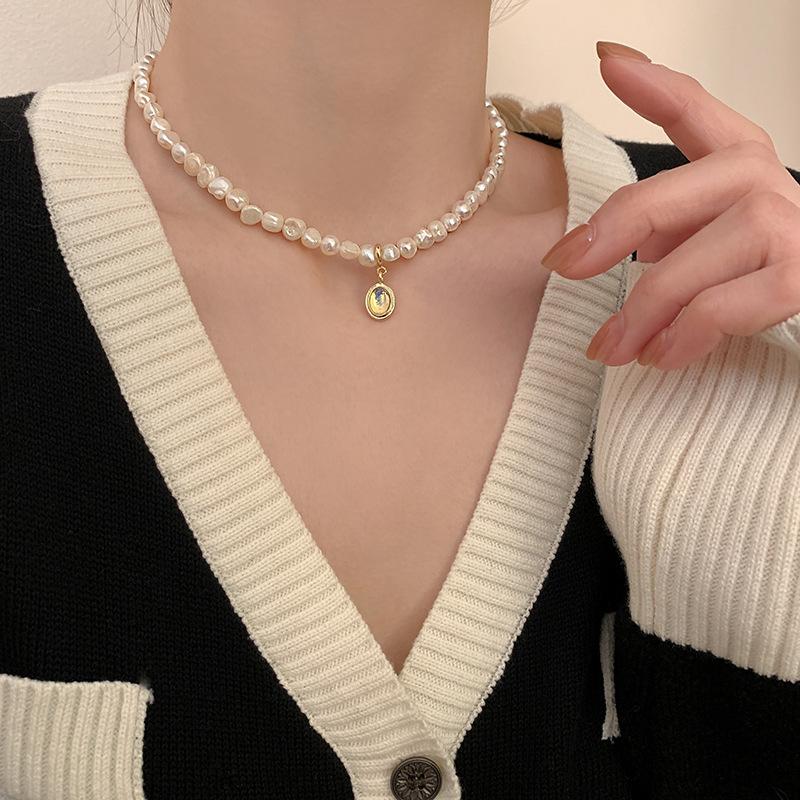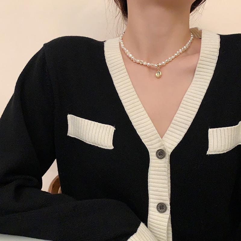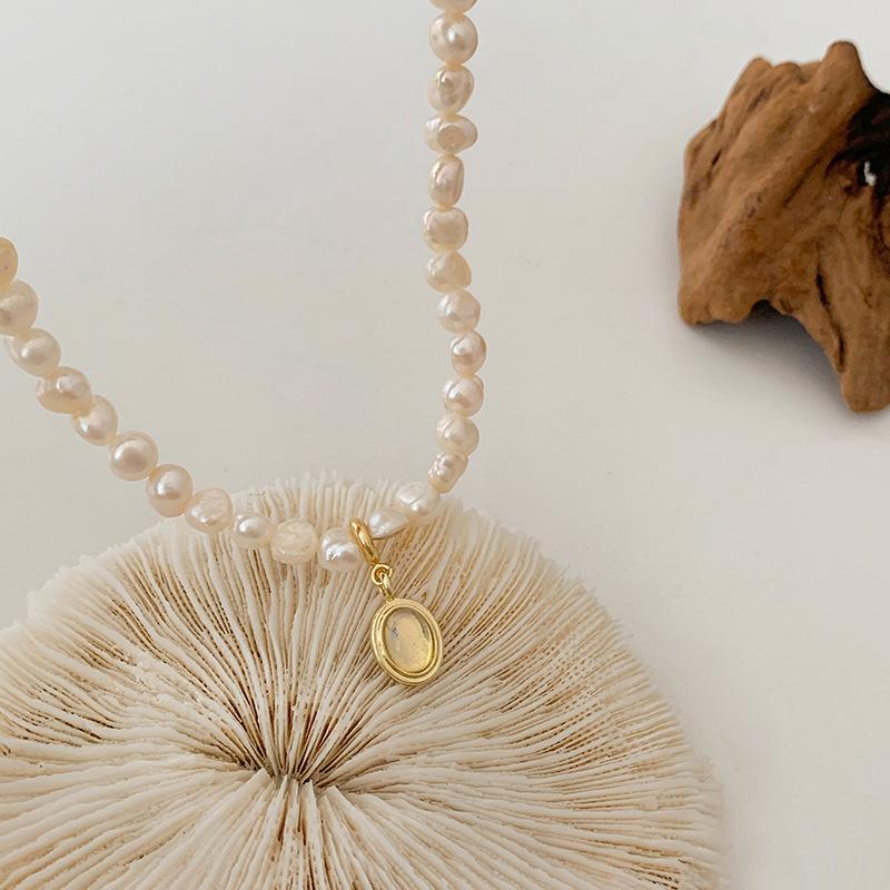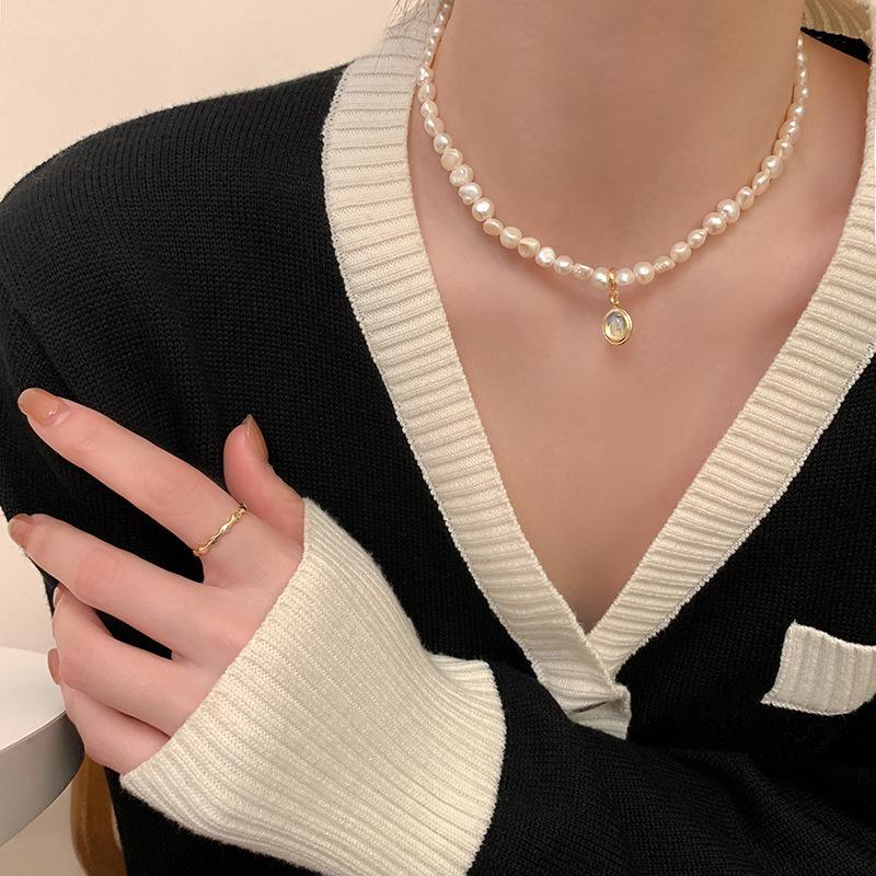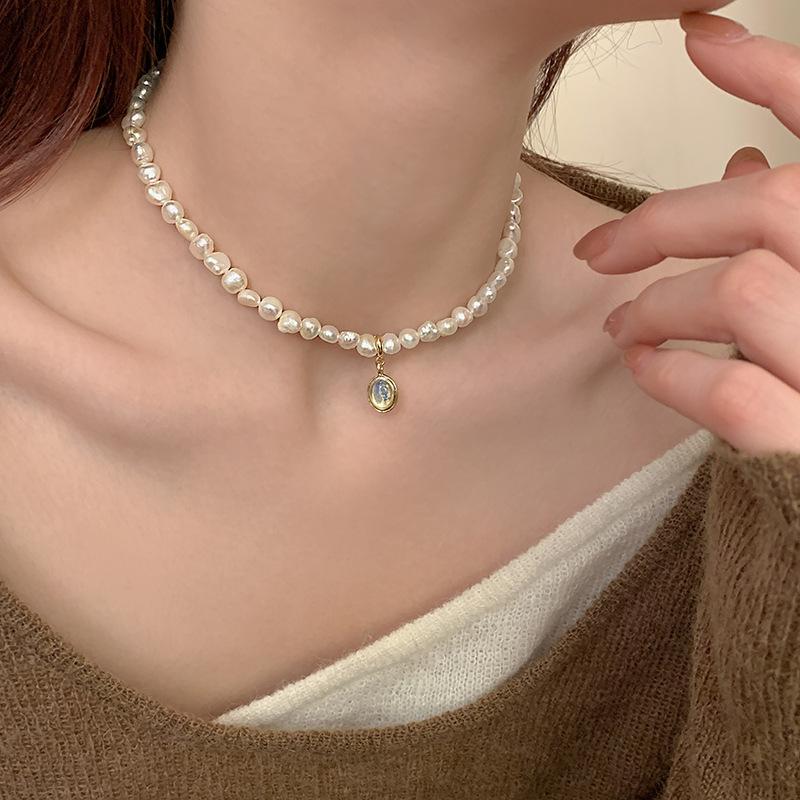 Collar con Colgante de Ópalo Ovalado de Perla de Agua Dulce Corea del Sur Diseño de Personalidad Sentido Cadena Clavicular Collar Elegante de Celebridad de Internet para Mujeres