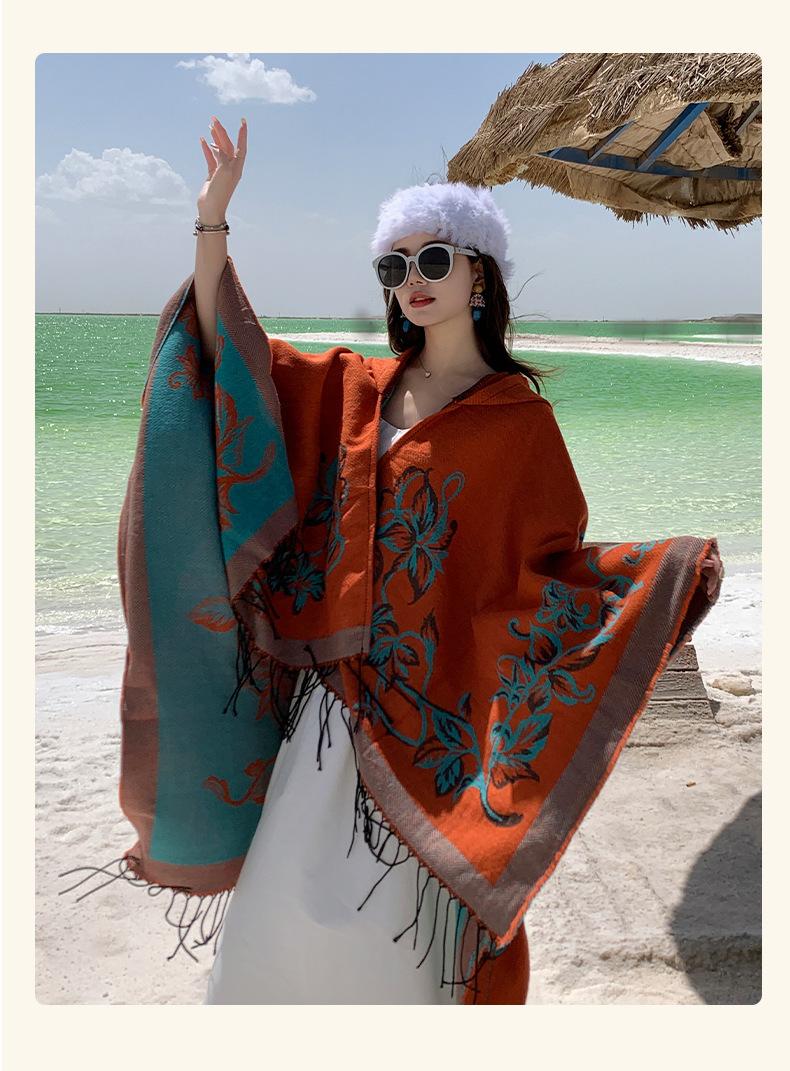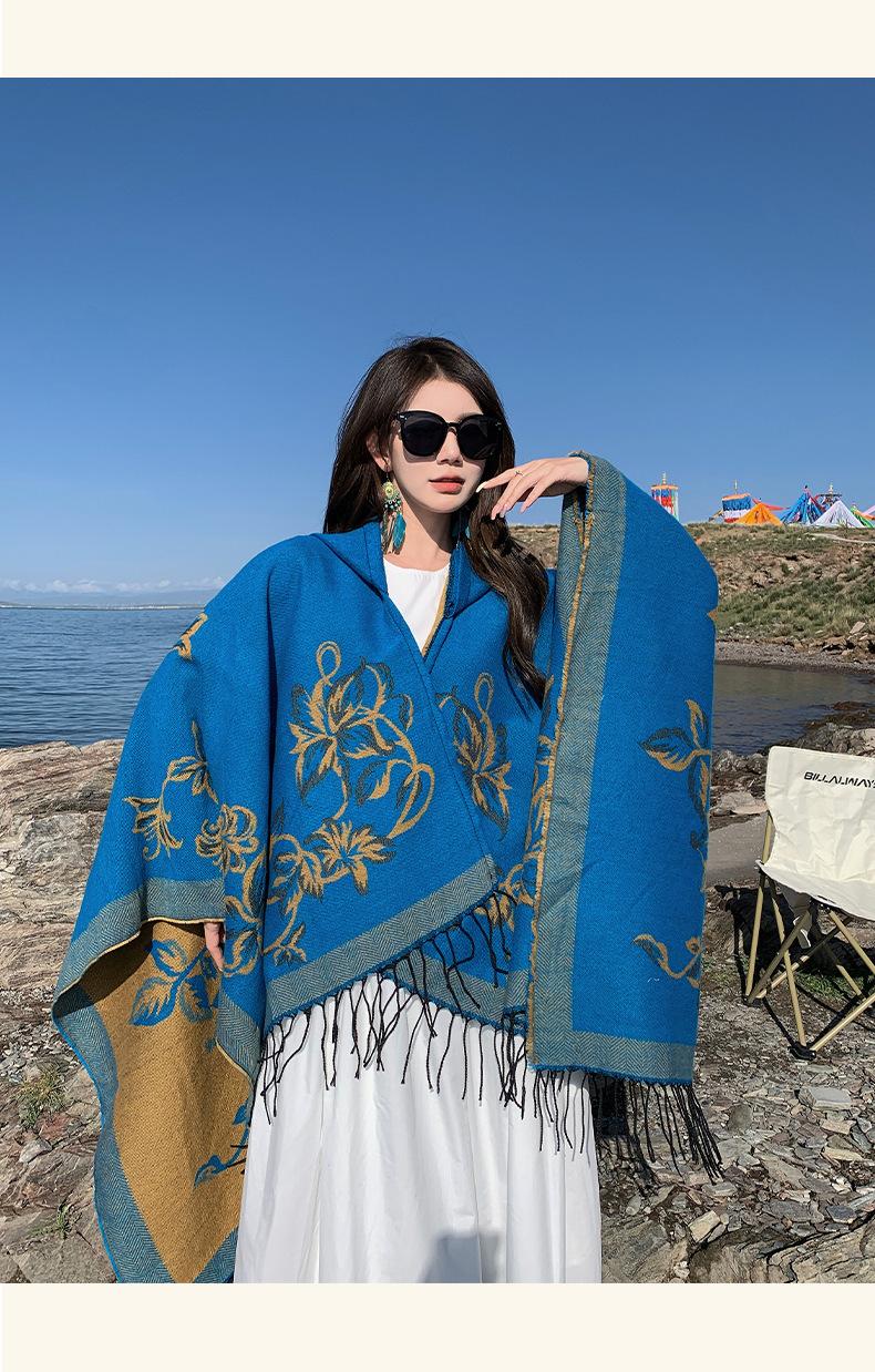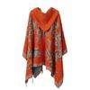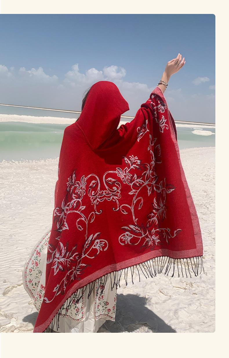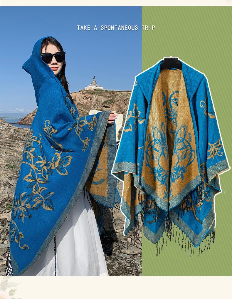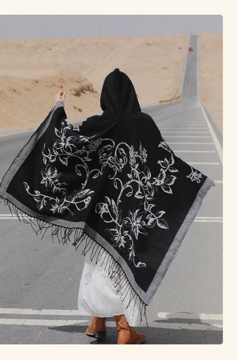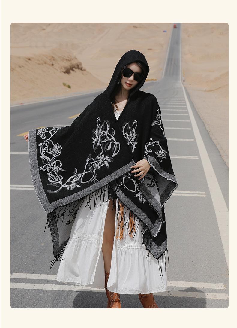 Capa dividida de estilo étnico con capucha y borlas, chal Yunnan Xizang para viaje, capa exterior cálida para fotografía a doble cara