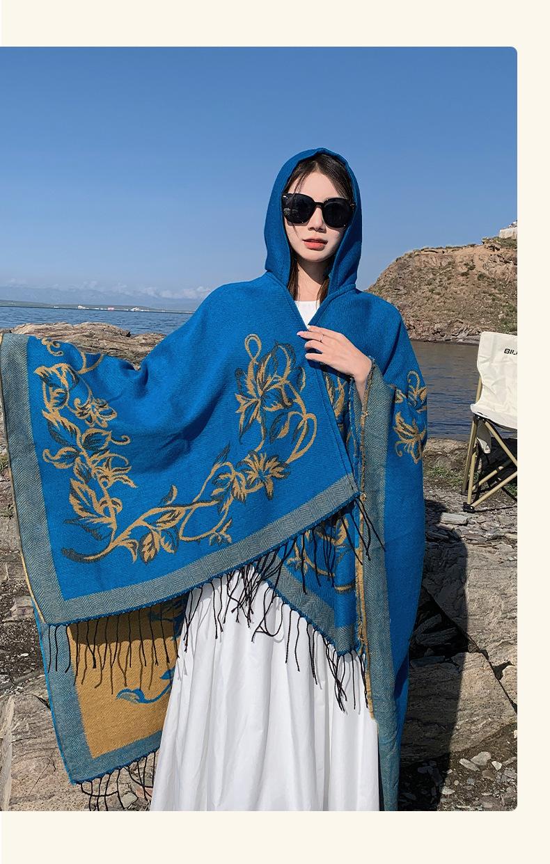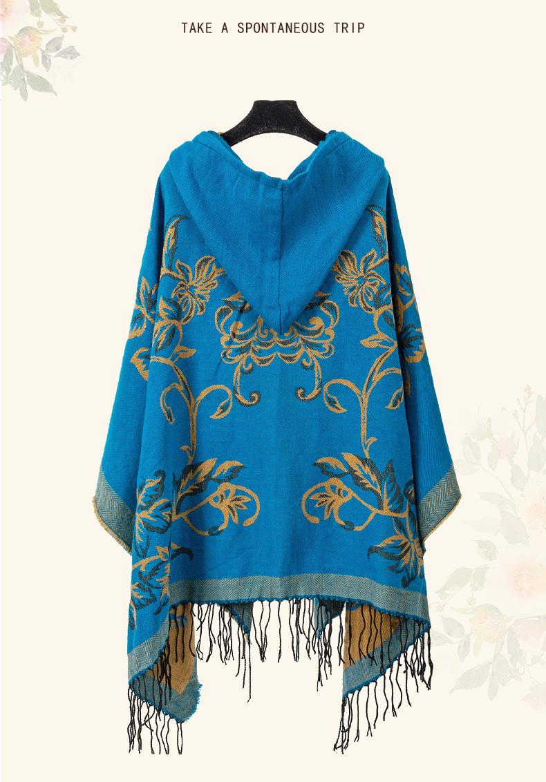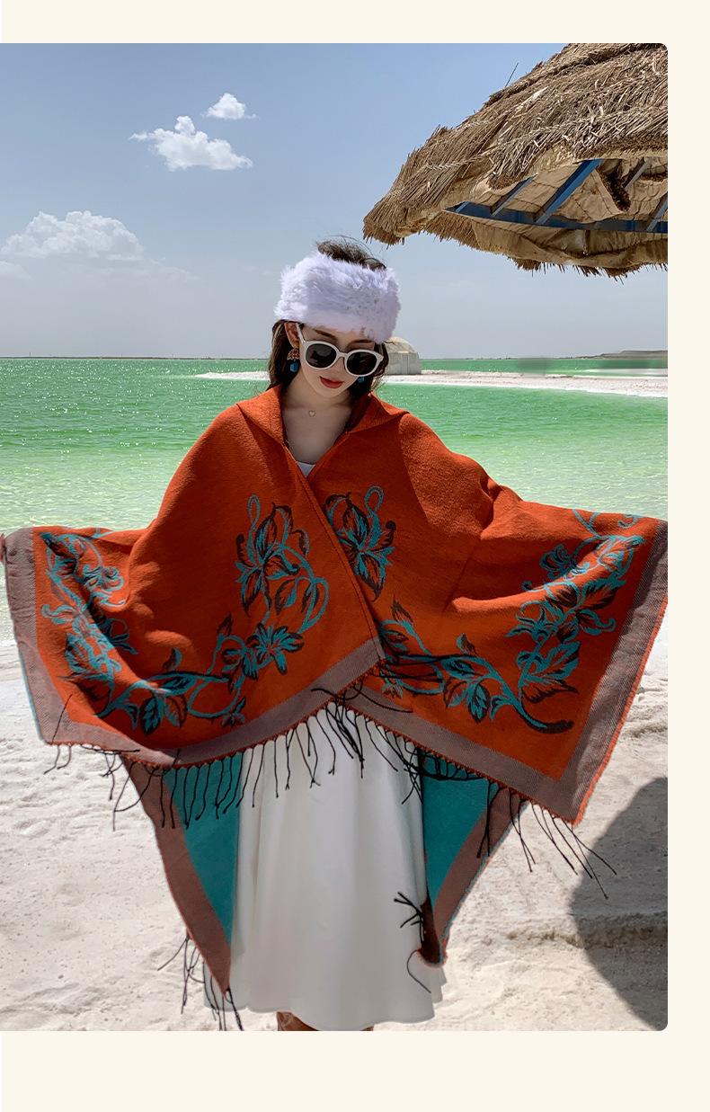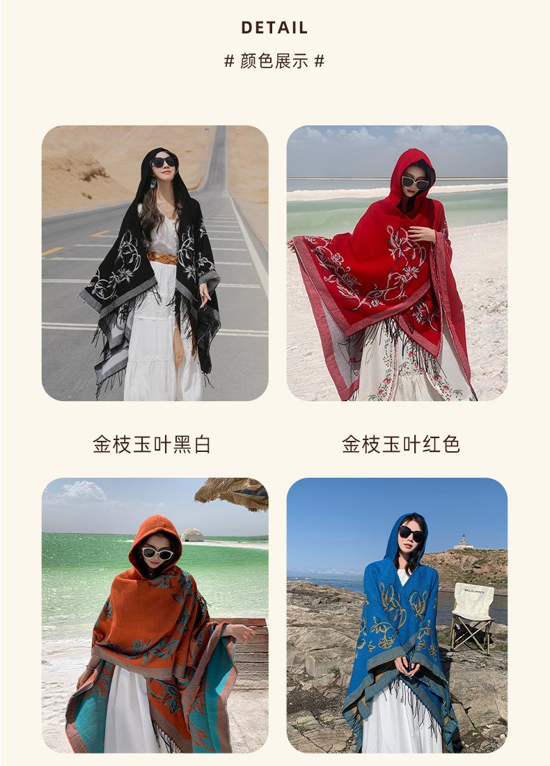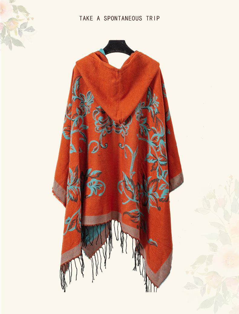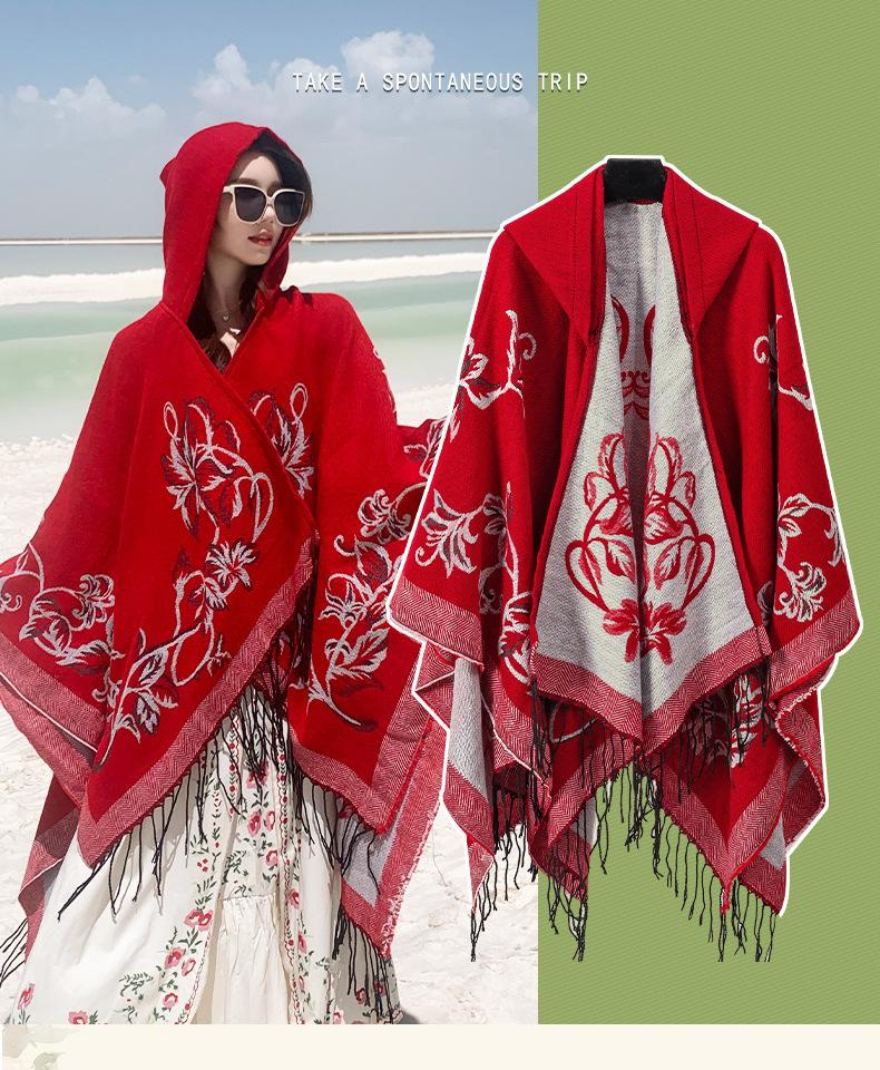 Capa dividida de estilo étnico con capucha y borlas, chal Yunnan Xizang para viaje, capa exterior cálida para fotografía a doble cara