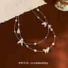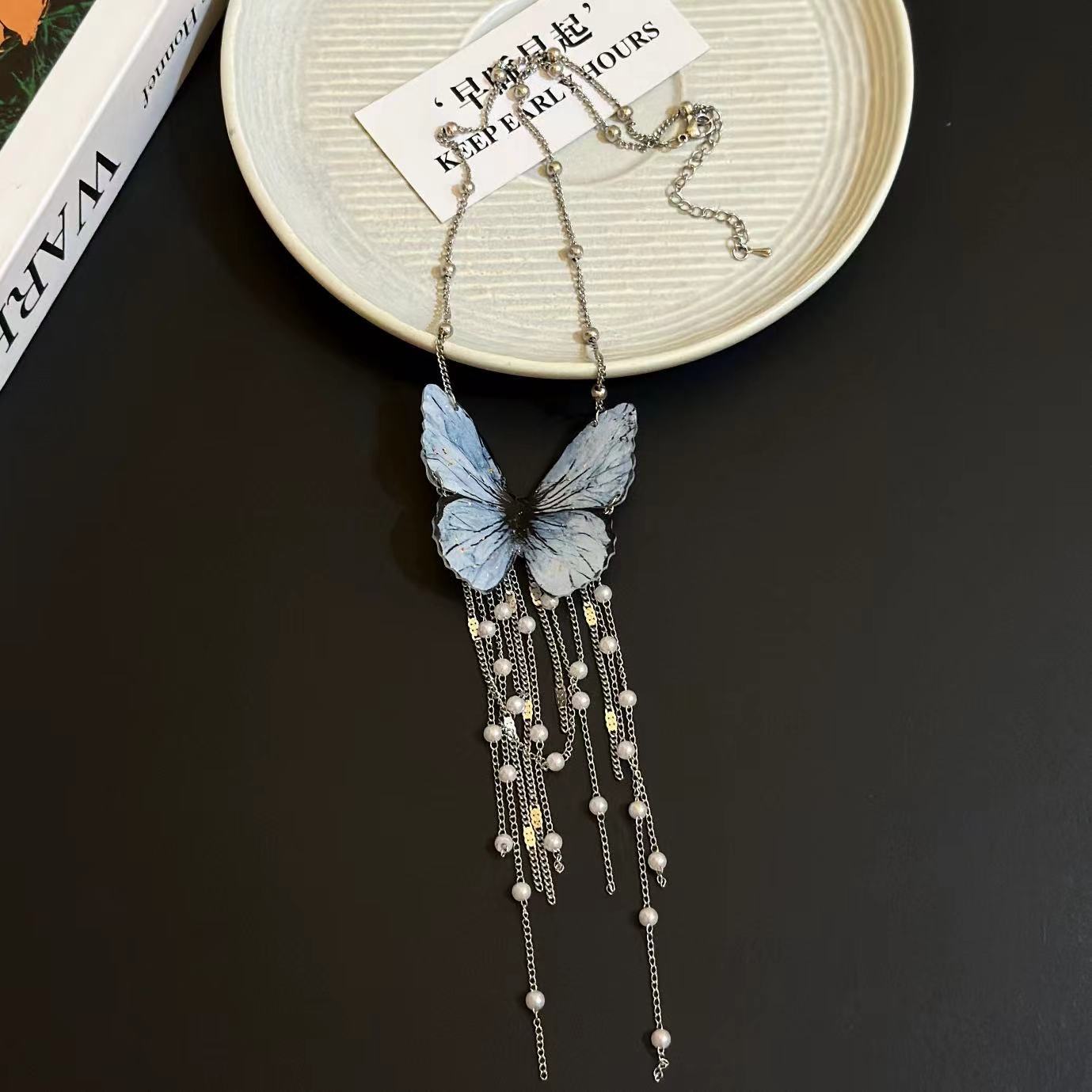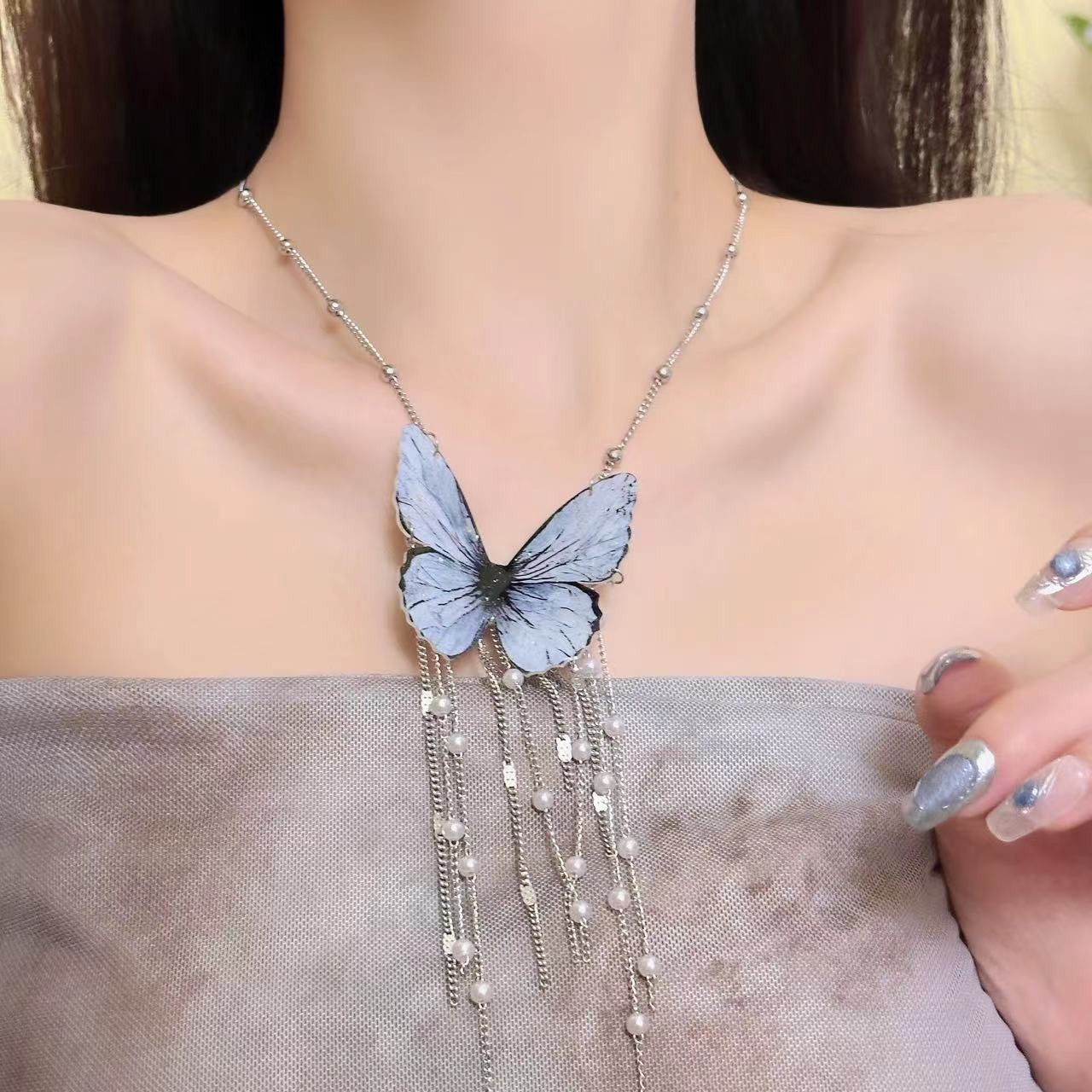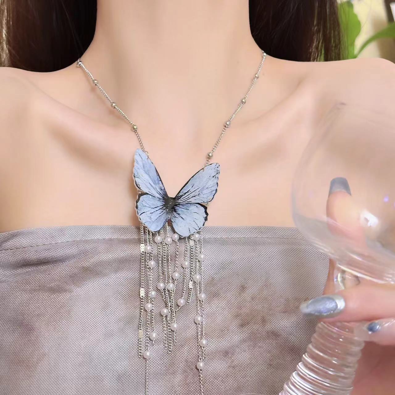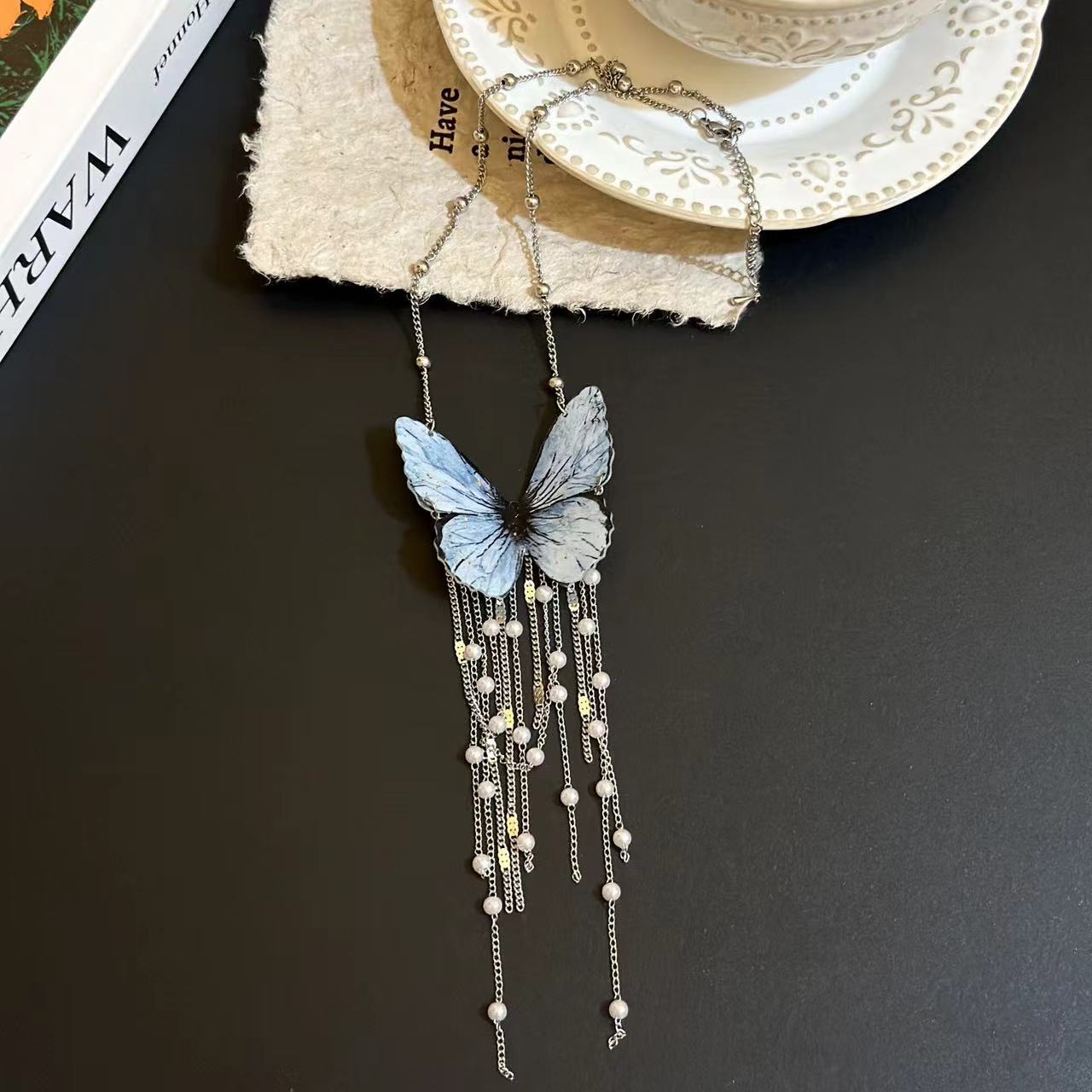 Collar con borlas de perlas y mariposa azul de súper hada para mujer, cadena de clavícula con temperamento de nicho, venta al por mayor