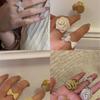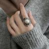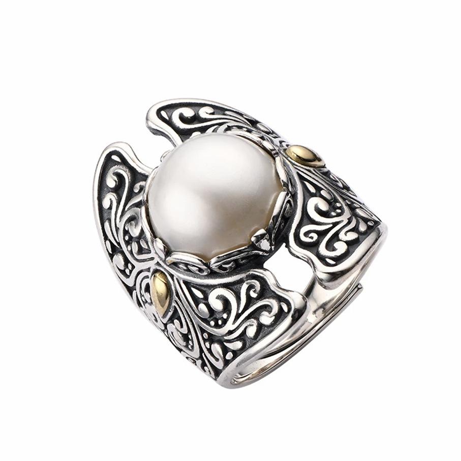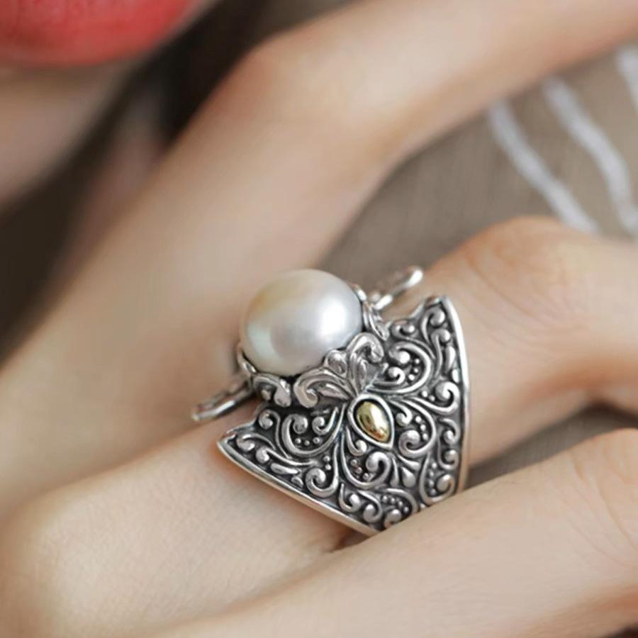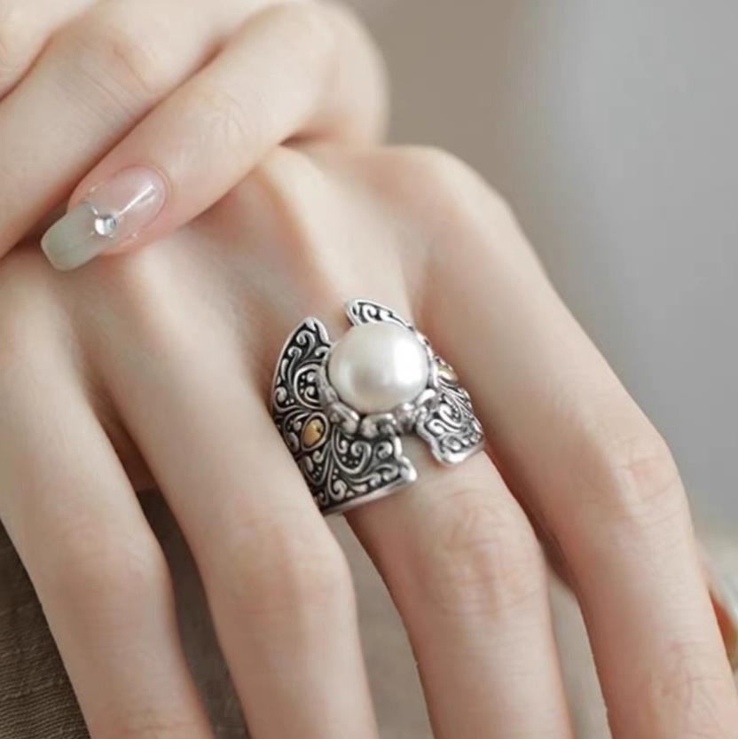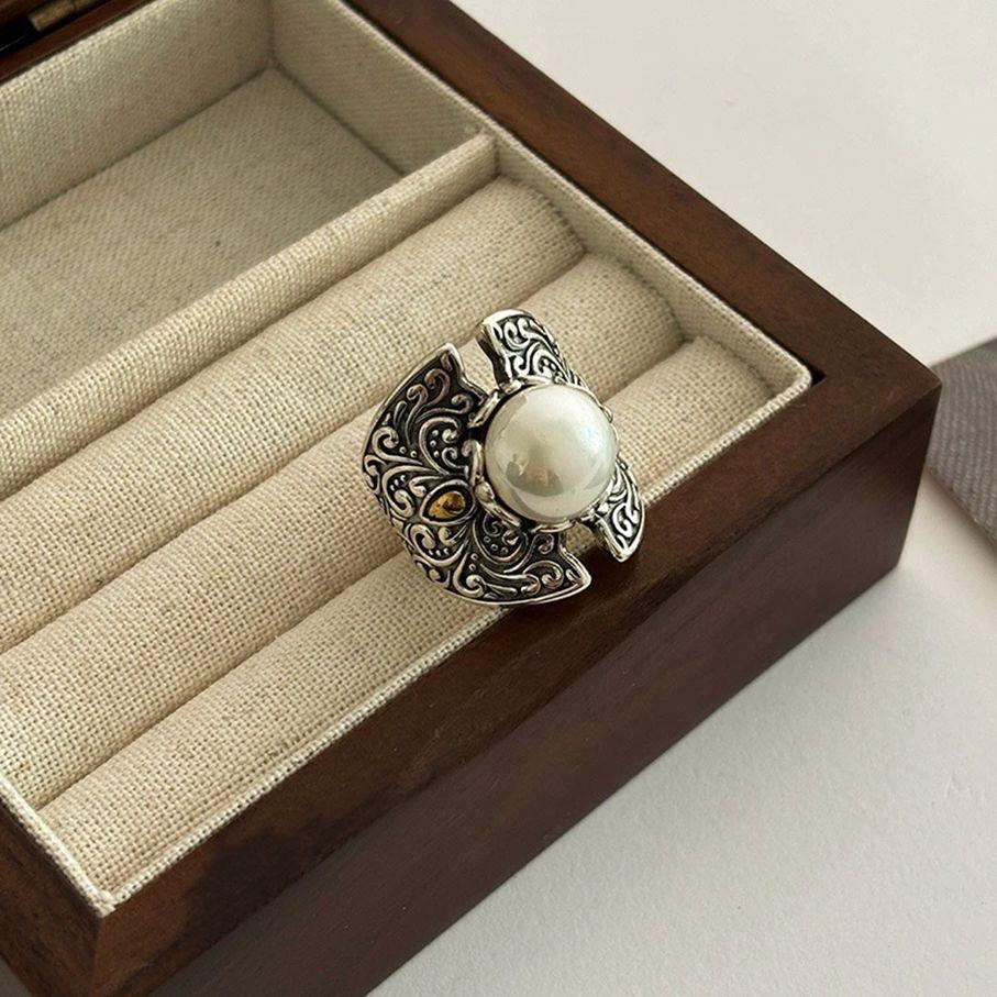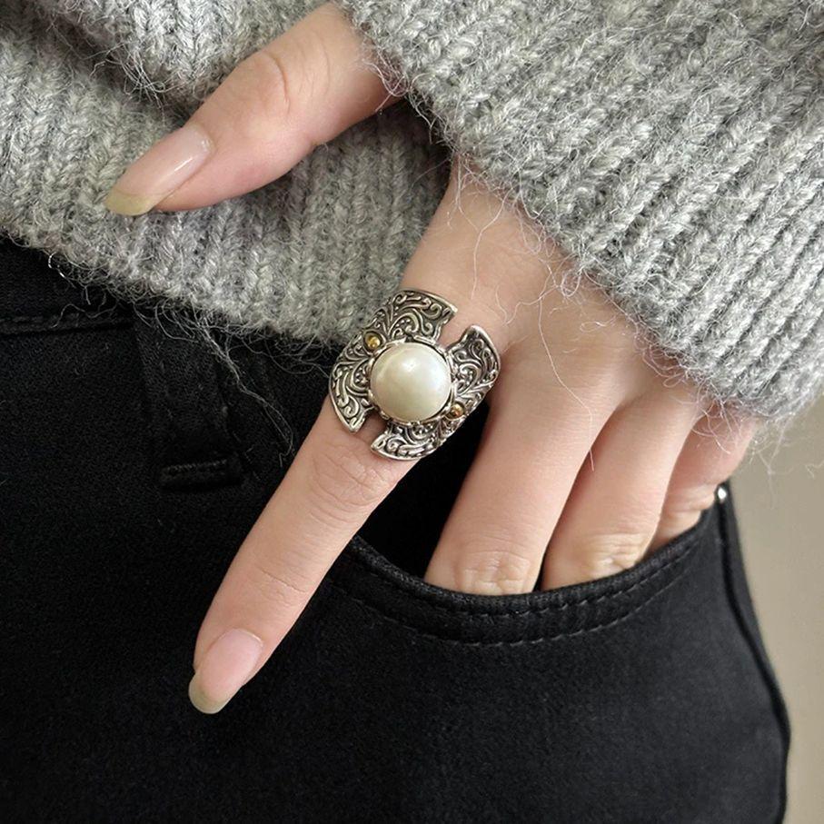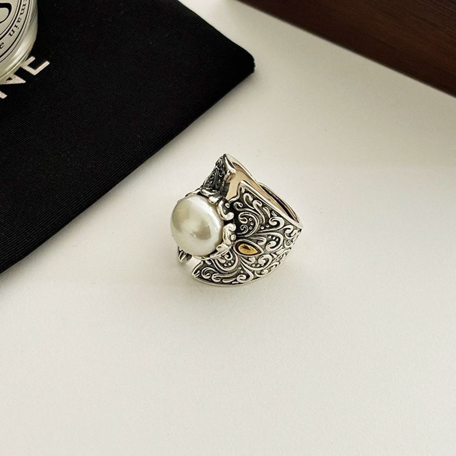 Anillo vintage con diseño de hierba Tang y anaglifo para mujer, con perla de imitación, estilo industrial, personalidad, diseño de nicho, estilo frío, abierto.