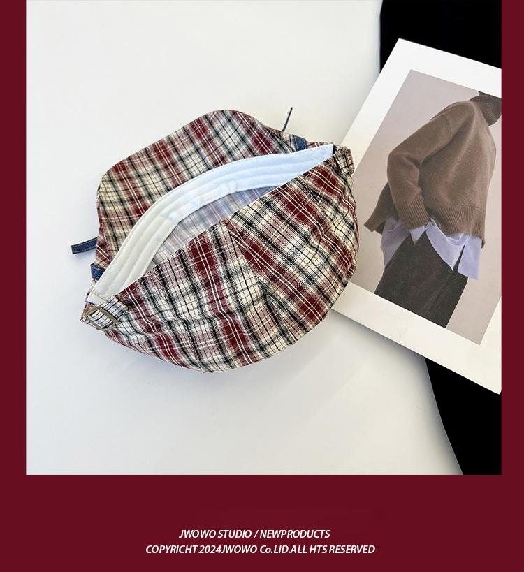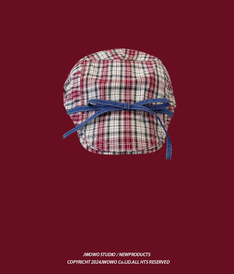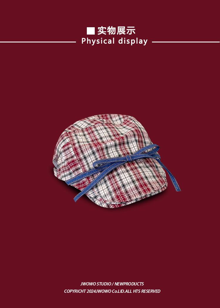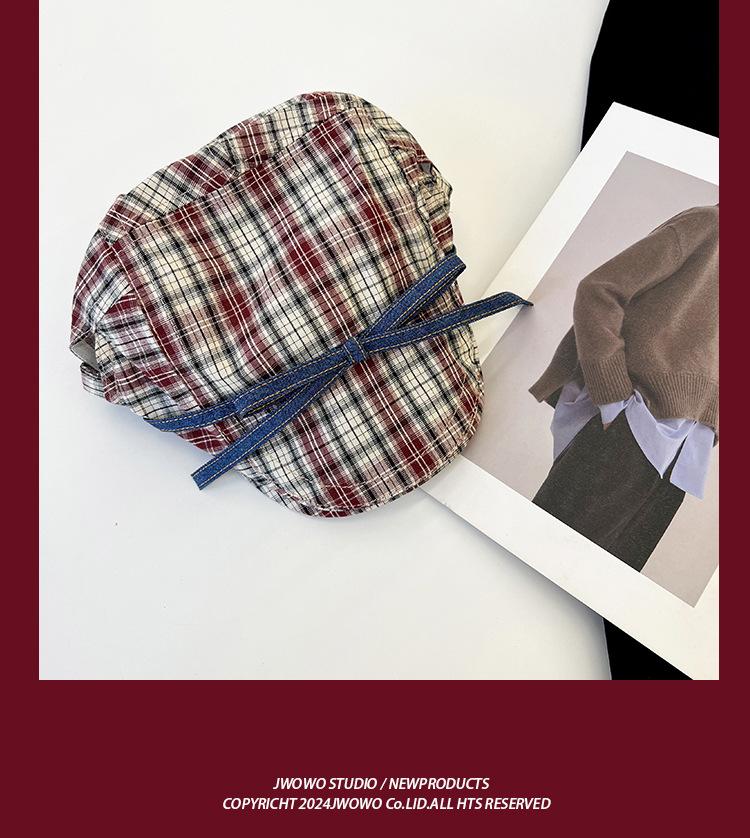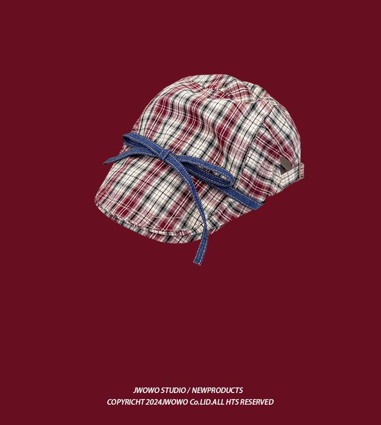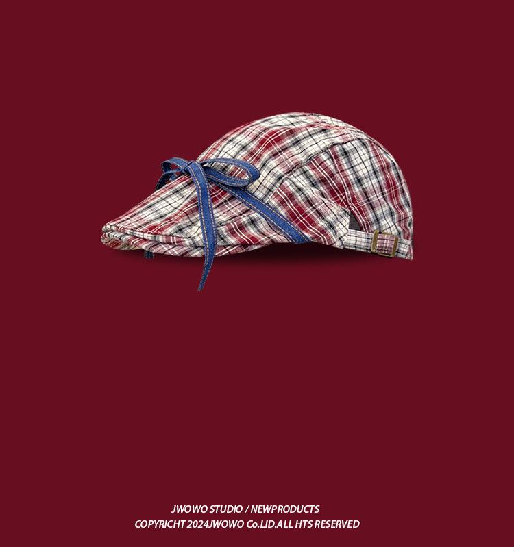 Sombrero de pintor vintage con lazo de mezclilla, rojo y negro, a cuadros, para mujer, primavera y verano, informal, combinable, 2024