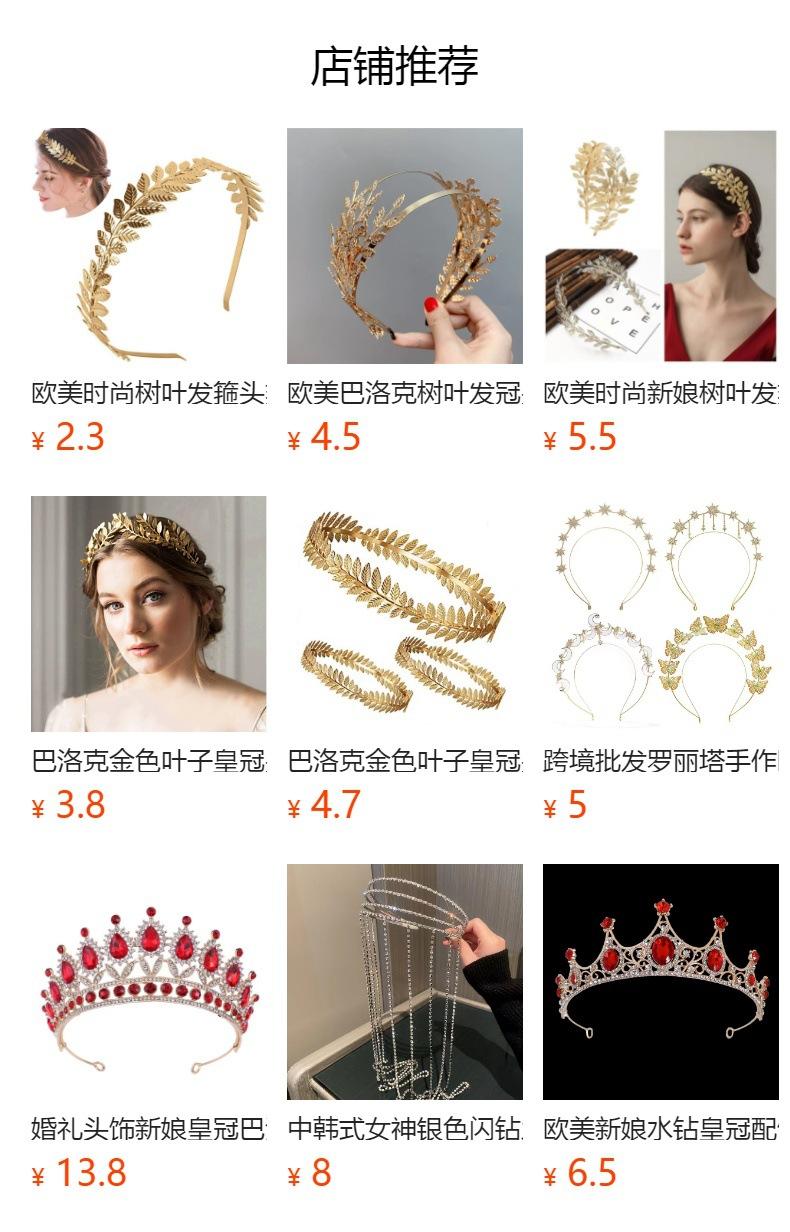 | |  | | Tiara barroca con corona de hojas doradas, tiara redonda de hojas de metal, tiara de hojas doradas de comercio exterior, corona para el cabello RMB4.7 15469 unidades vendidas en el mes Realizar pedido recibiendo cupón | | |  | | Diadema de hojas de moda europea y americana, tocado de diosa de metal, accesorios para el cabello, diadema transfronteriza de hojas doradas de Amazon RMB2.2 205517 unidades vendidas en el mes Realizar pedido recibiendo cupón | | | |