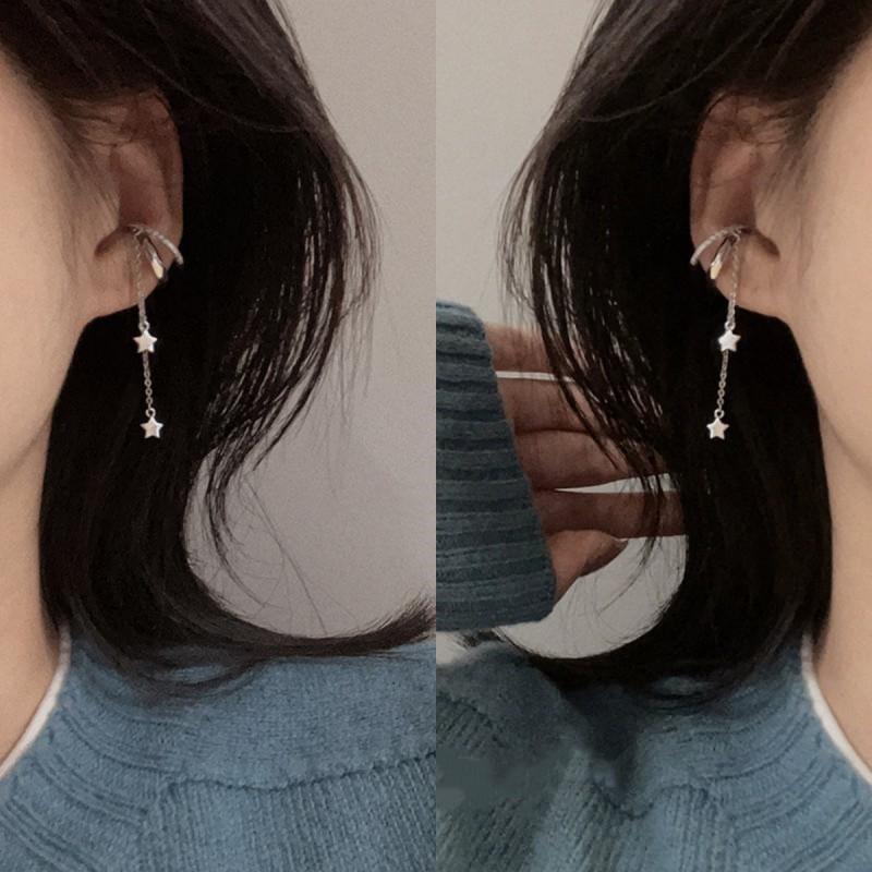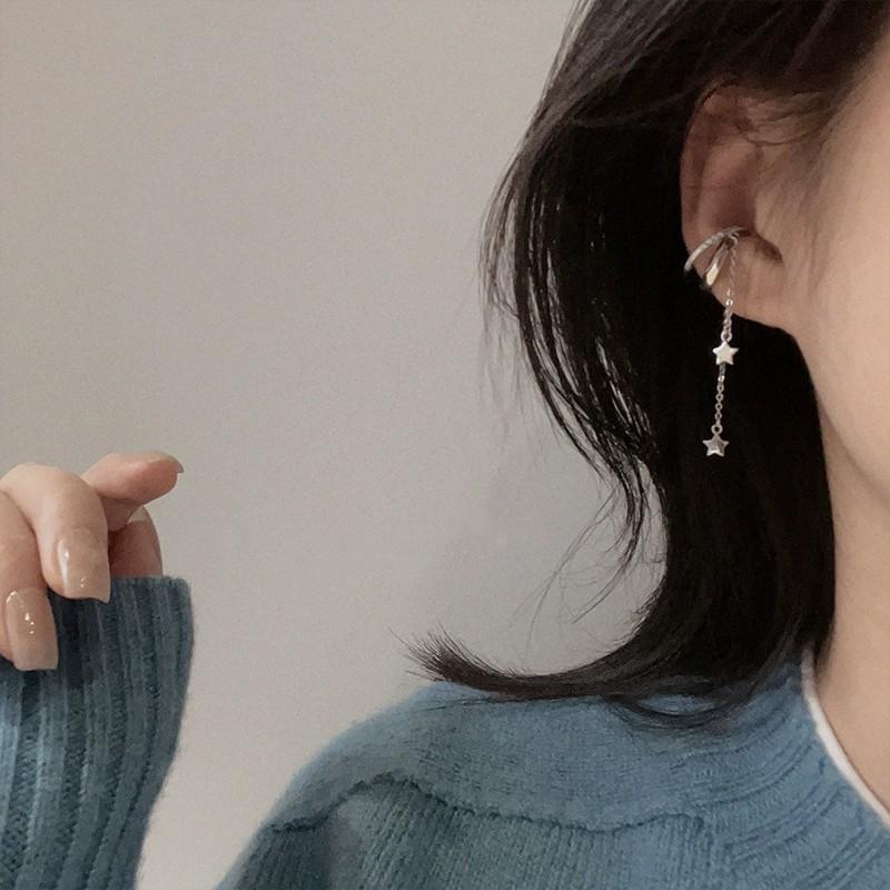 Pendientes largos con borlas de estrella plateada, diseño de nicho, con clip para oreja de viento frío, para mujer