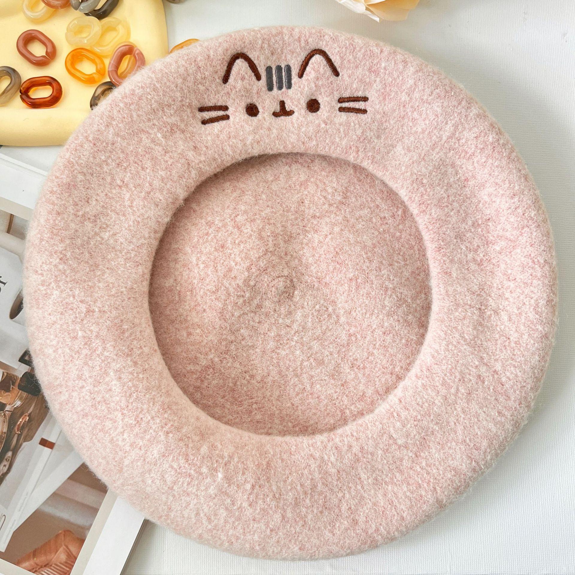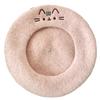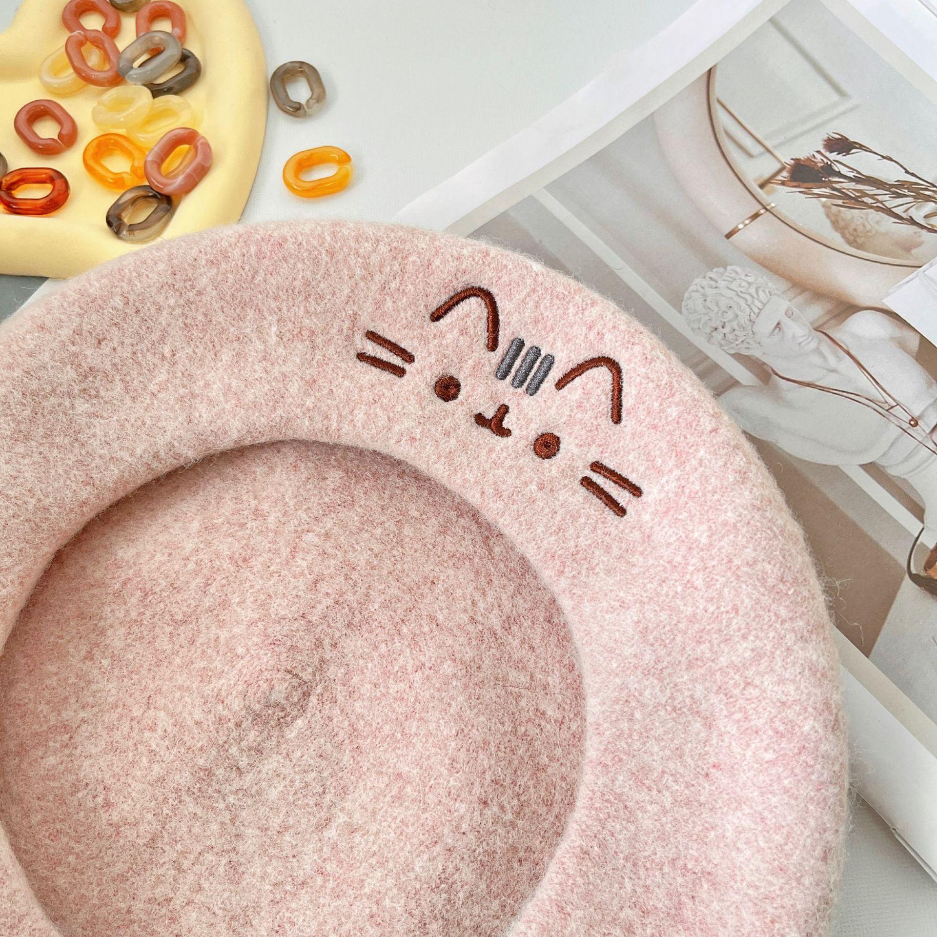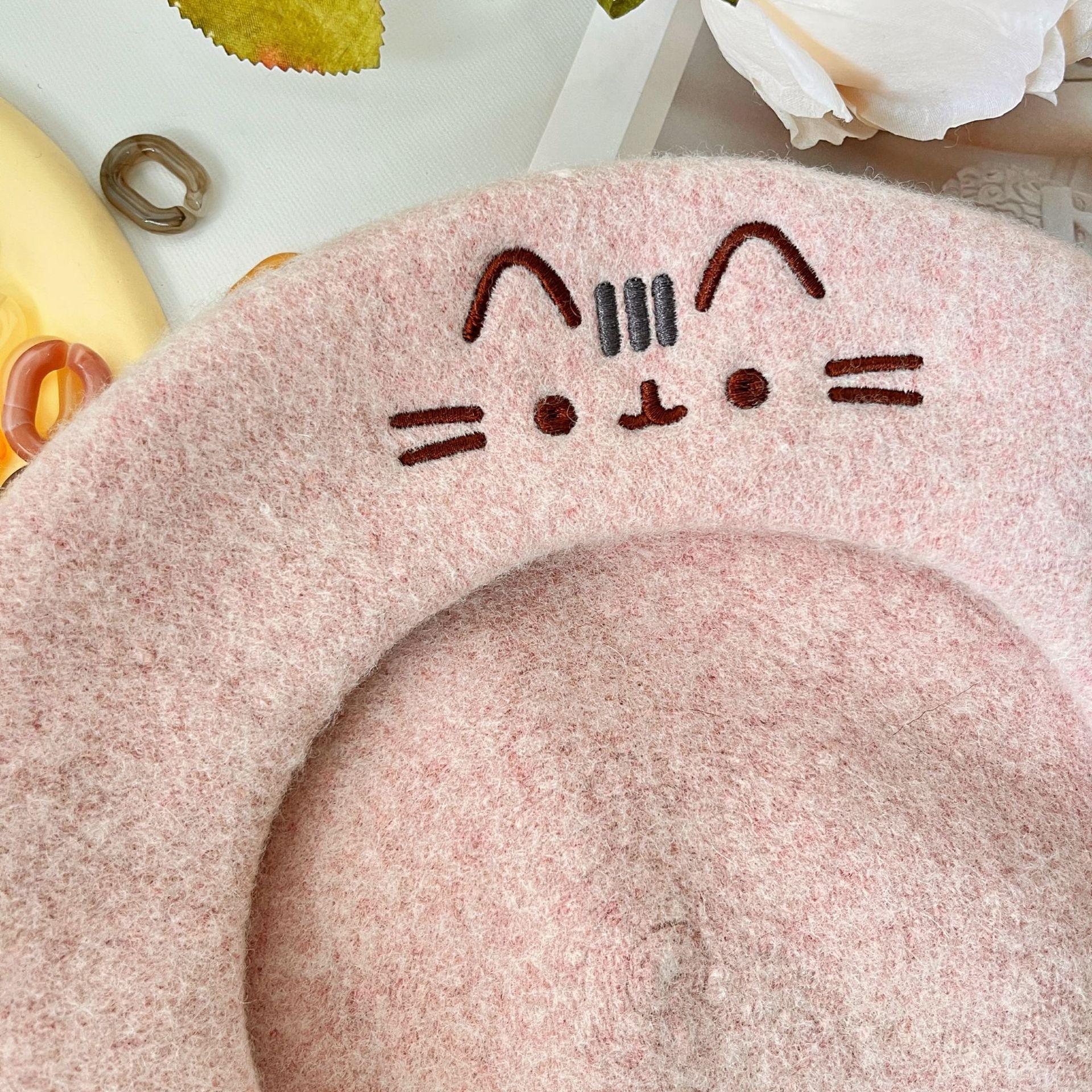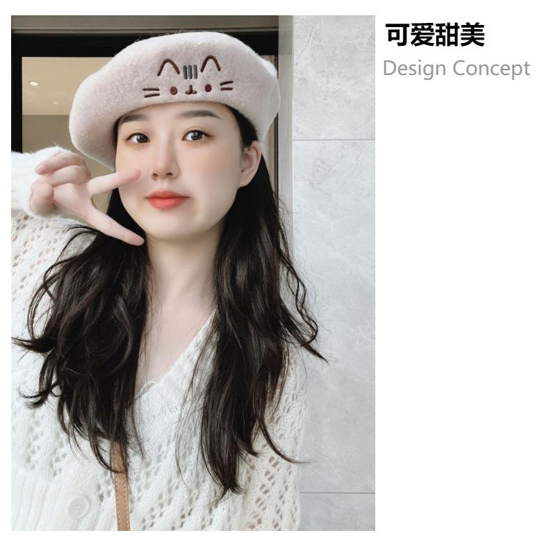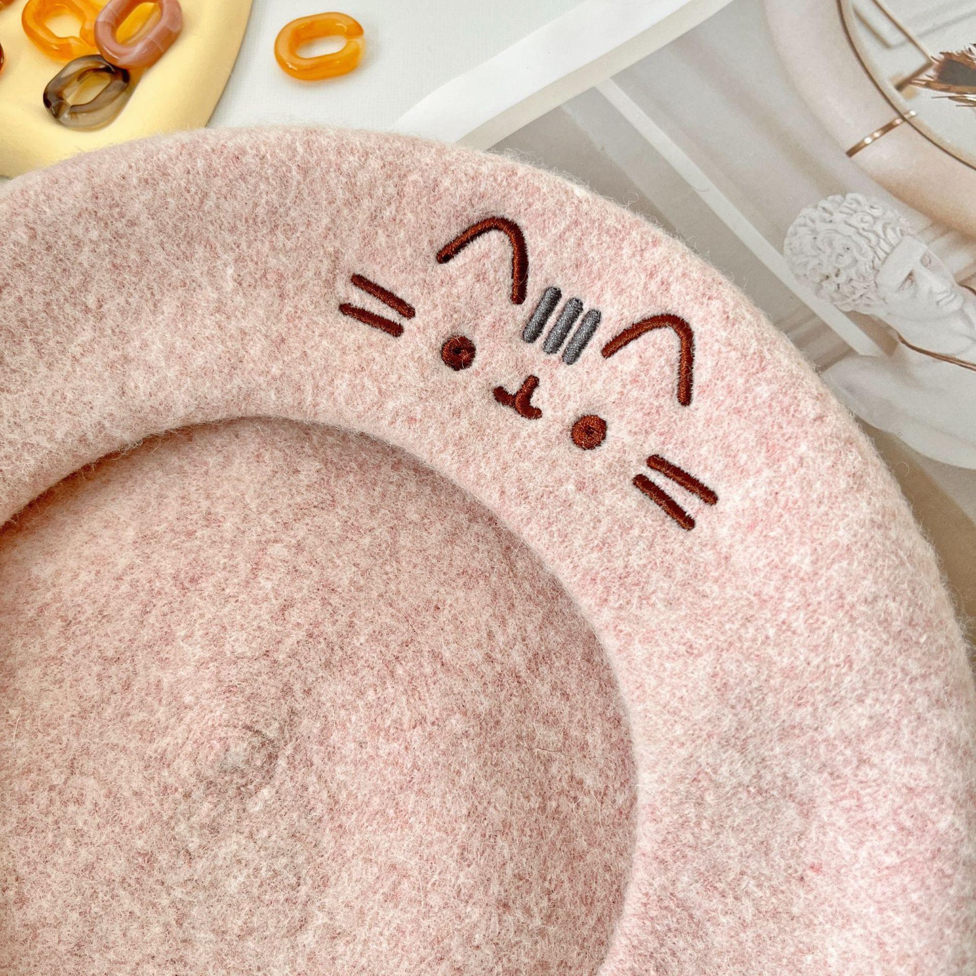 Otoño e Invierno nuevo estilo japonés lindo cálido boina de pintor de lana versátil dulce albaricoque gato bordado boina de lana