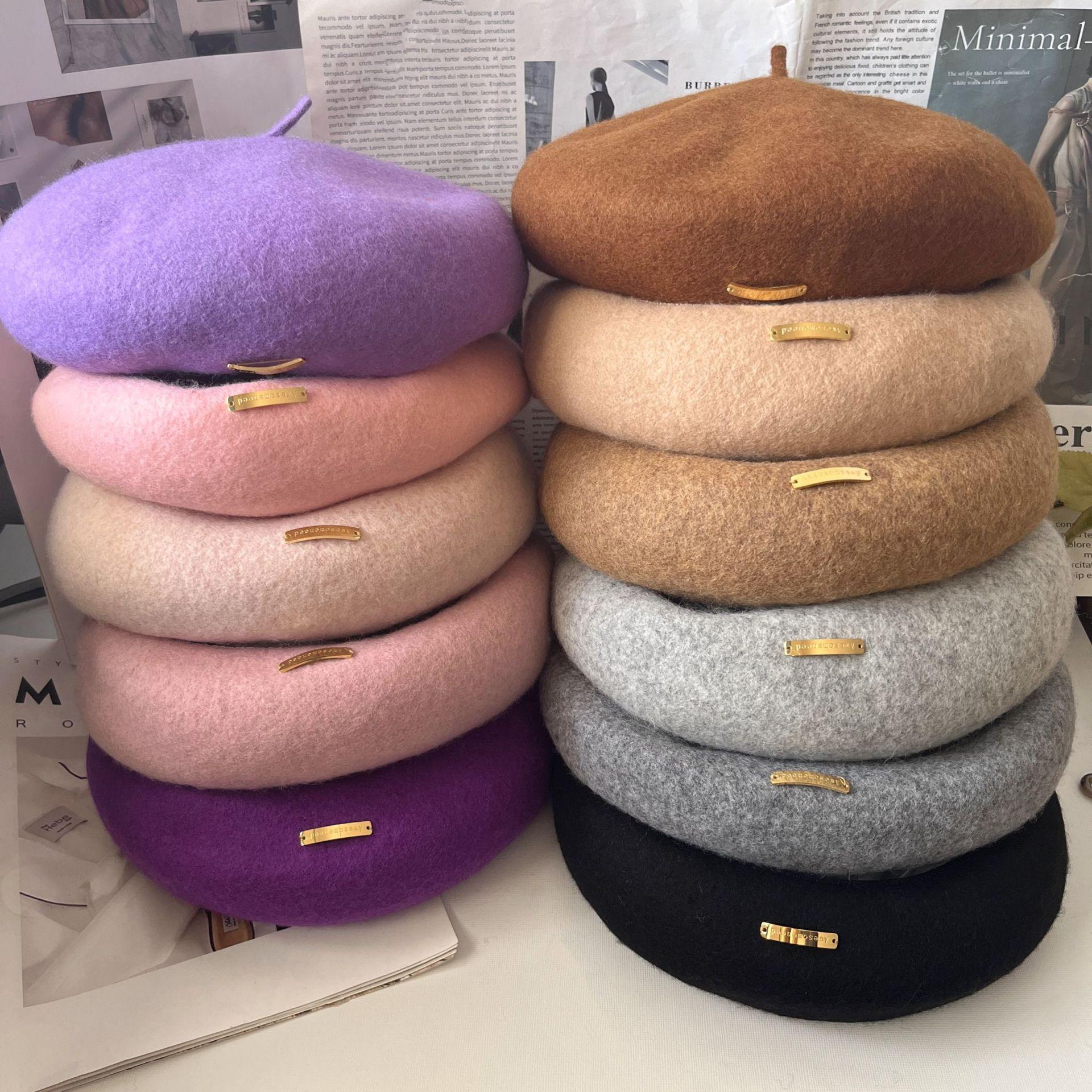 Boina de lana tridimensional decorativa de metal para mujer, gorro de pintor de punto de estilo coreano retro, combina con todo, para otoño e invierno.