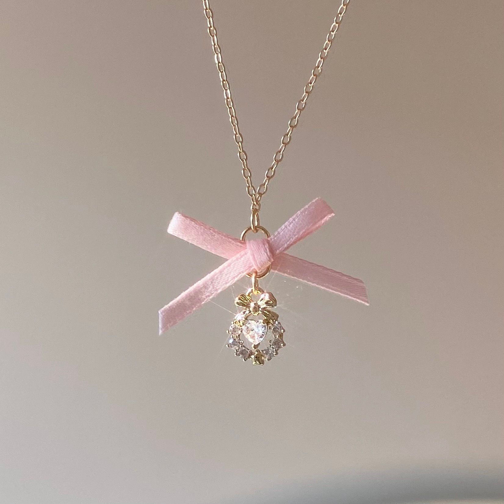 Collar de Cristal Lazo Rosa Amor 2024 Nuevo Diseño Nicho Collar Estilo Chica Lujo Ligero
