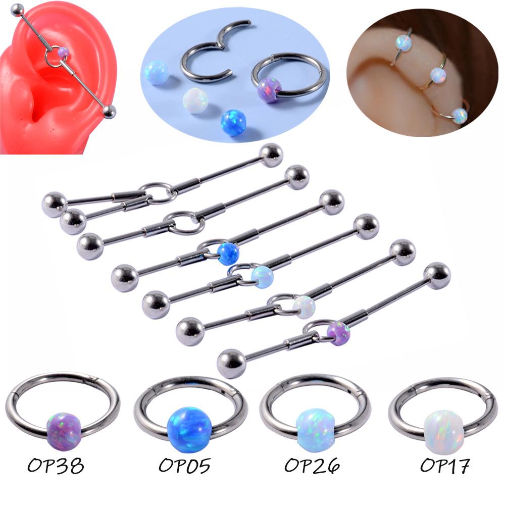 Nuevos pendientes de barra industriales transfronterizos con doble orificio para la oreja, pendientes de puente de acero inoxidable con ópalo, anillo de nariz de ópalo, anillo para el hueso de la oreja