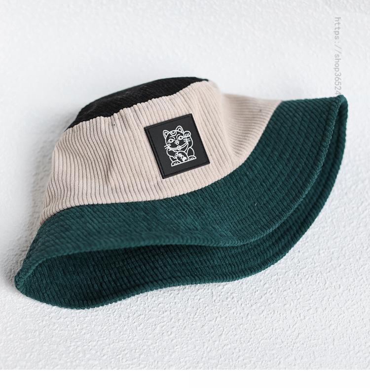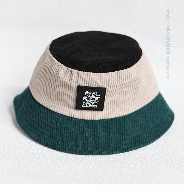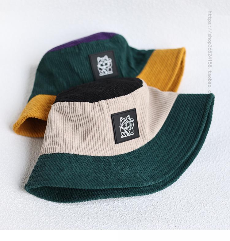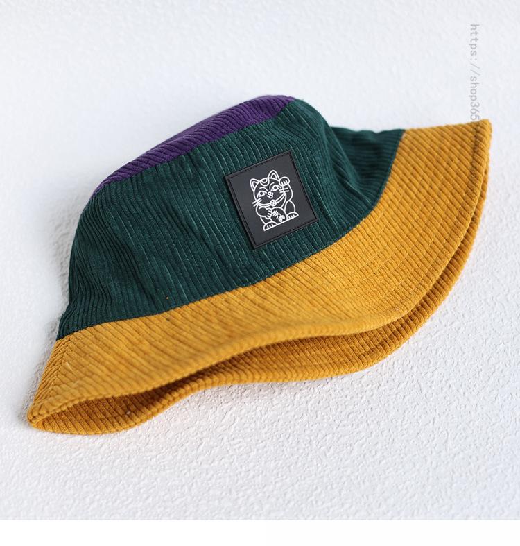 Fisherman hat corduroy color block lucky cat yellow eaves, Fisherman hat corduroy color-blocked lucky cat with...