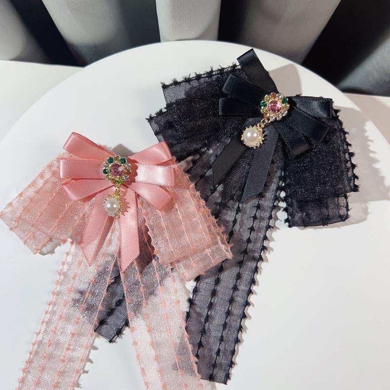 Blusa francesa con cuello retro de tul y perlas, lazo de aleación, joyería de moda al por mayor