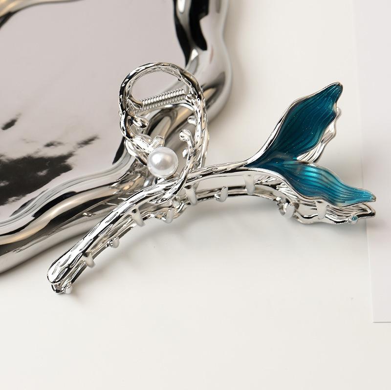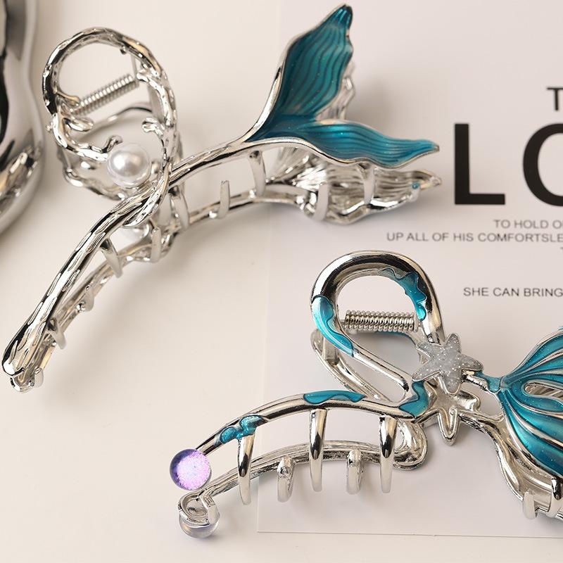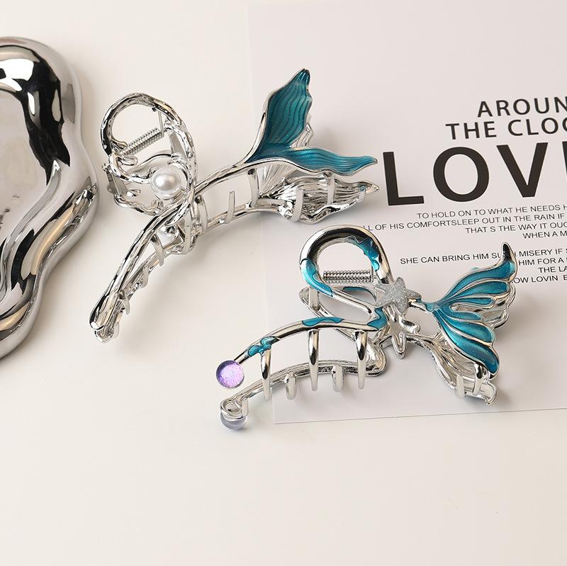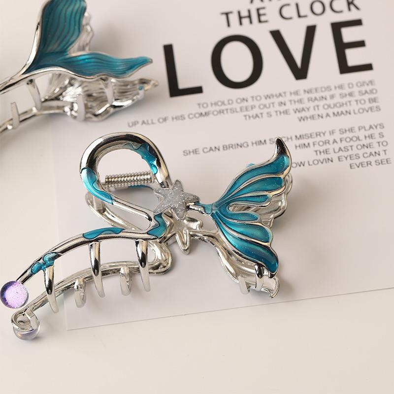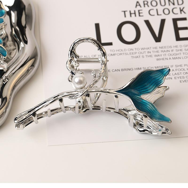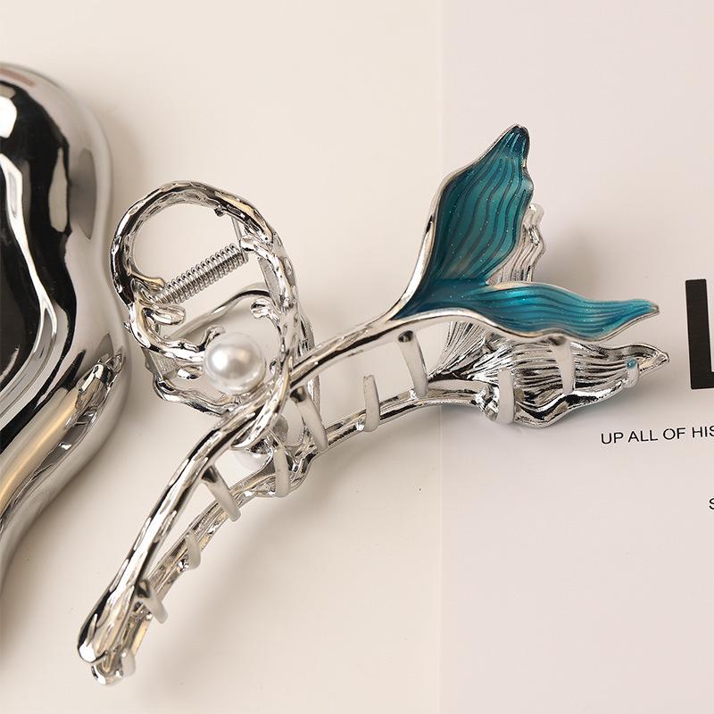 Nuevo Clip Grande de Pinza Cola de Pez Azul Cabeza de Metal Plateado Clip de Tiburón Pinza para Cabello Cuenta Luminosa Accesorios para el Cabello de Mujer