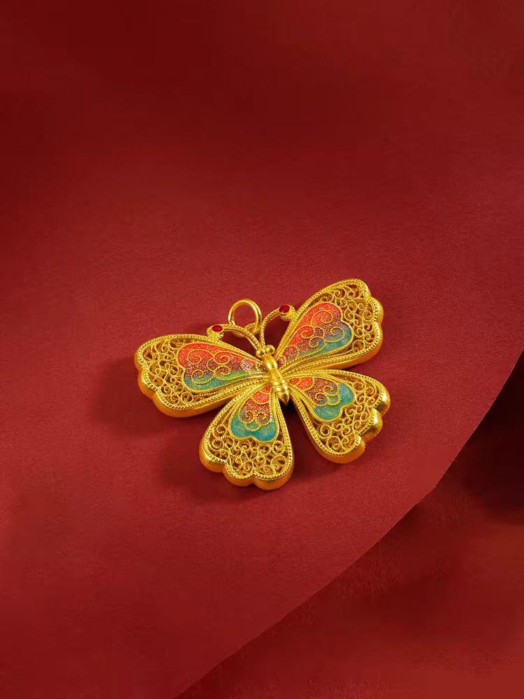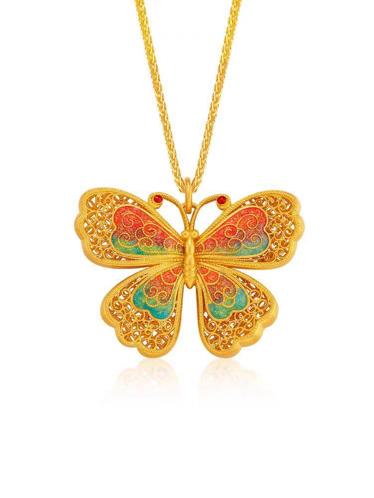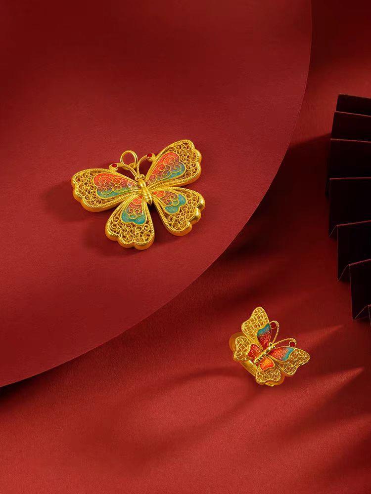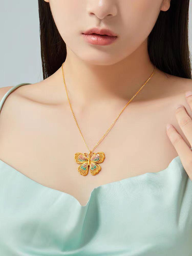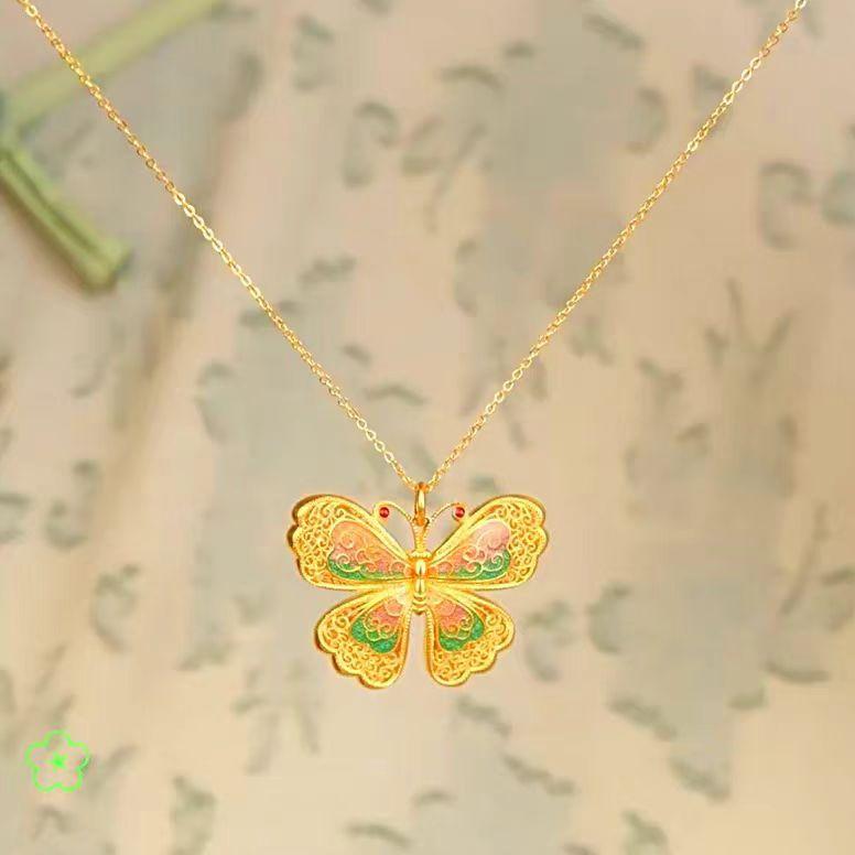Conjunto de colgante de anillo con mariposa de esmalte de filigrana, color dorado, con método antiguo de marea nacional, serie de mariposas huecas, collar colgante