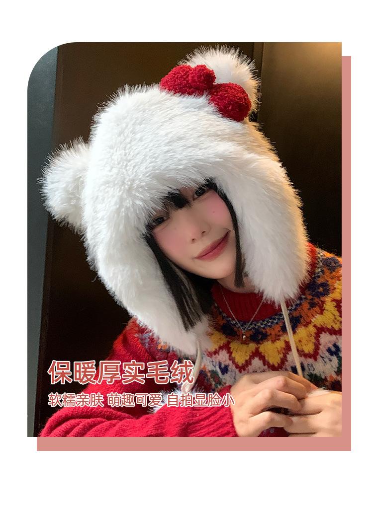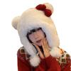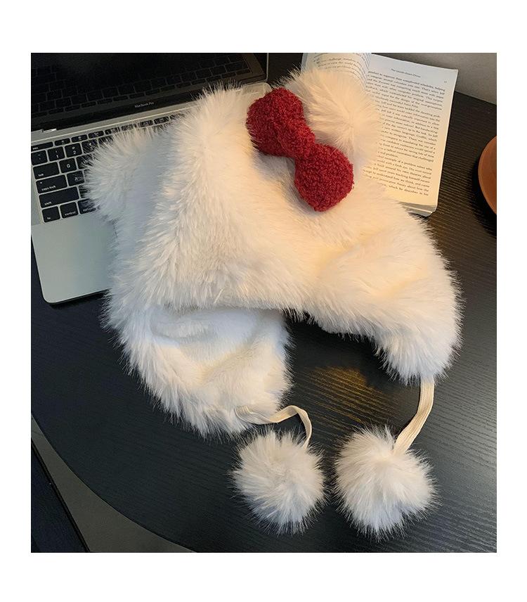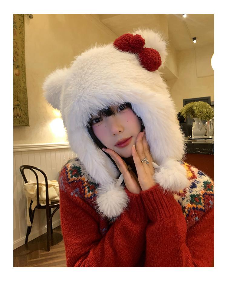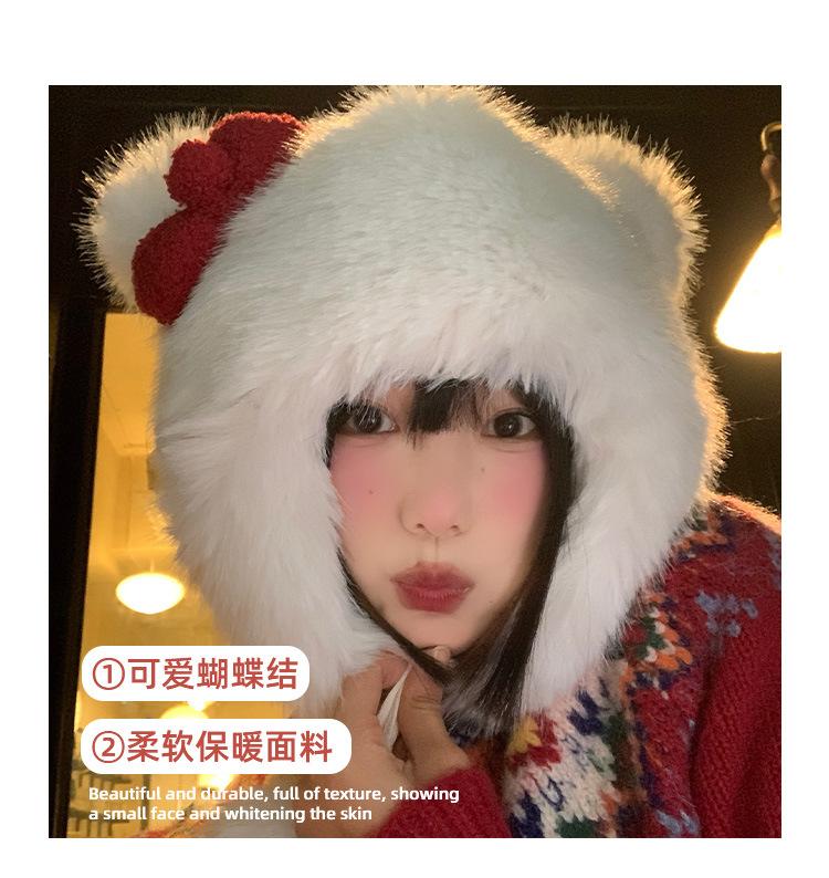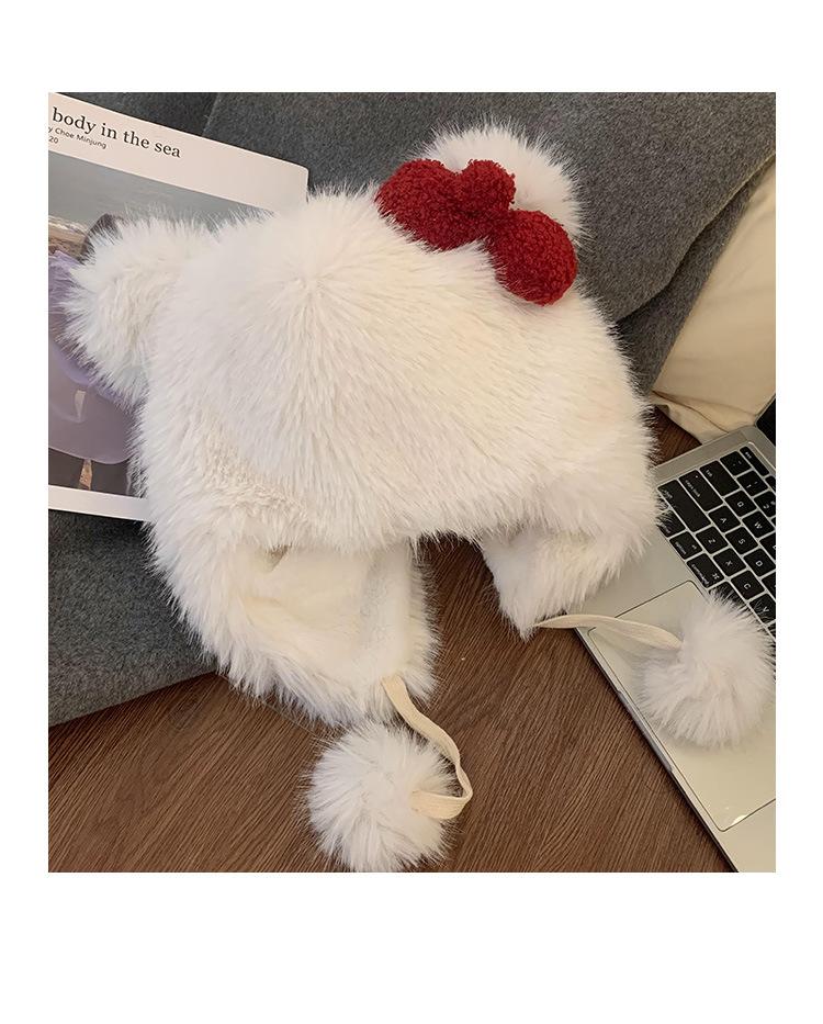 Lindo gorro de felpa con lazo para mujer, gorro de invierno peludo KT con protección para los oídos, gorro Lei Feng cálido, grueso y resistente al frío, gorro blanco