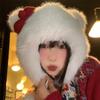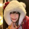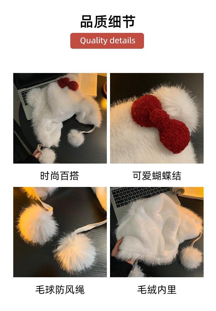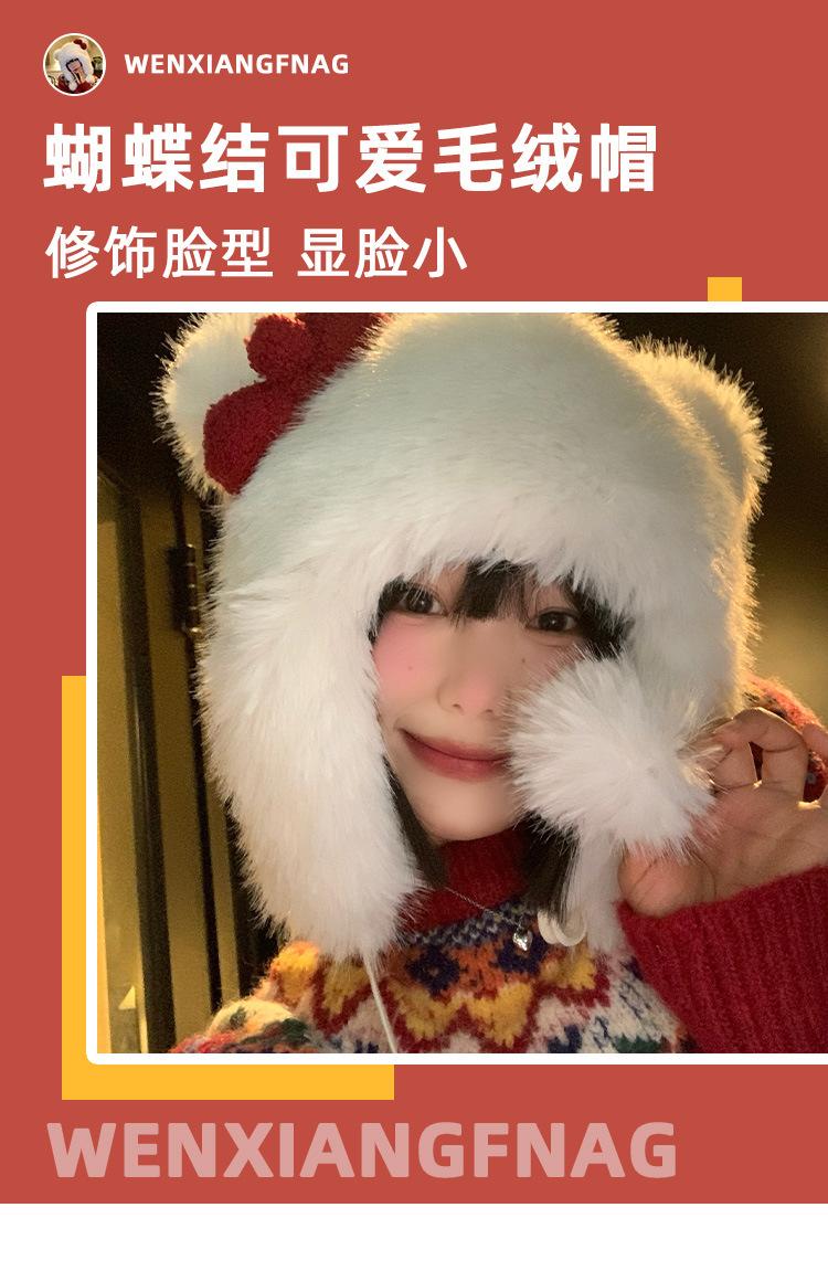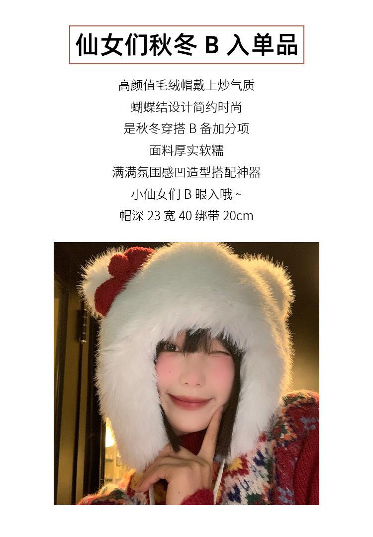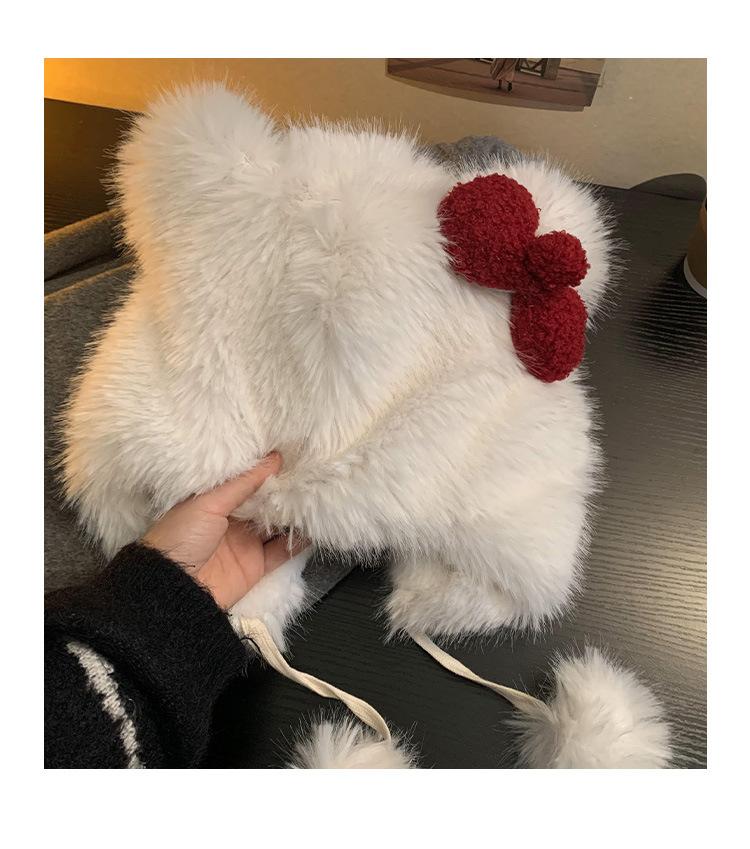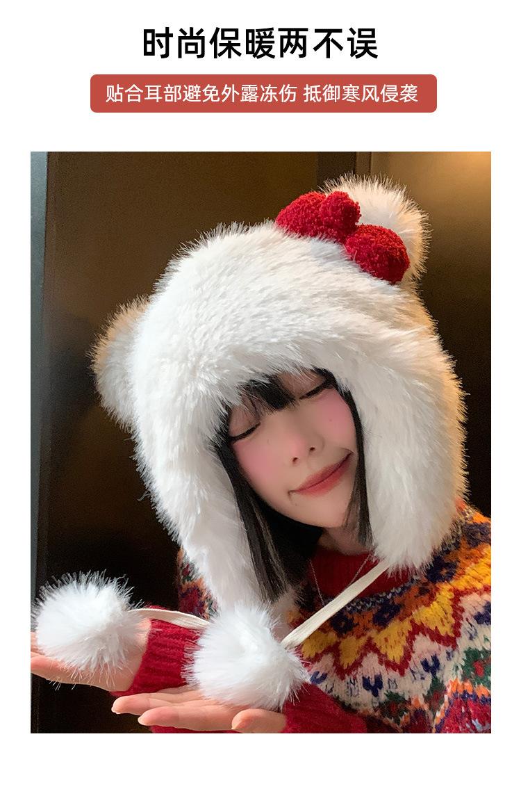 Lindo gorro de felpa con lazo para mujer, gorro de invierno peludo KT con protección para los oídos, gorro Lei Feng cálido, grueso y resistente al frío, gorro blanco