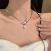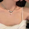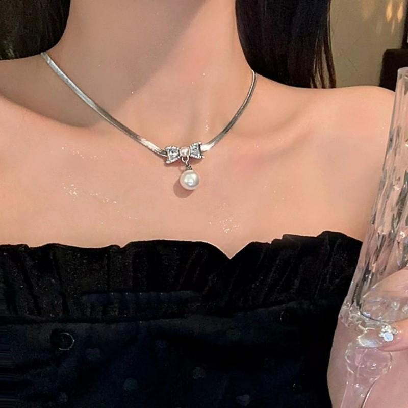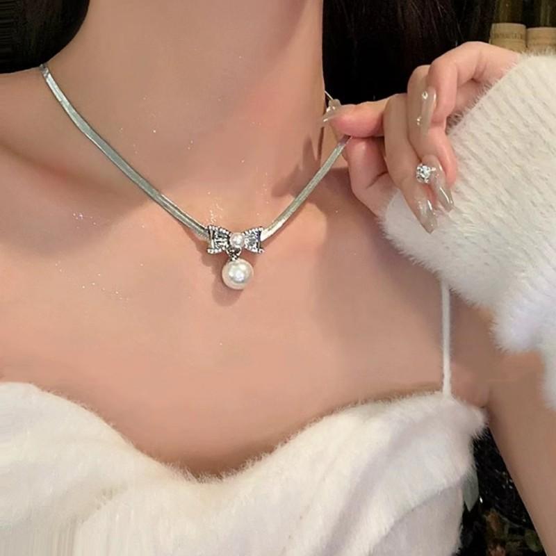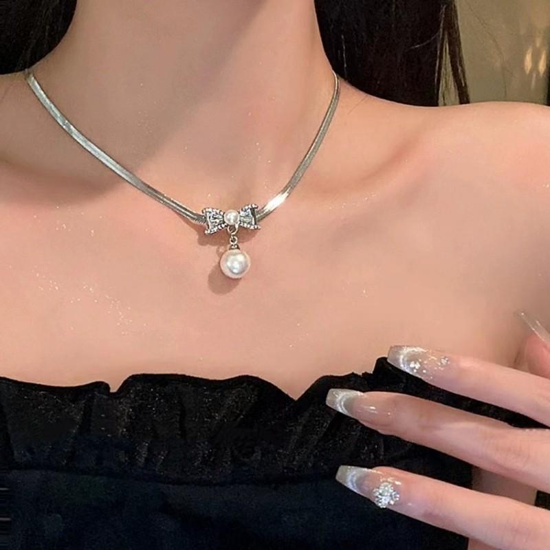 Collar elegante y dulce con cadena de clavícula con lazo de perlas y diamantes de imitación, diseño de nicho, de moda y de gran sentido.