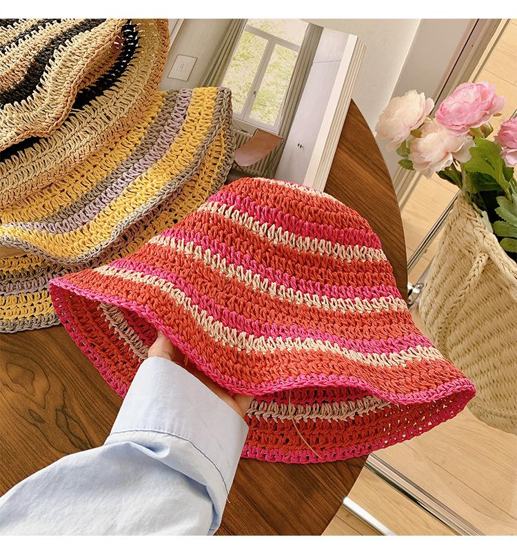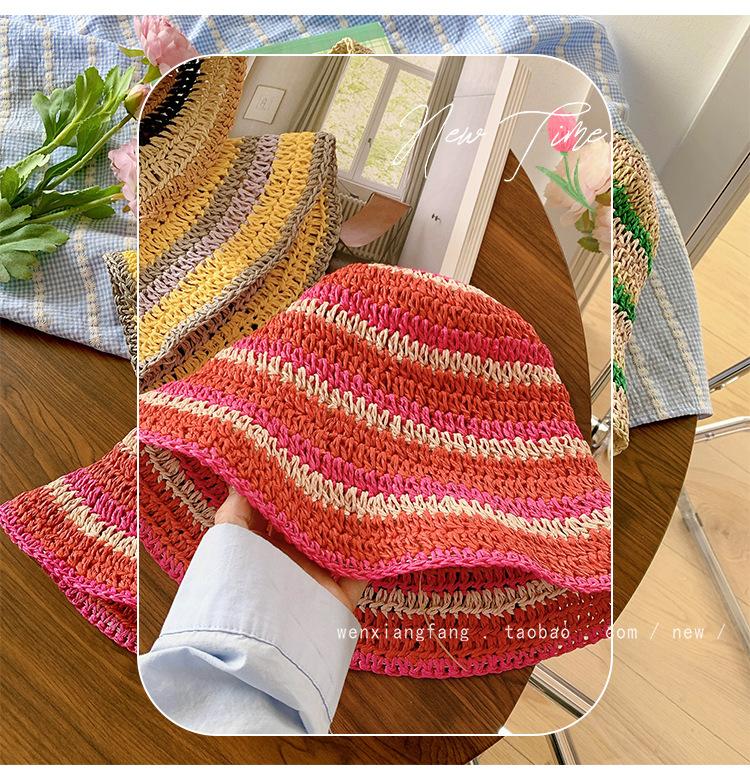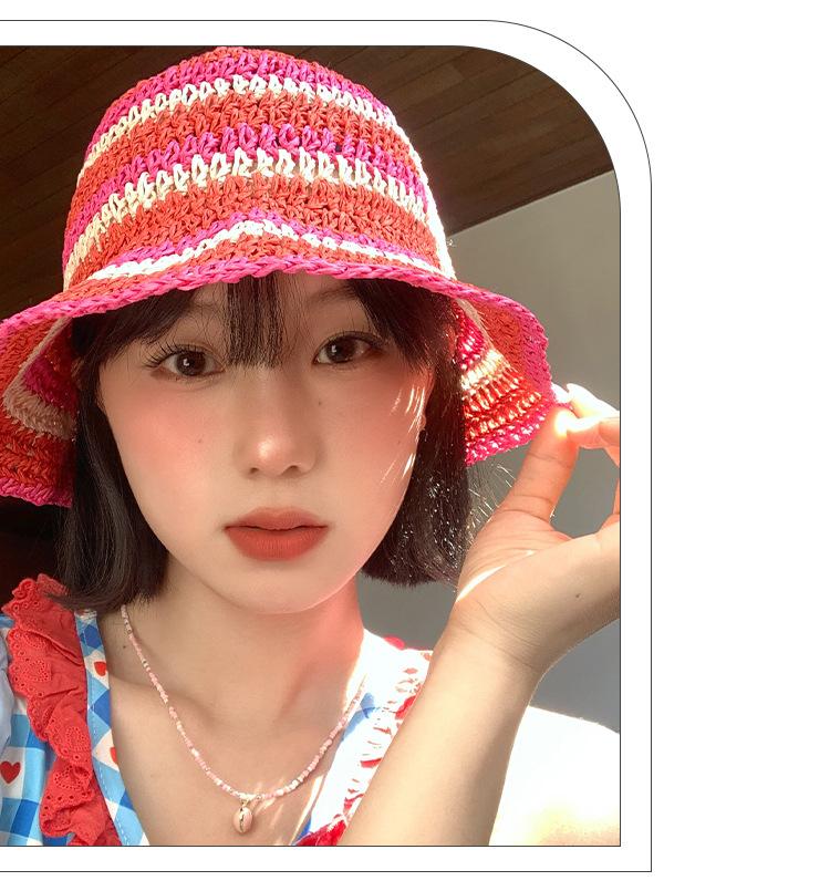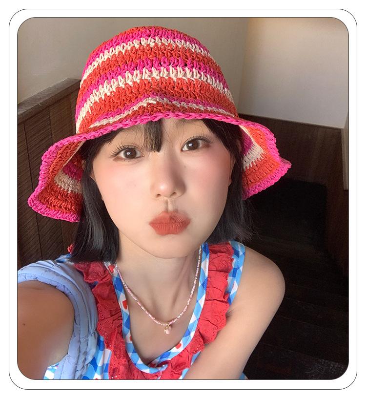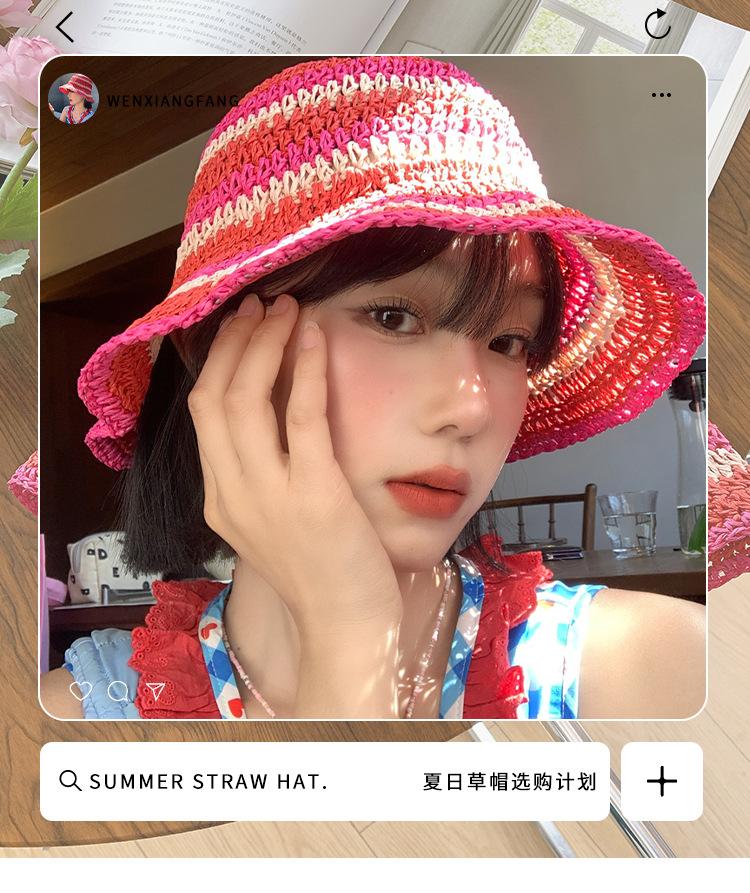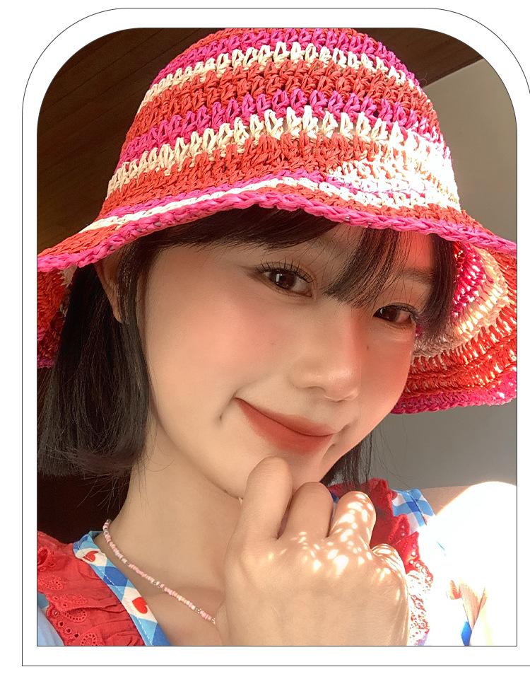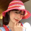 Sombrero de paja tejido rojo japonés para mujer, para verano, viajes, gran alero, sombrilla, protector solar, sombrero de pescador, sombrero de lavabo a rayas