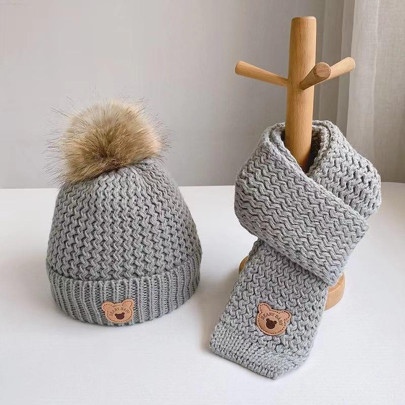 Nuevo Conjunto de Dos Piezas de Gorro y Bufanda para Niños de Otoño e Invierno Cálido y Grueso Gorro Tejido de Lana de Oso Lindo para Niños y Niñas