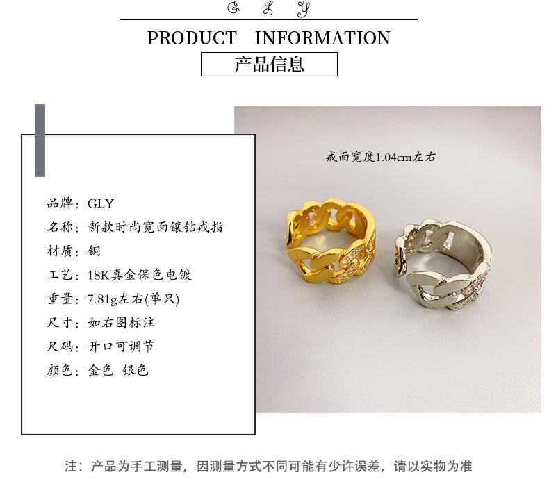 Anillo abierto con incrustaciones de diamantes y cadena de superficie ancha de nueva moda europea y americana, anillo de dedo ajustable con personalidad y temperamento femenino, venta al por mayor