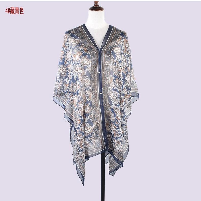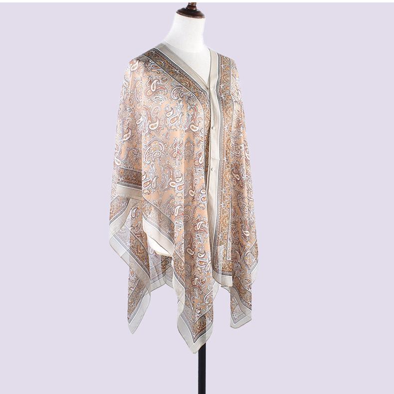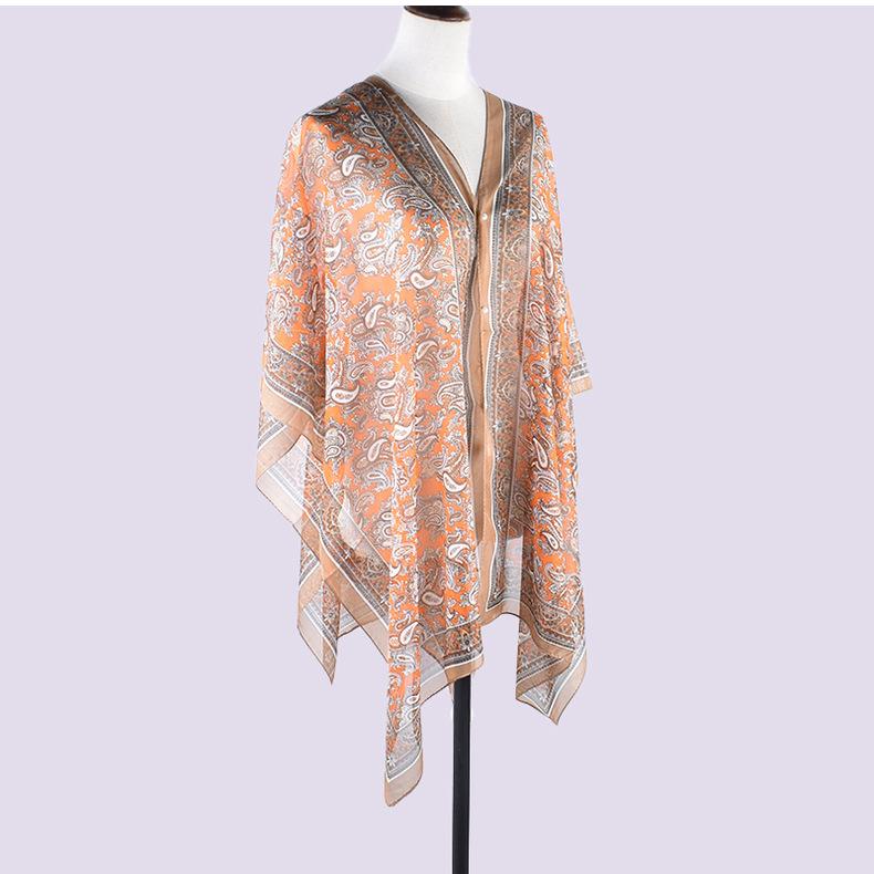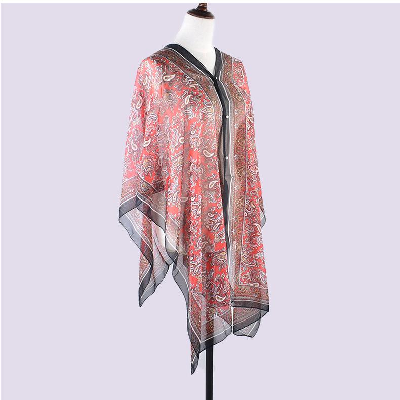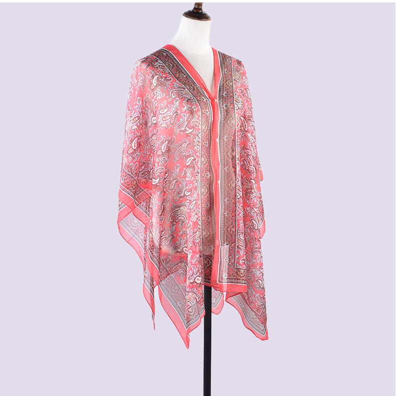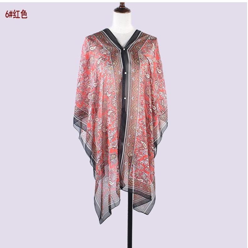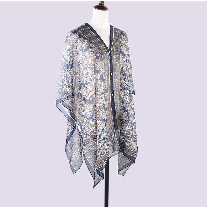 Ropa de Protección Solar Fina de Verano para Mujer con Hombro Descubierto, Estampado de Flor de Anacardo, Chal de Gasa, Viaje Marítimo, Hebilla de Perla, Toalla de Playa