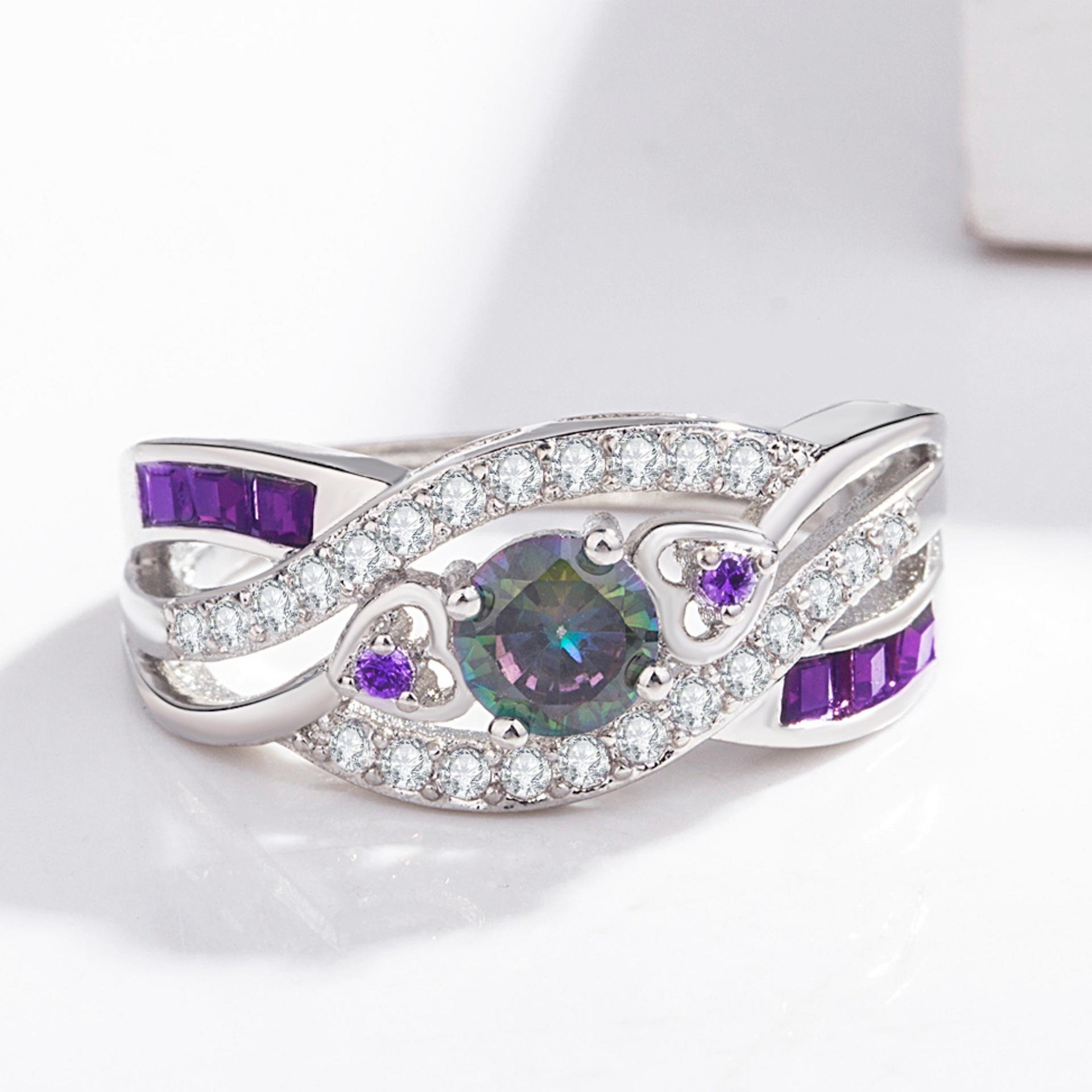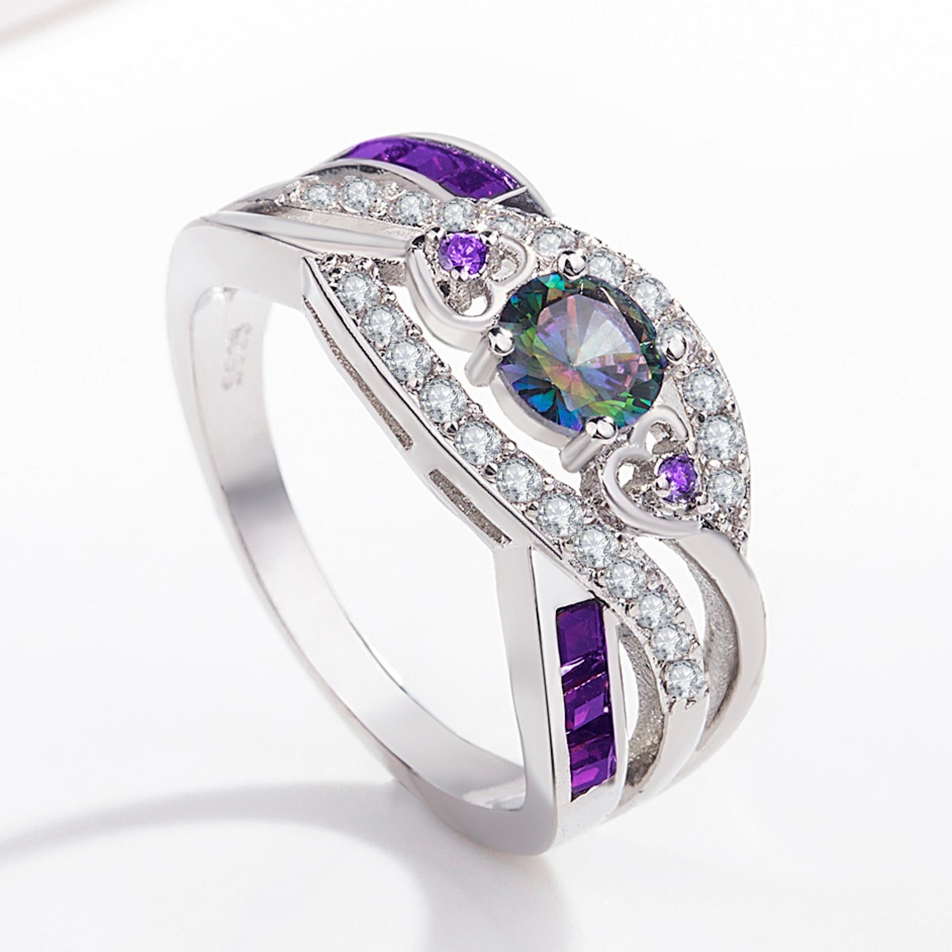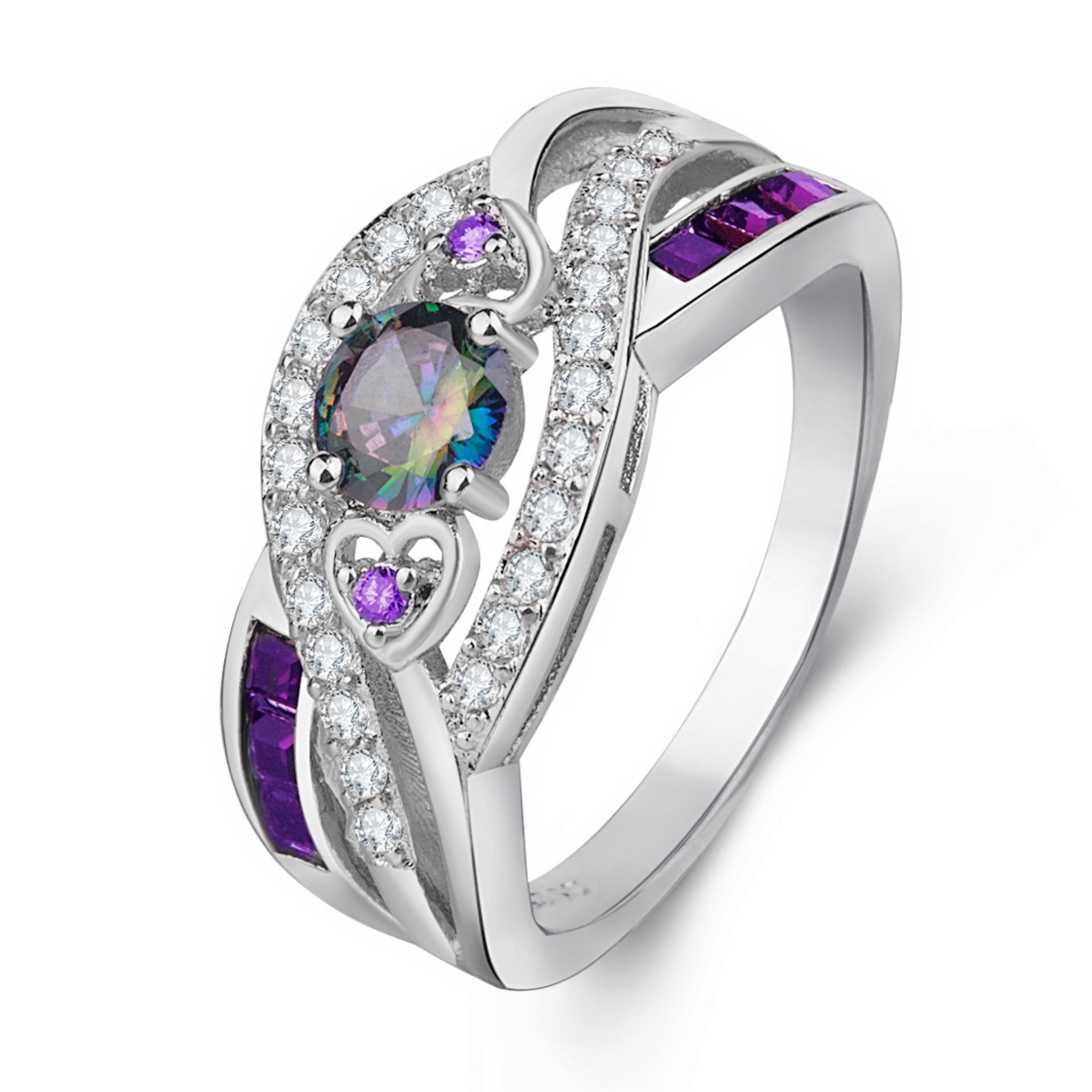 Anillo de Diamante Morado en Forma de Corazón de Wish Aliexpress Más Vendido Anillo Europeo y Americano de Diamante Redondo Color Arcoíris Circonia 3A Chapado en Platino