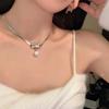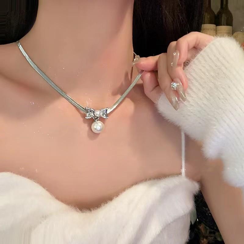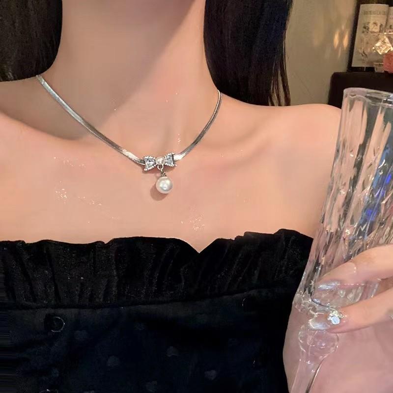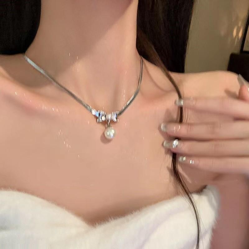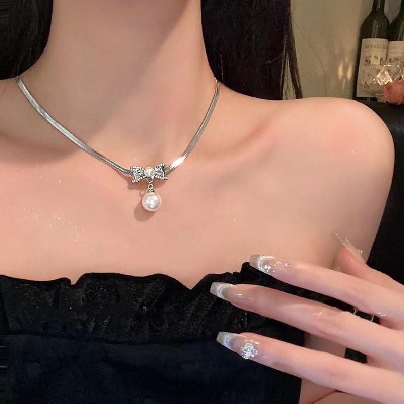Cadena de clavícula ligera de lujo con exquisito lazo de perlas y diamantes de imitación para mujer, nueva cadena de clavícula de diseño avanzado de nicho de moda.