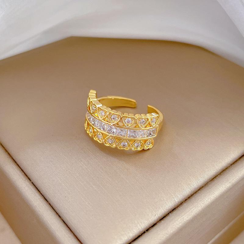 [Oro Verdadero] Anillo de Zircón en Forma de Corazón Abierto Ajustable Joyería Simple Anillo Japonés Anillo de Pareja