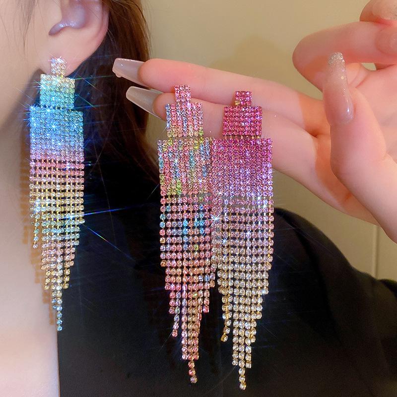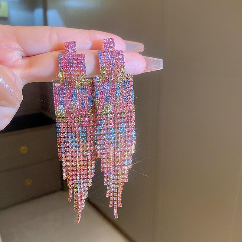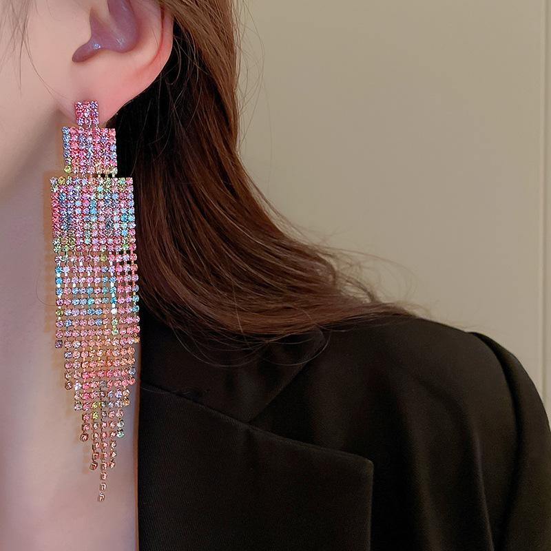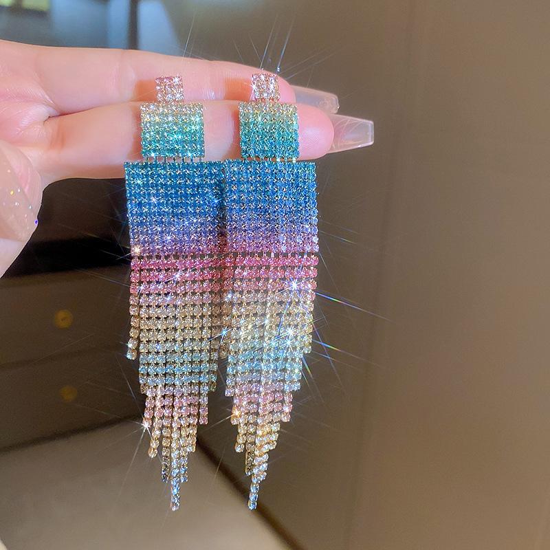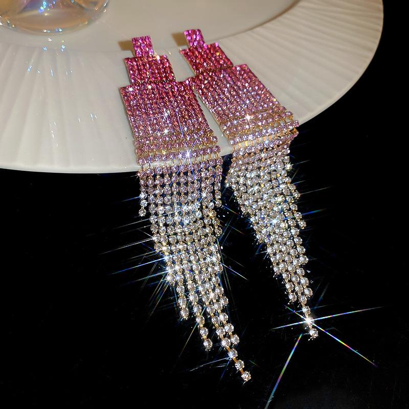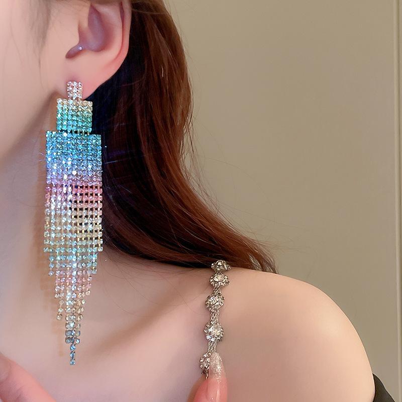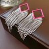 Pendientes de plata con borlas largas y cuadradas de diamantes con degradado exagerado, pendientes de lujo ligeros y de alta gama con personalidad europea y americana para mujer