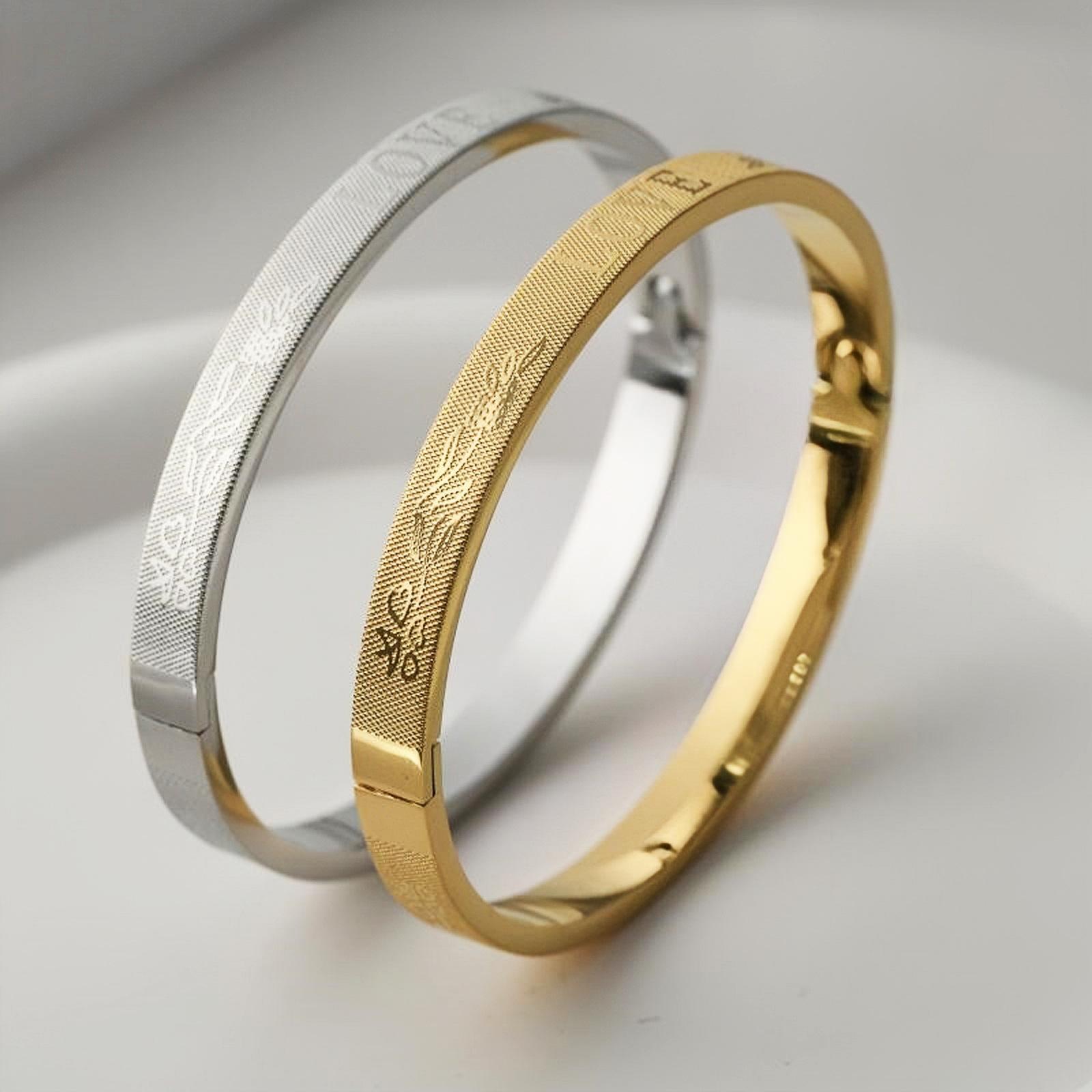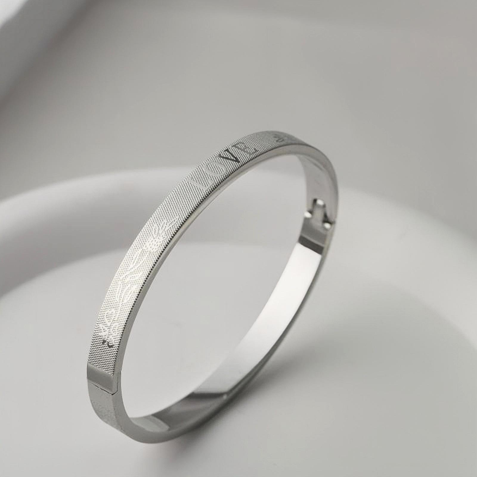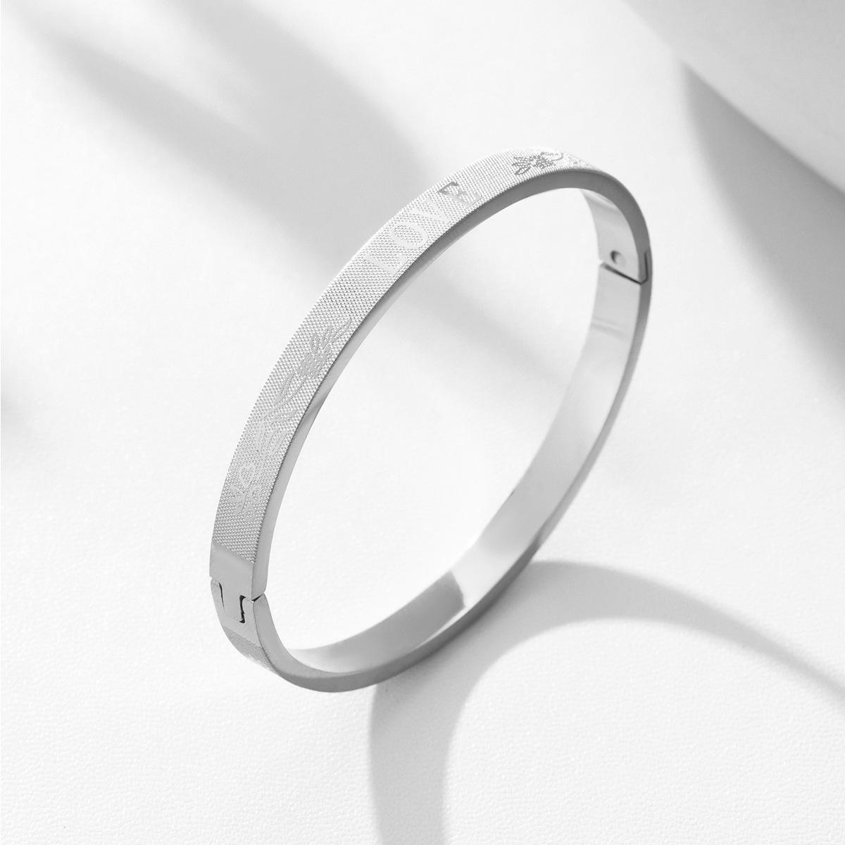 Fabricantes de pulseras de acero de titanio al por mayor, pulsera ajustable abierta en forma de C, pulsera femenina de acero inoxidable con logotipo de texto grabado.