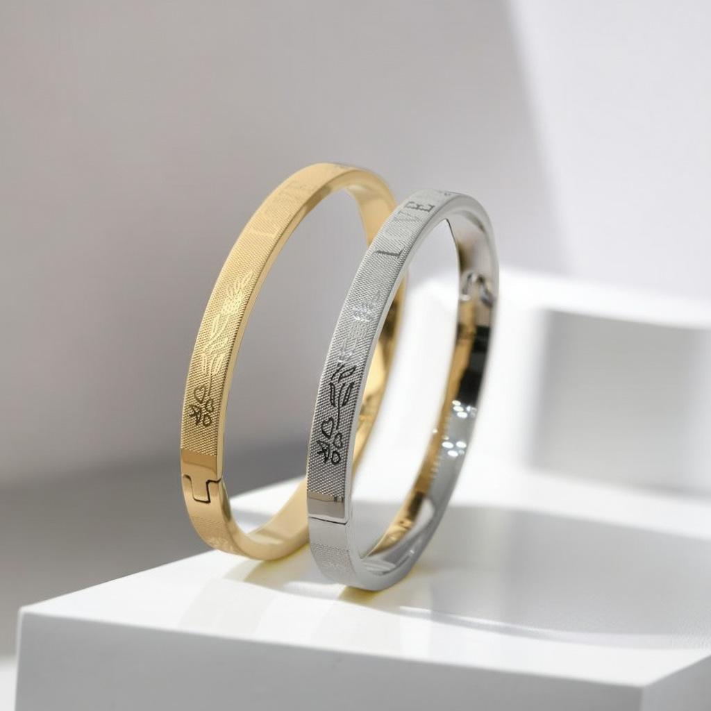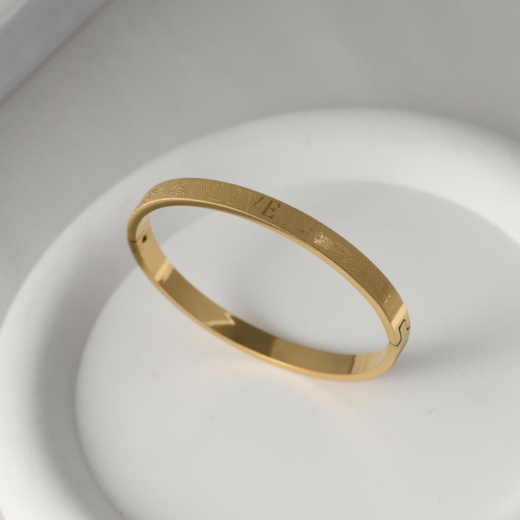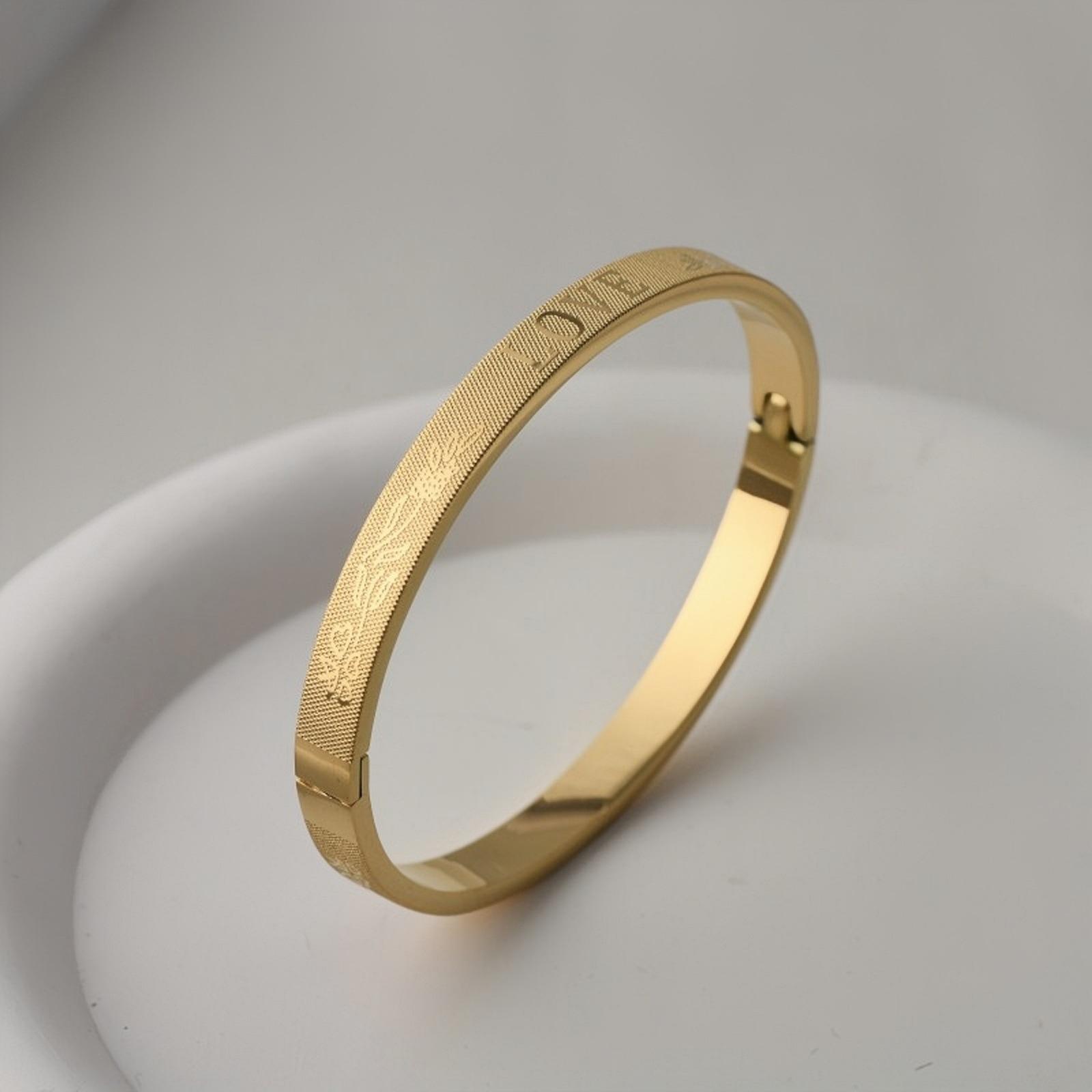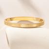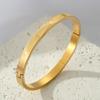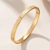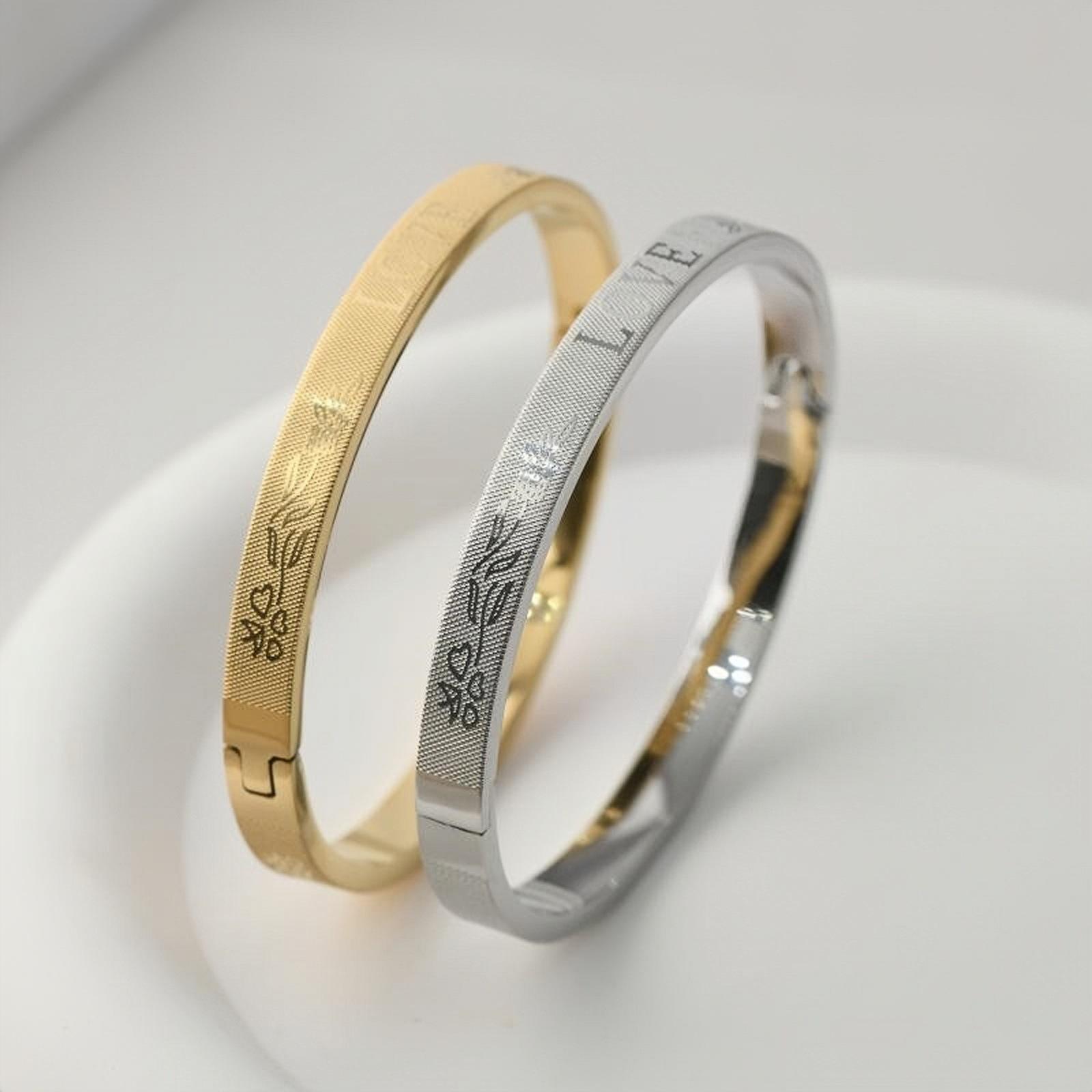 Fabricantes de pulseras de acero de titanio al por mayor, pulsera ajustable abierta en forma de C, pulsera femenina de acero inoxidable con logotipo de texto grabado.
