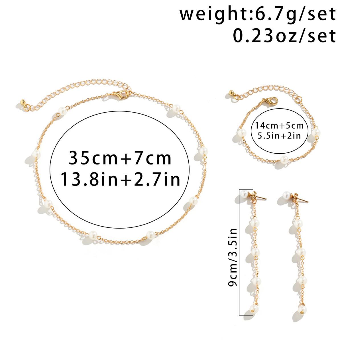 Categoría de Producto: Collar + Pulsera + Aretes (5229) Color del producto: Dorado Material del producto: Cadena de hierro chapada en cobre + Perla de imitación / Cadena de hierro chapada en cobre + Perla de imitación Embalaje del producto: bolsa OPP, embalaje independiente. Peso y dimensiones del producto: Ver etiqueta de la imagen.(Las dimensiones y los pesos se miden manualmente, por lo que habrá un ligero error. Consulte el producto real. Preste atención al tamaño antes de comprar). |