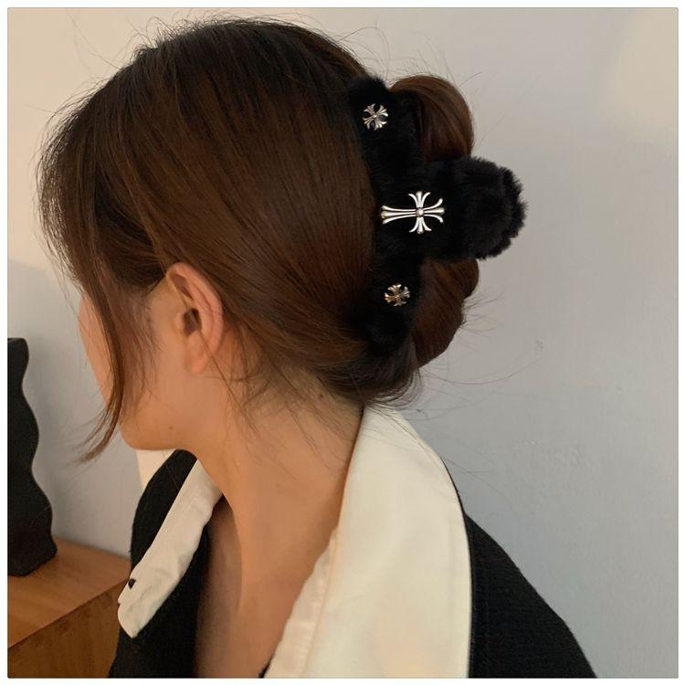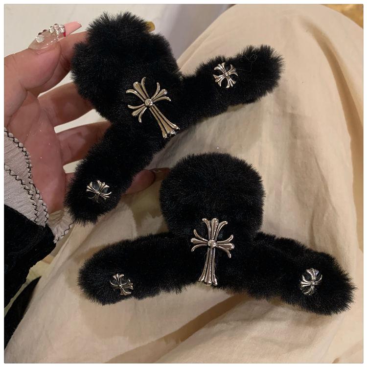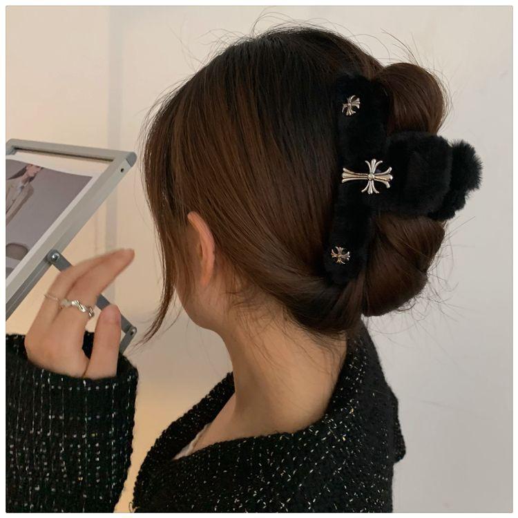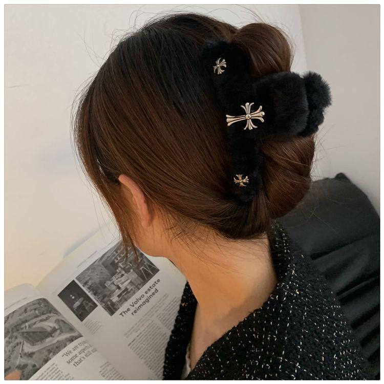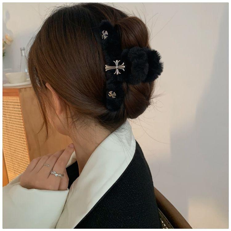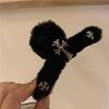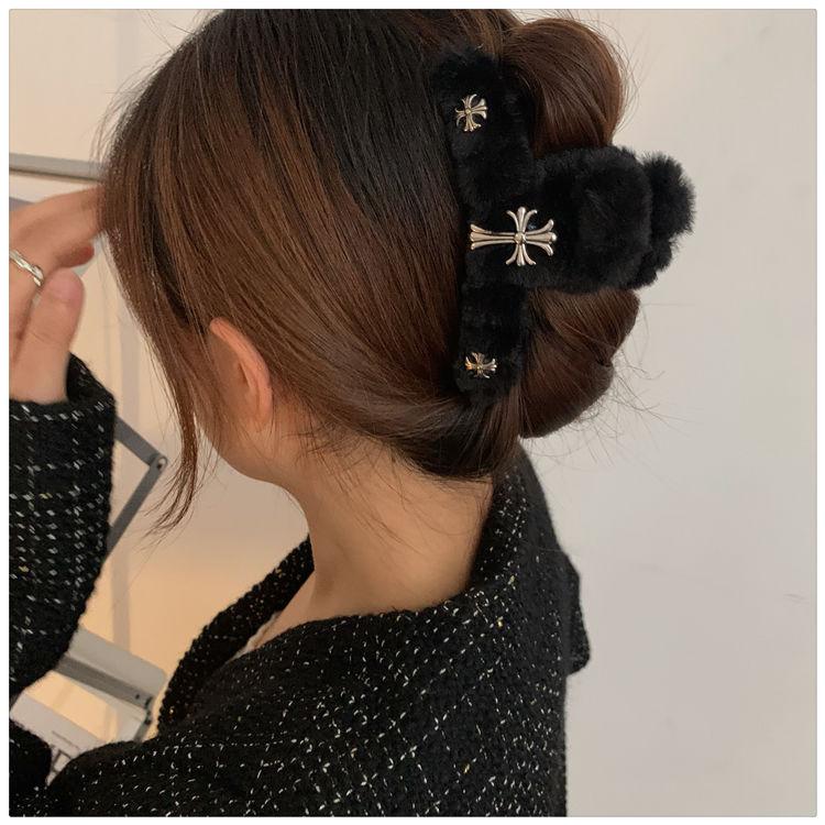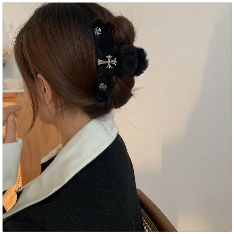 Horquilla de felpa para el pelo con forma de tiburón, estilo francés, color negro, para otoño e invierno, para mujer