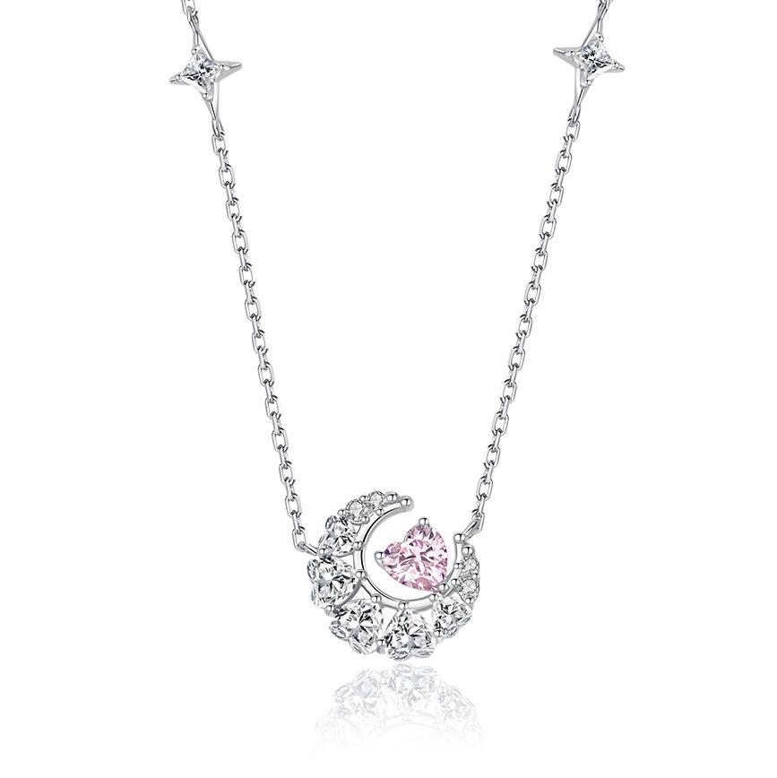 Heart Moon Necklace (Stainless Steel Plated Platinum)-Pink Diamond