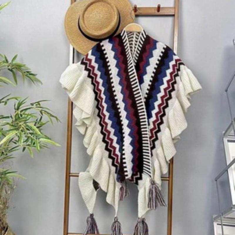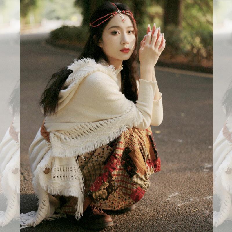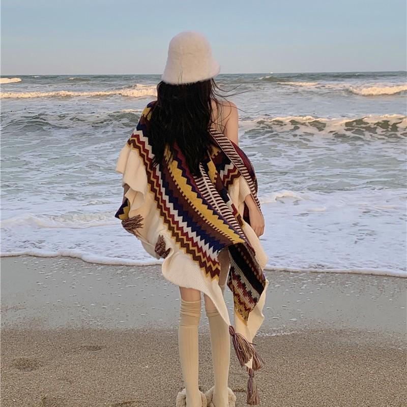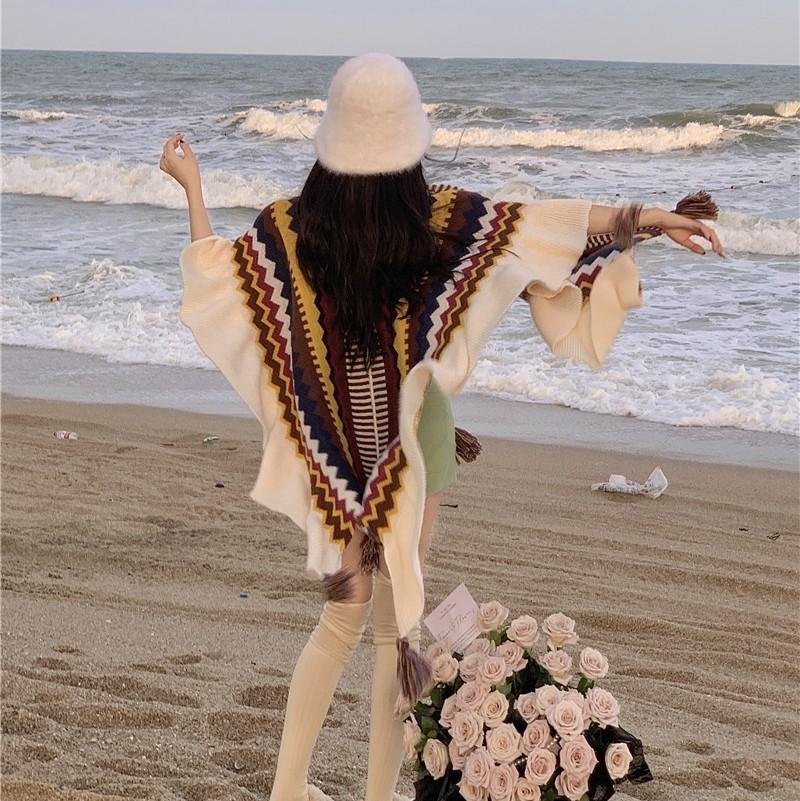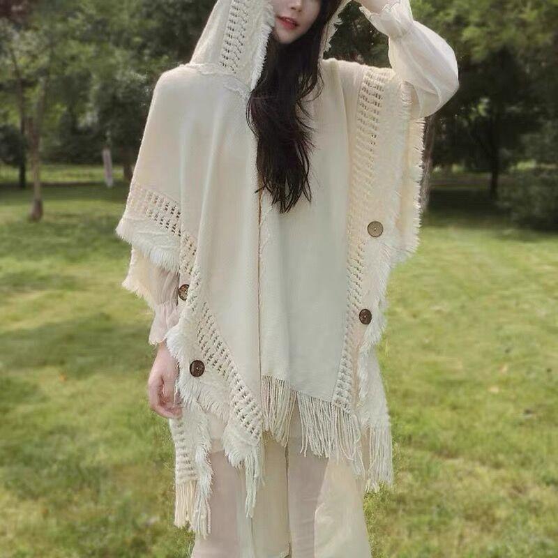 Suéter bohemio con borlas y chal estilo Mori, tejido de punto, capa de viaje de pastizales de Xinjiang, bufanda con capucha, combina con todo para mujer
