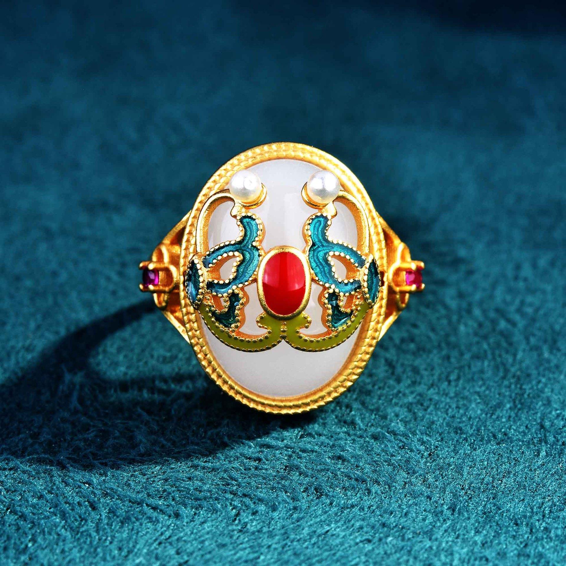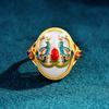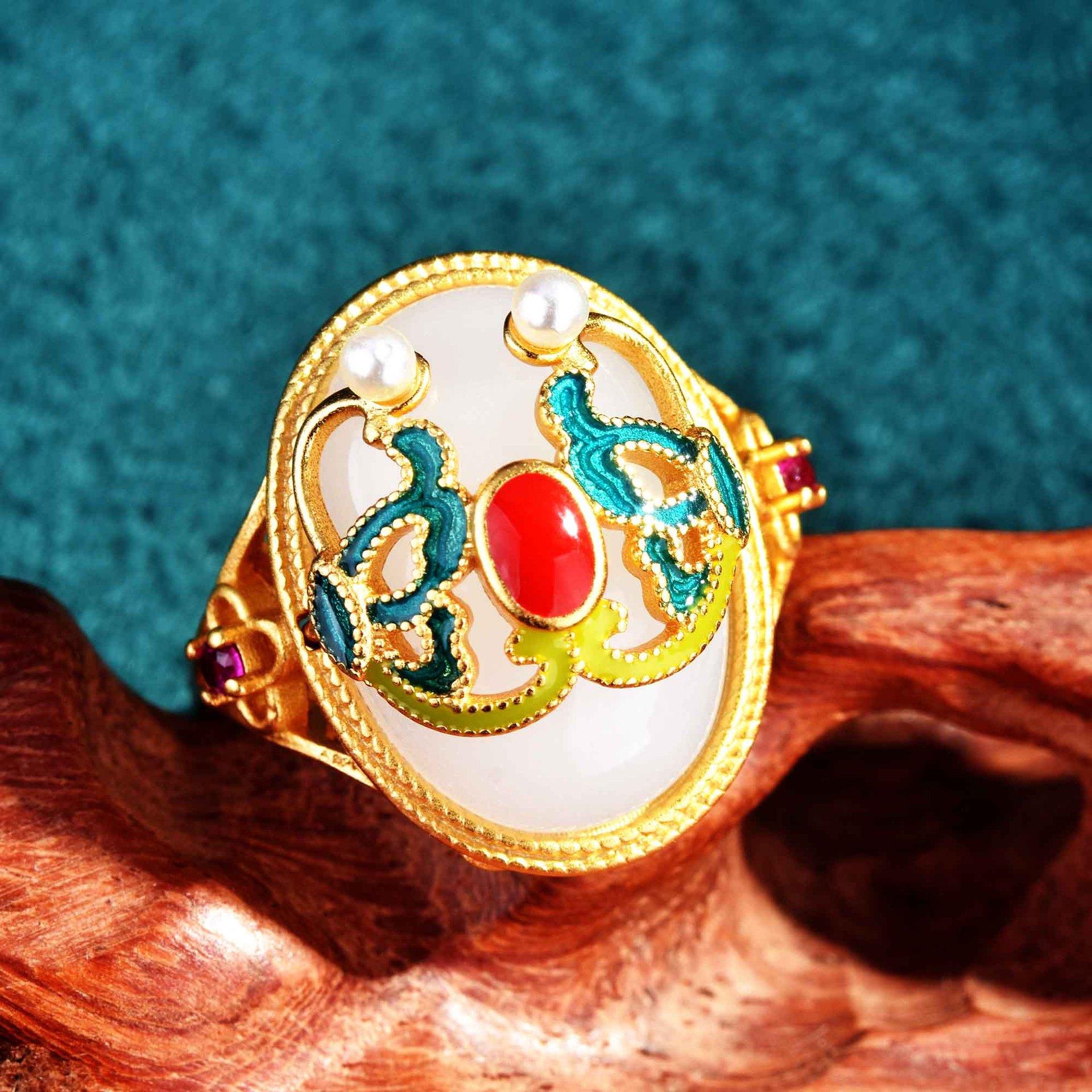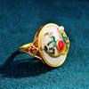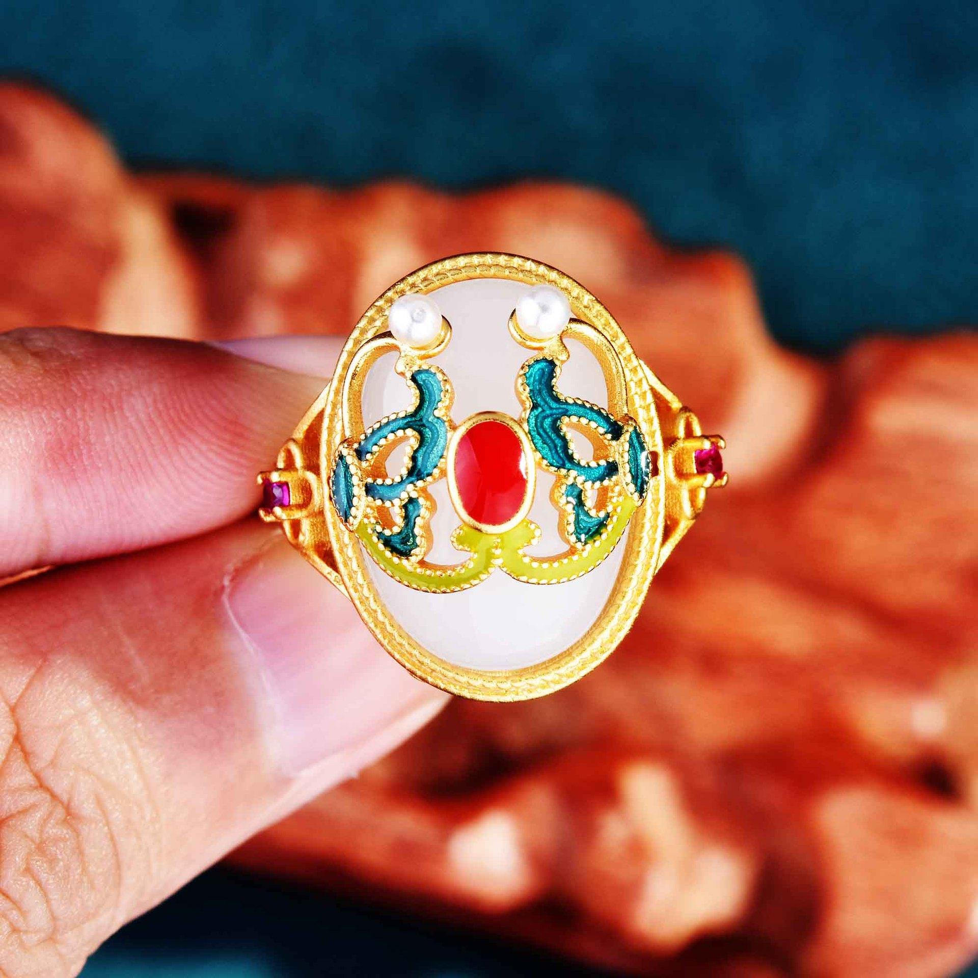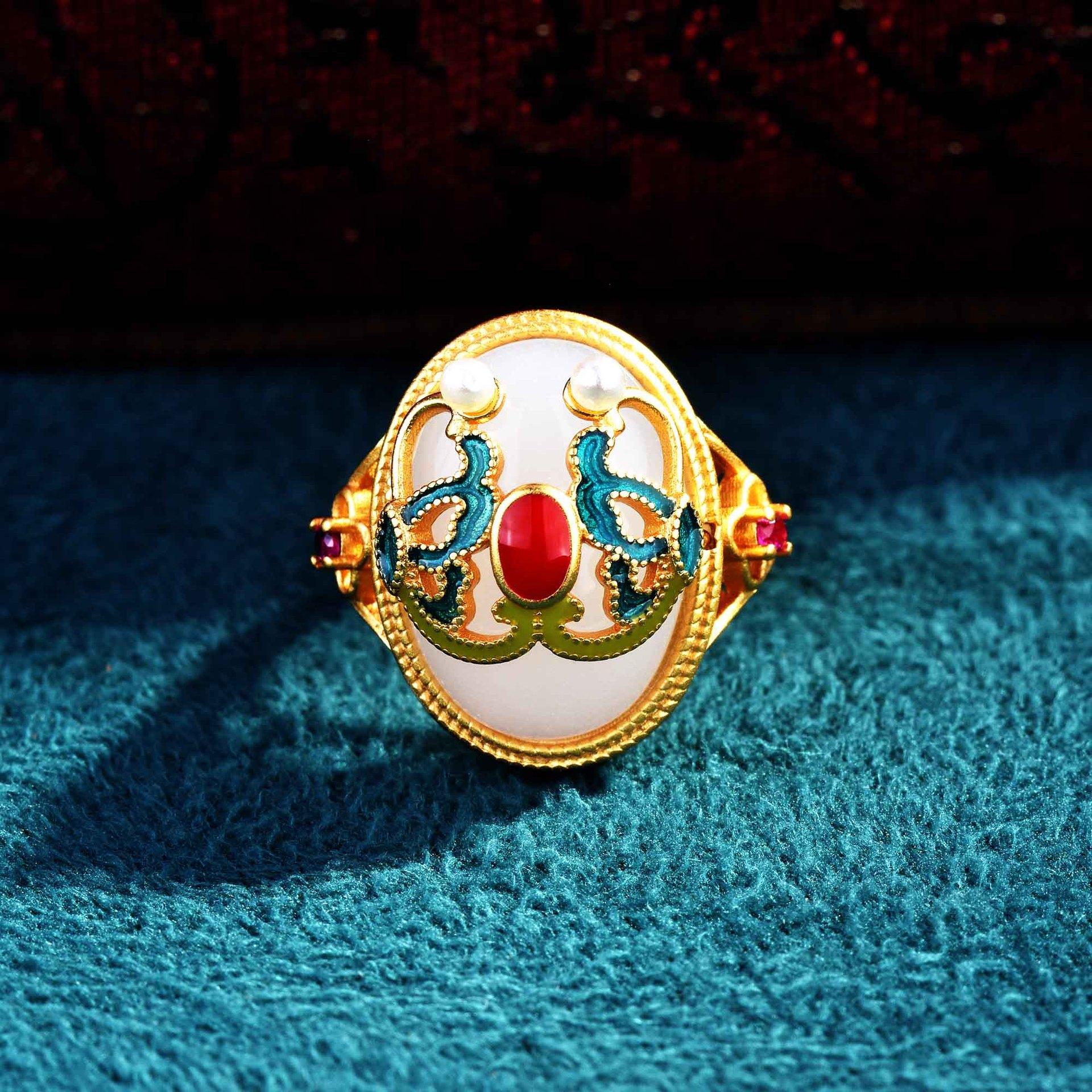 Anillo antiguo de jade Hetian con incrustaciones de oro para mujer, anillo abierto ajustable para mujer con esmalte pintado azul quemado, anillo retro de corte