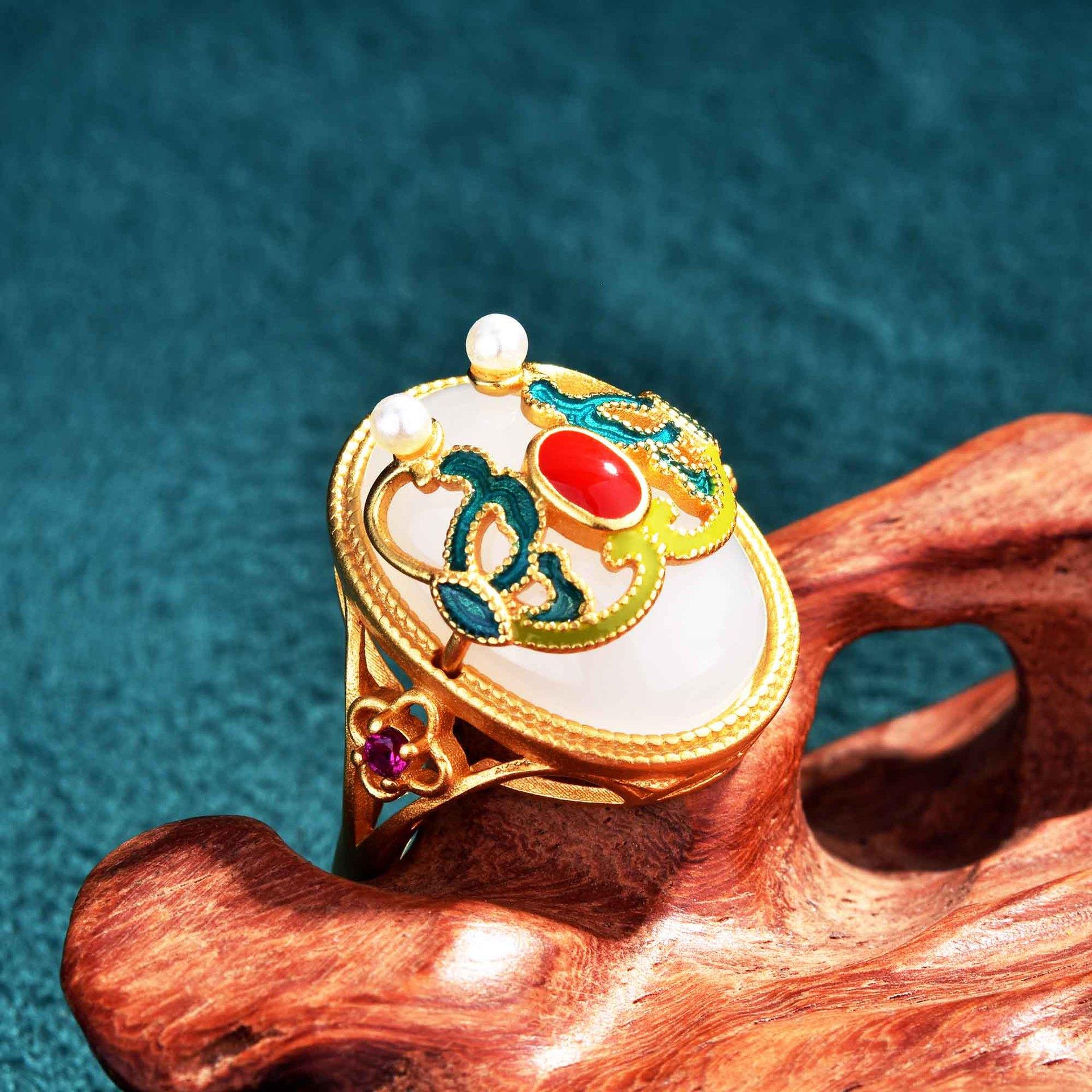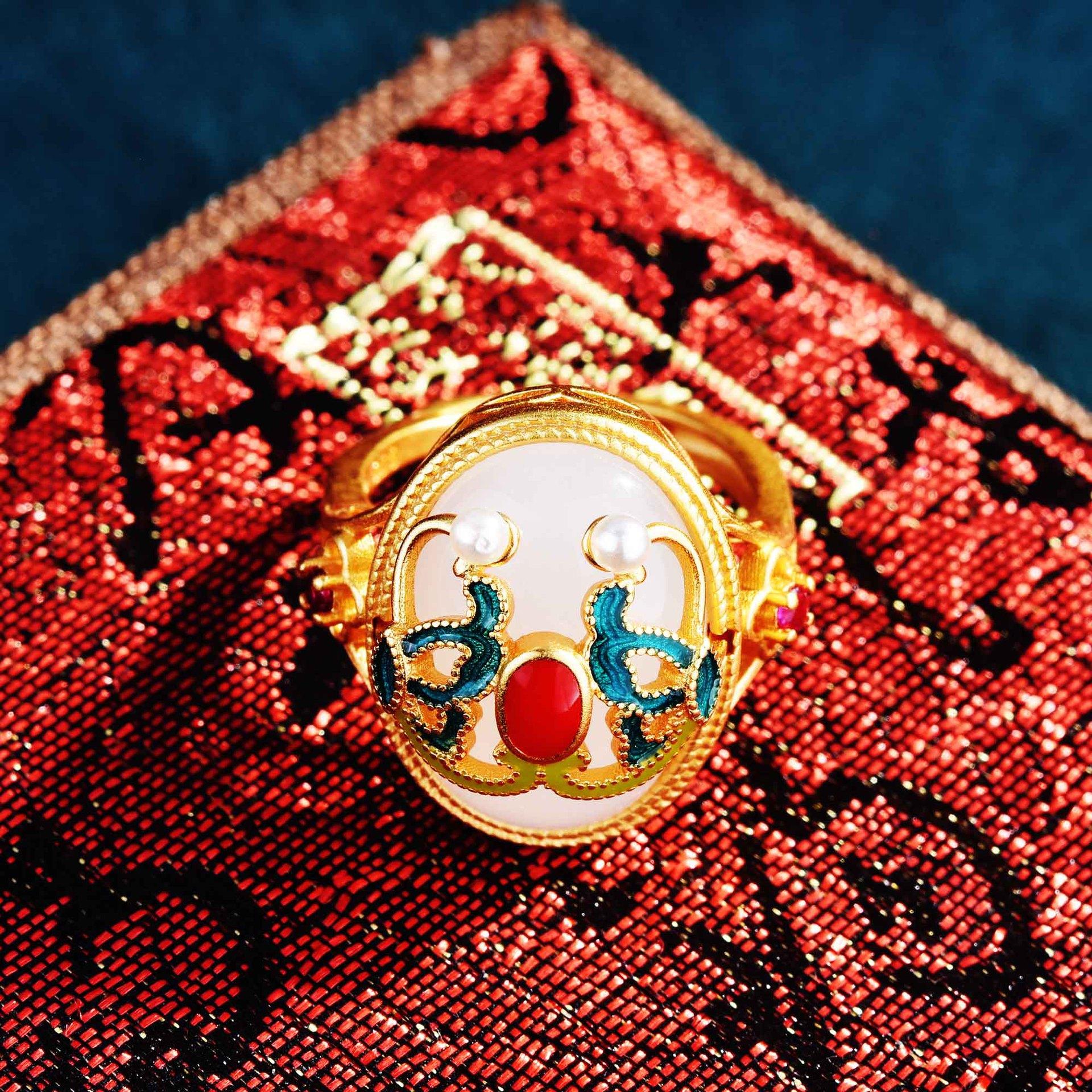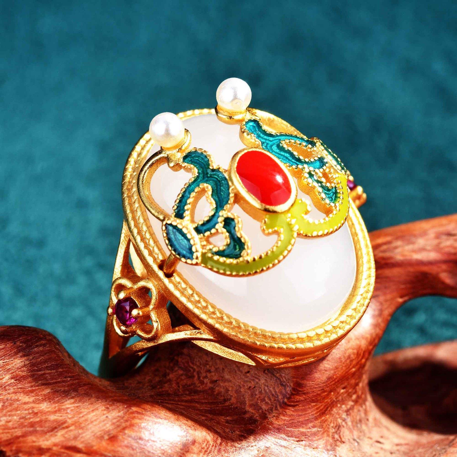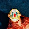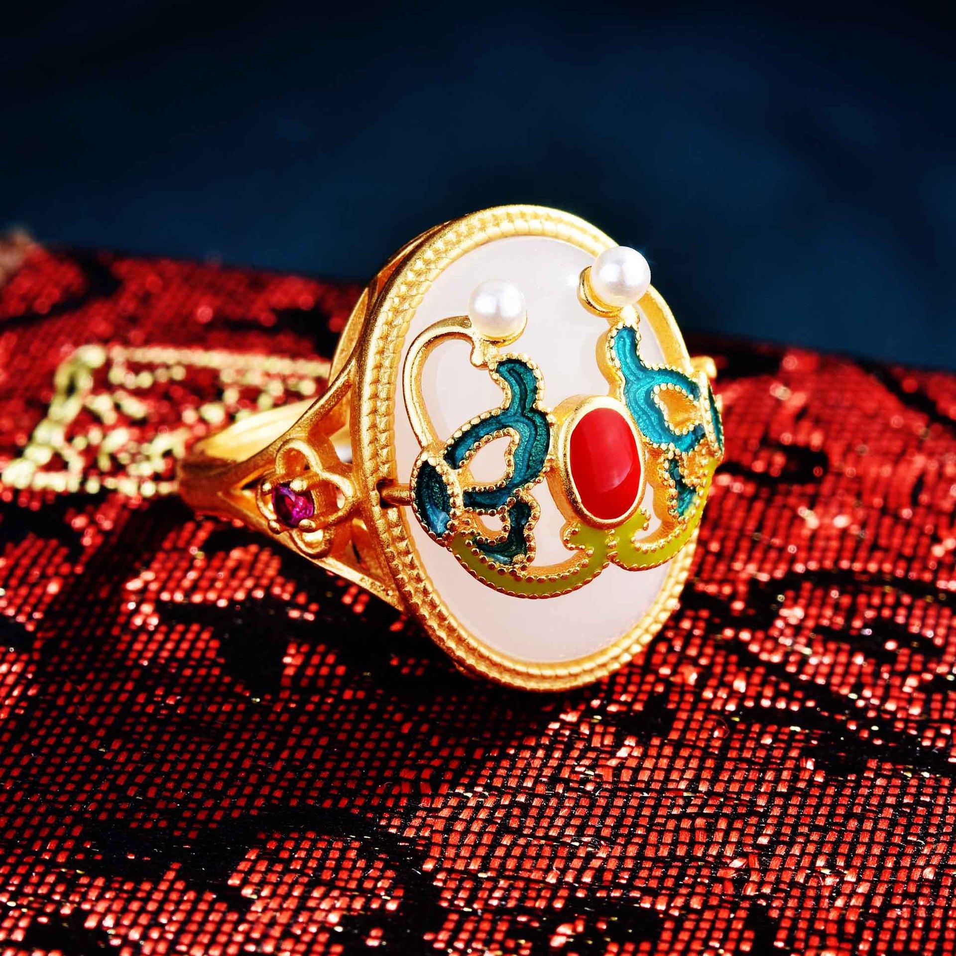 Anillo antiguo de jade Hetian con incrustaciones de oro para mujer, anillo abierto ajustable para mujer con esmalte pintado azul quemado, anillo retro de corte