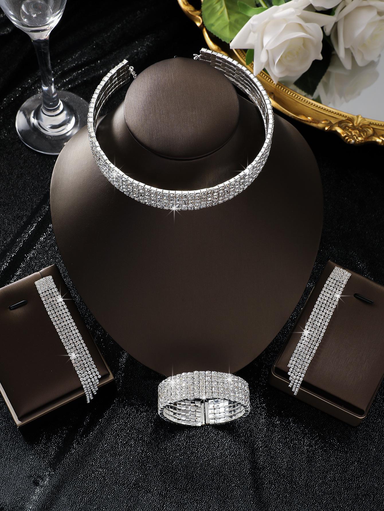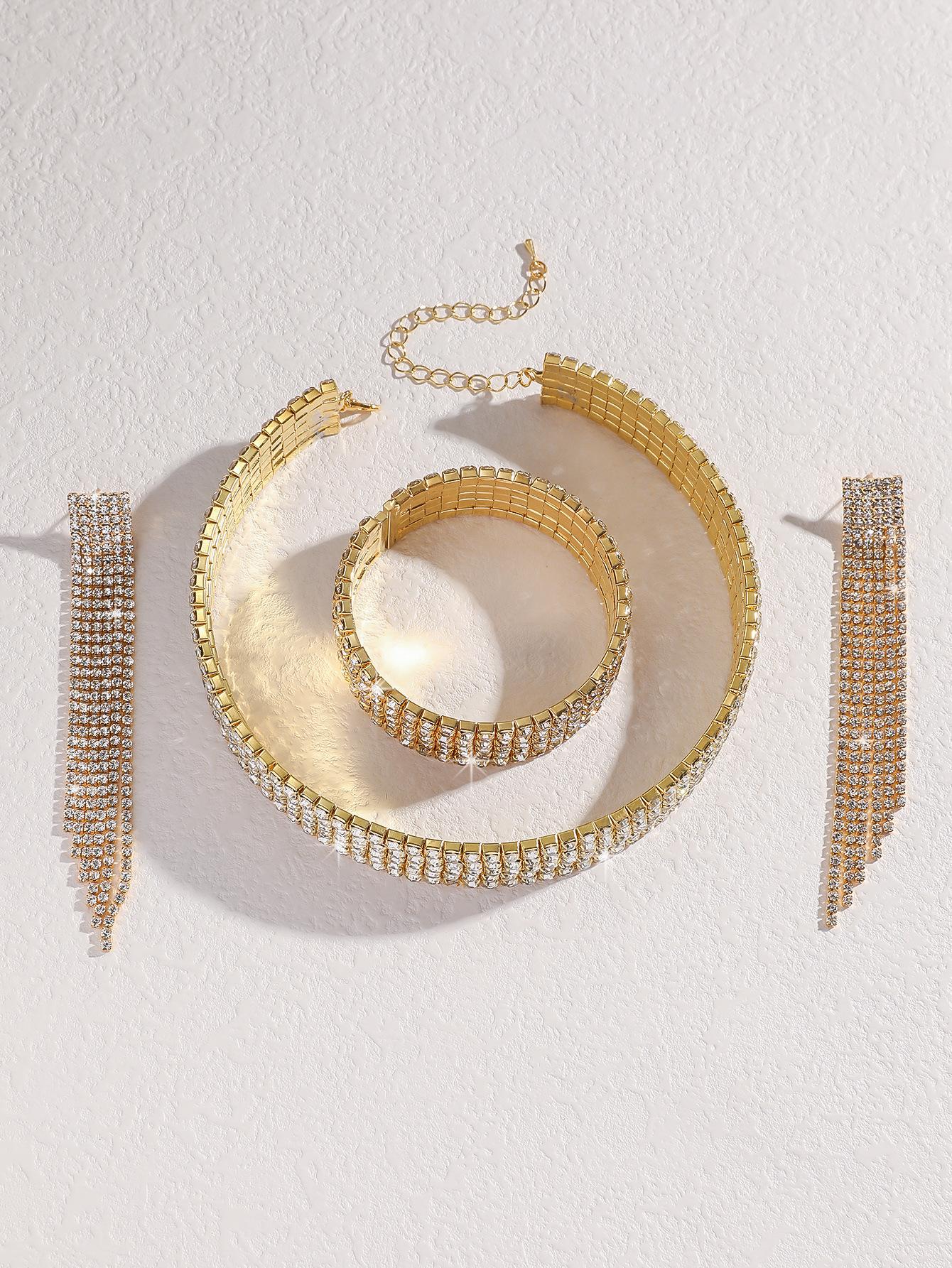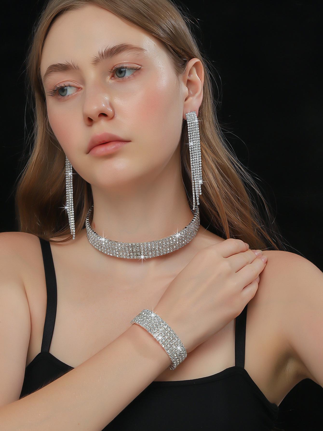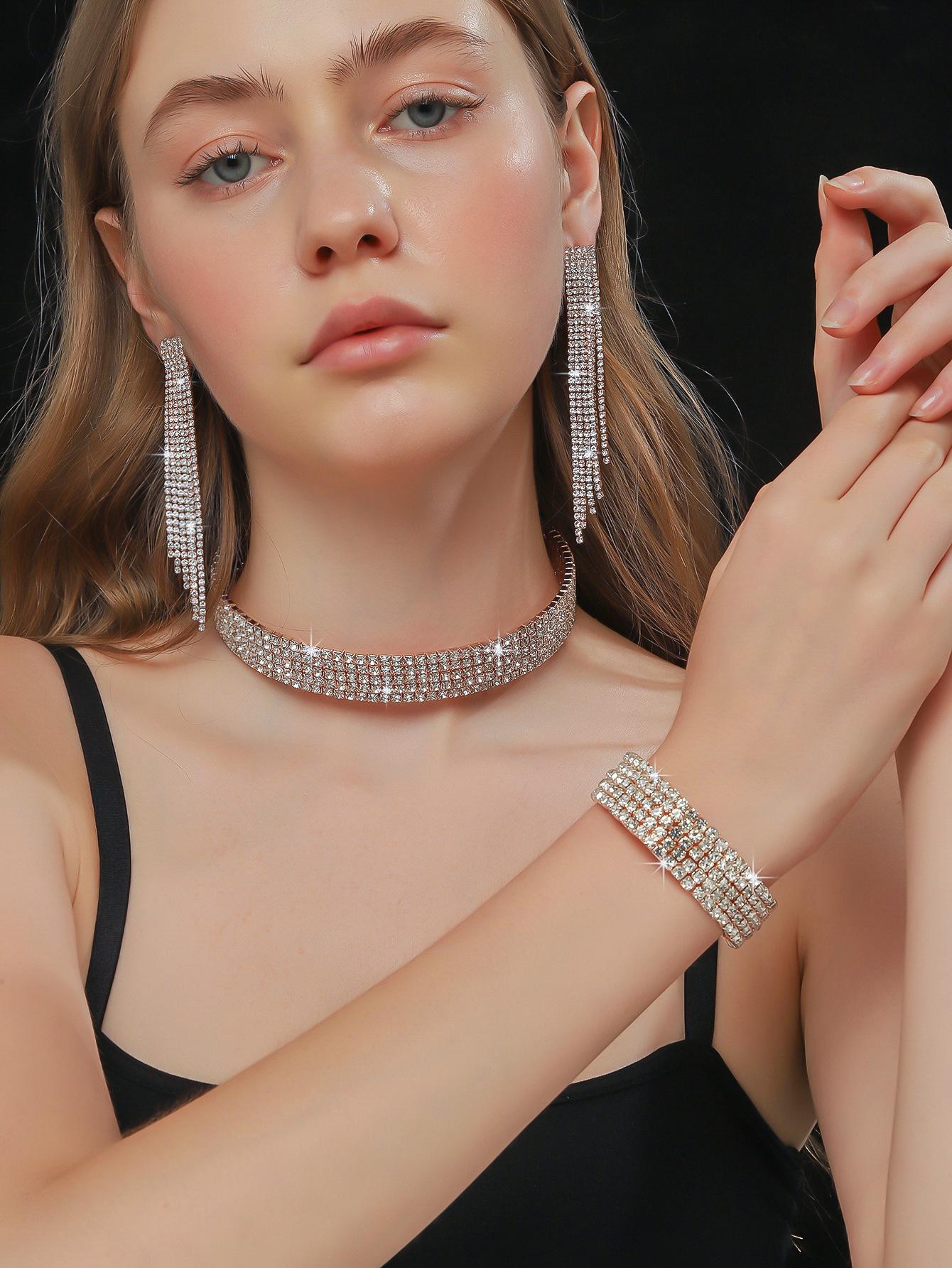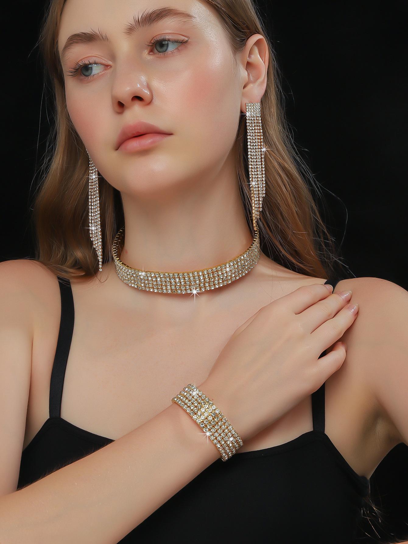 Conjunto de 3 piezas de collar, pendientes y pulsera con diamantes de imitación de varias filas, joyería transfronteriza europea y americana, accesorios para vestido de novia.