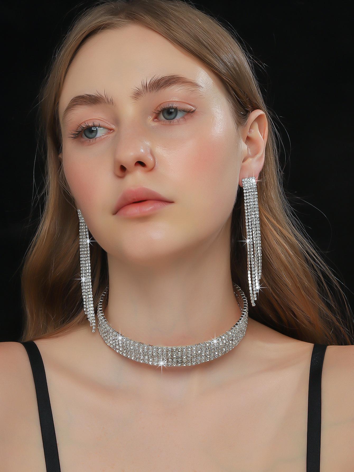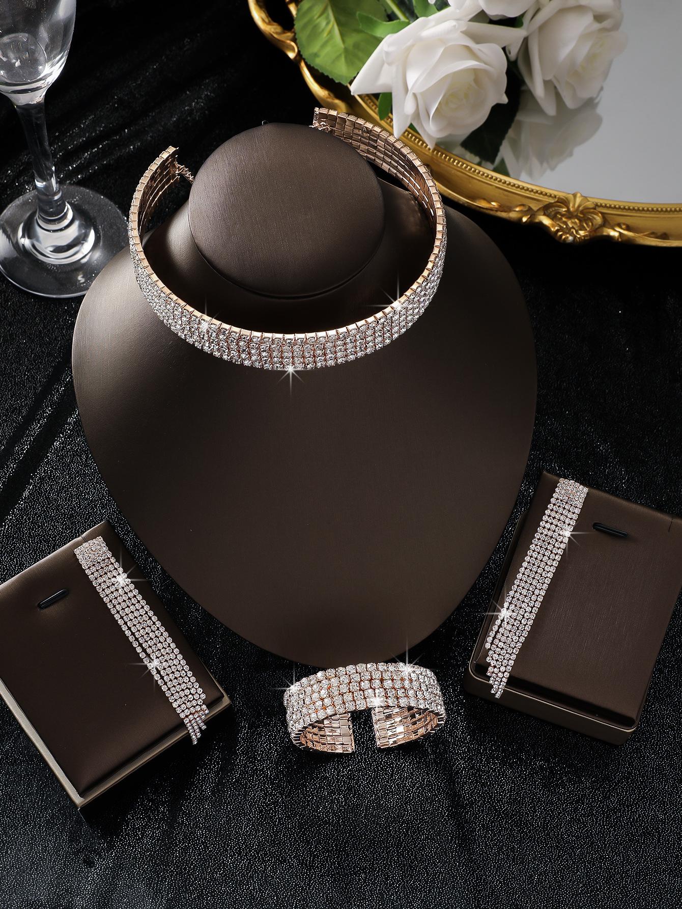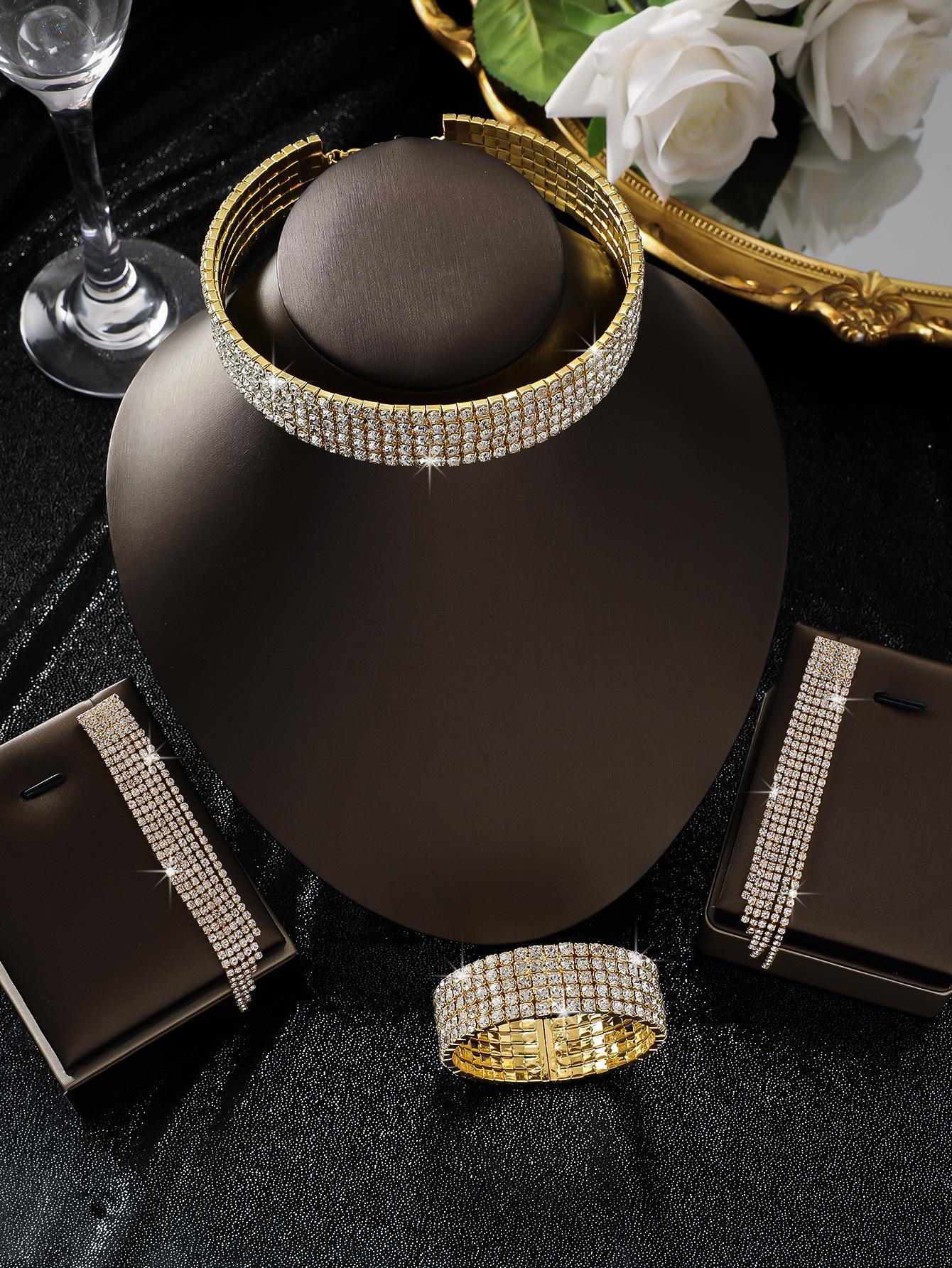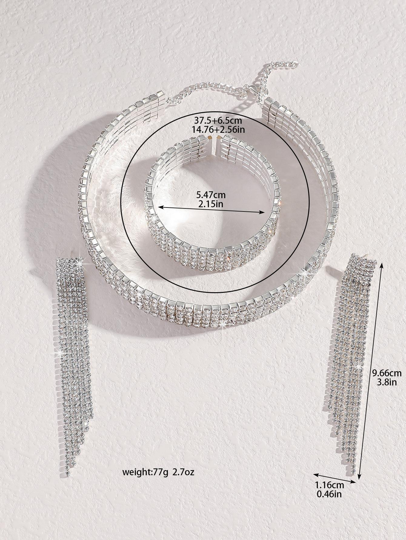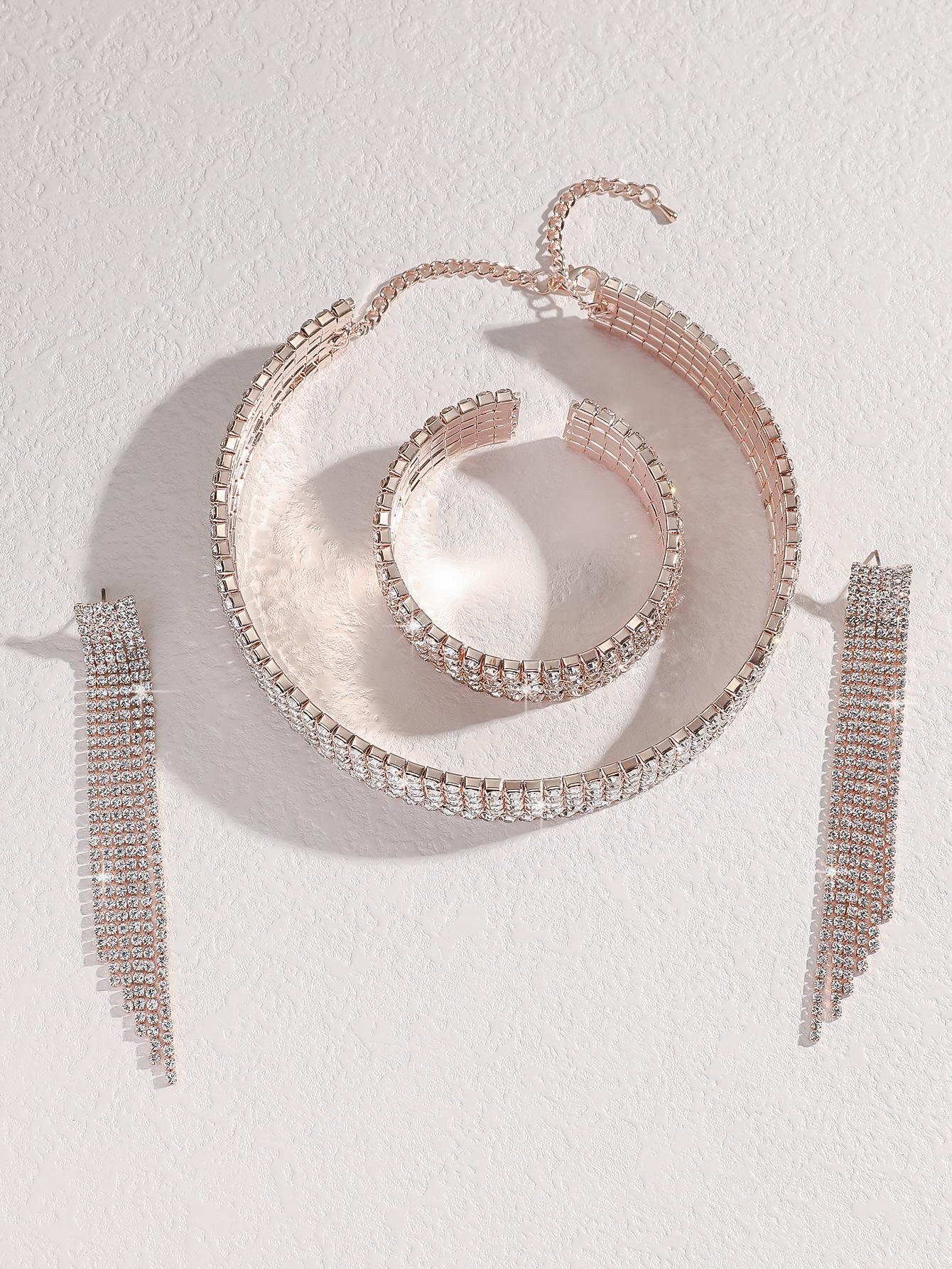 Conjunto de 3 piezas de collar, pendientes y pulsera con diamantes de imitación de varias filas, joyería transfronteriza europea y americana, accesorios para vestido de novia.