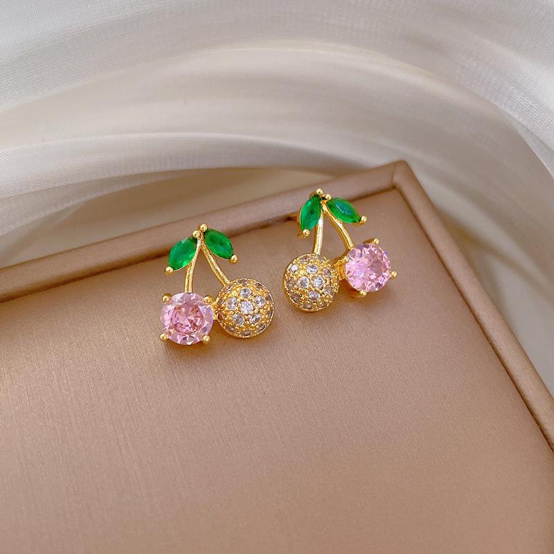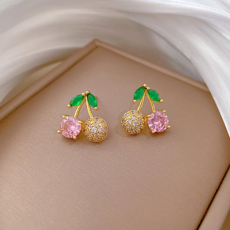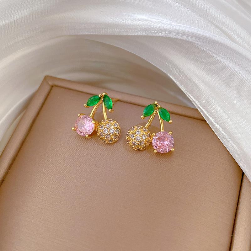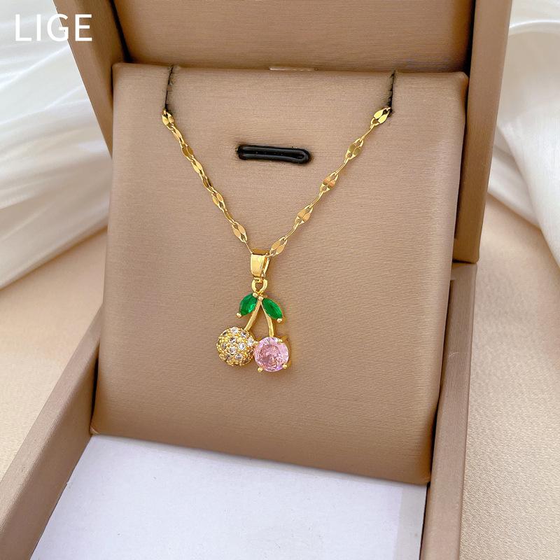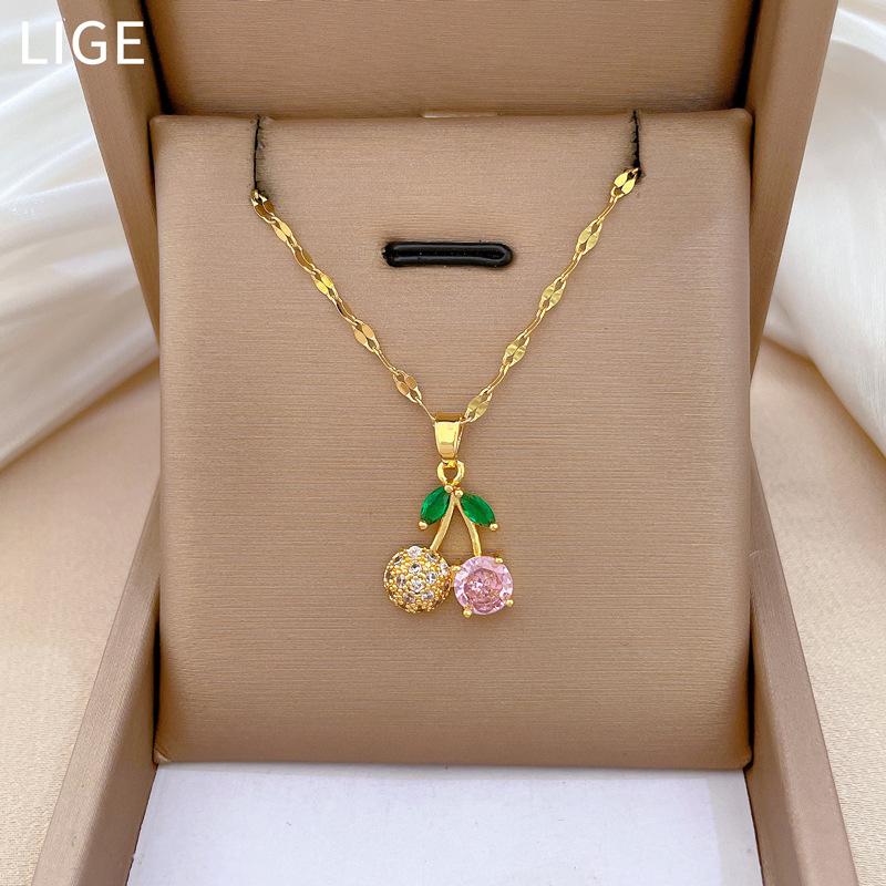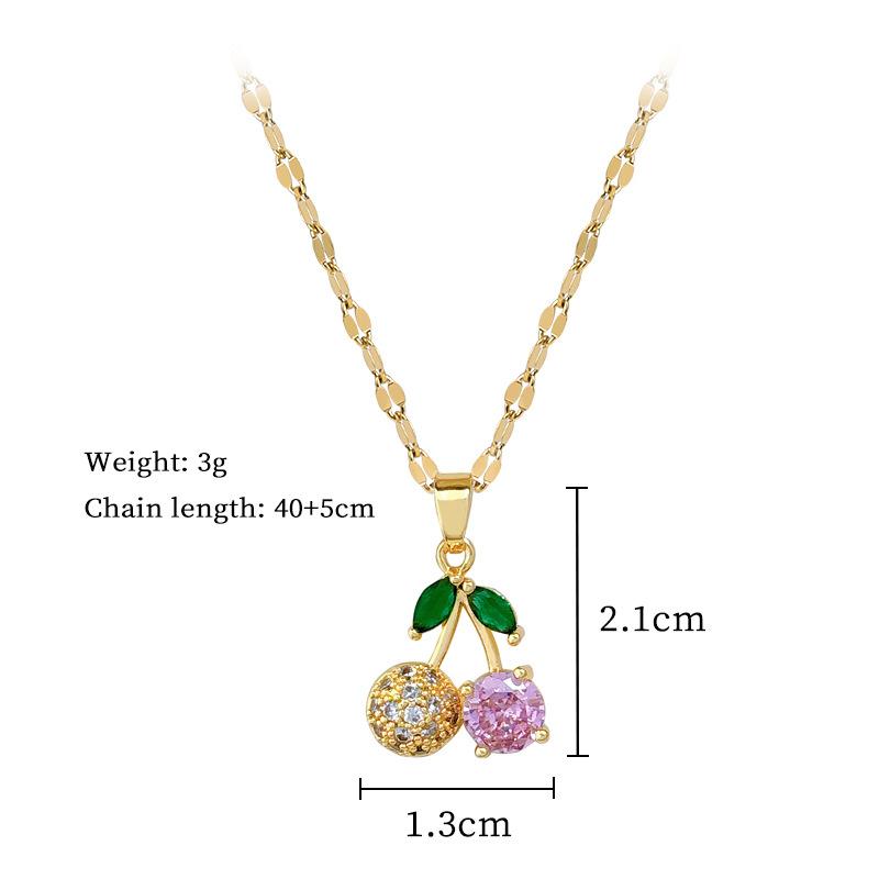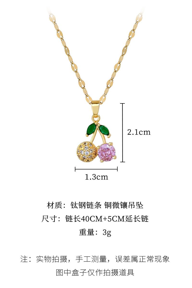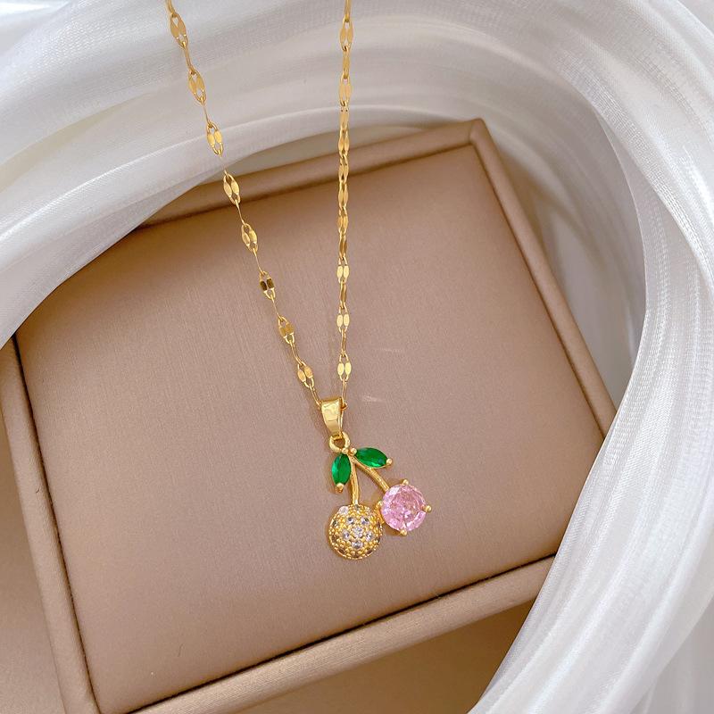 [Acero de titanio] Collar y pendientes de oro auténtico con microincrustaciones de diamantes rosa cereza de lujo ligero y fresco, accesorios de cadena para clavícula.