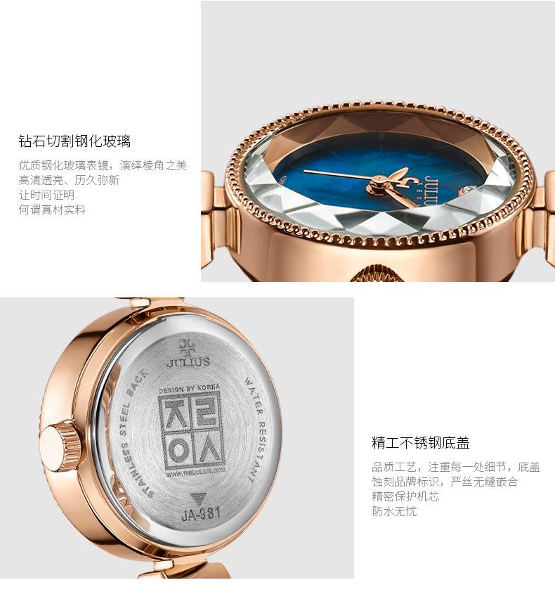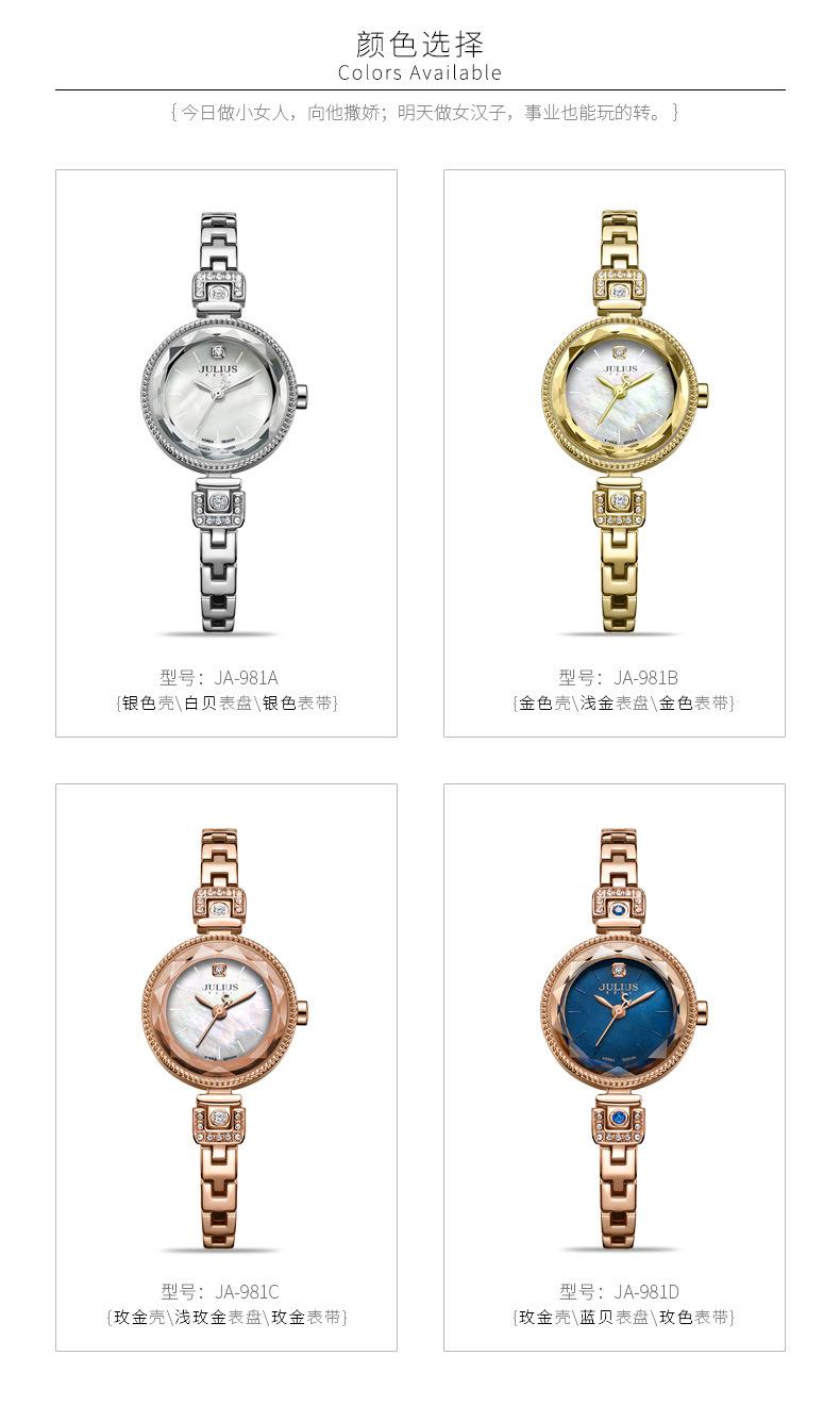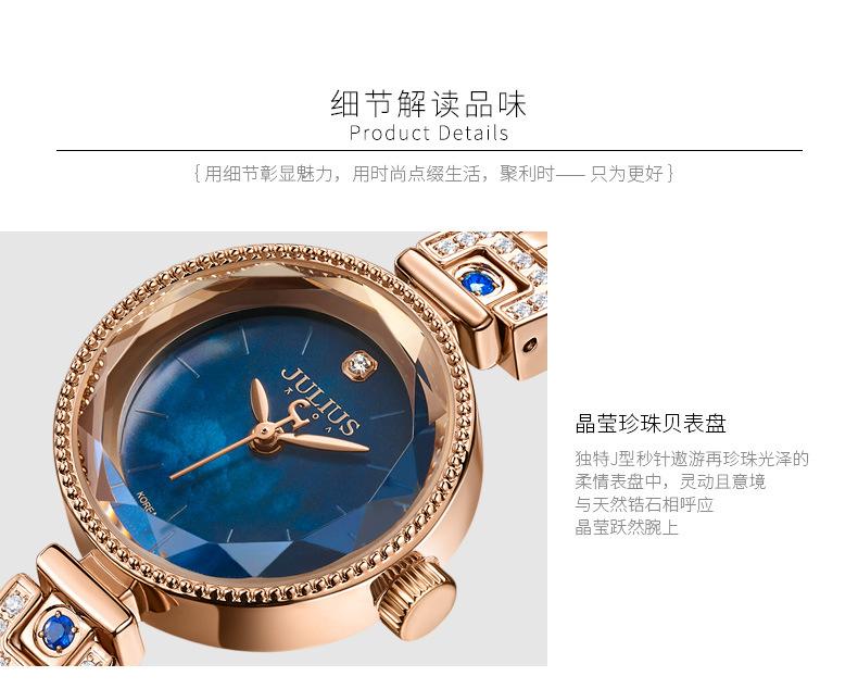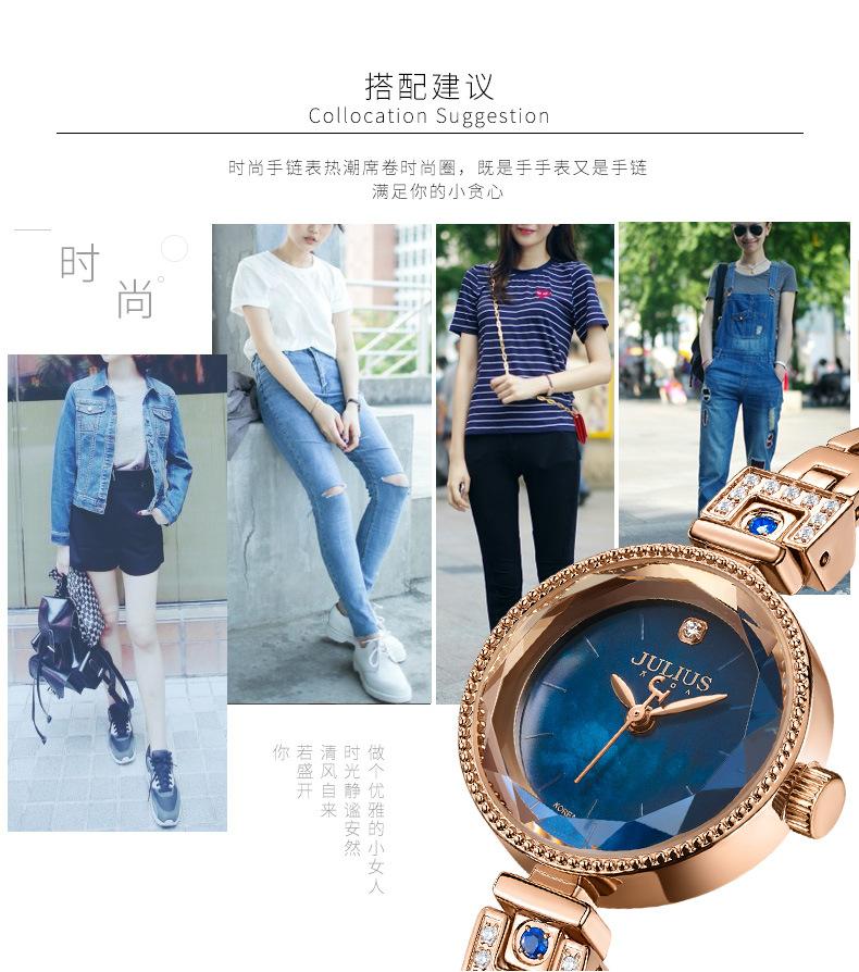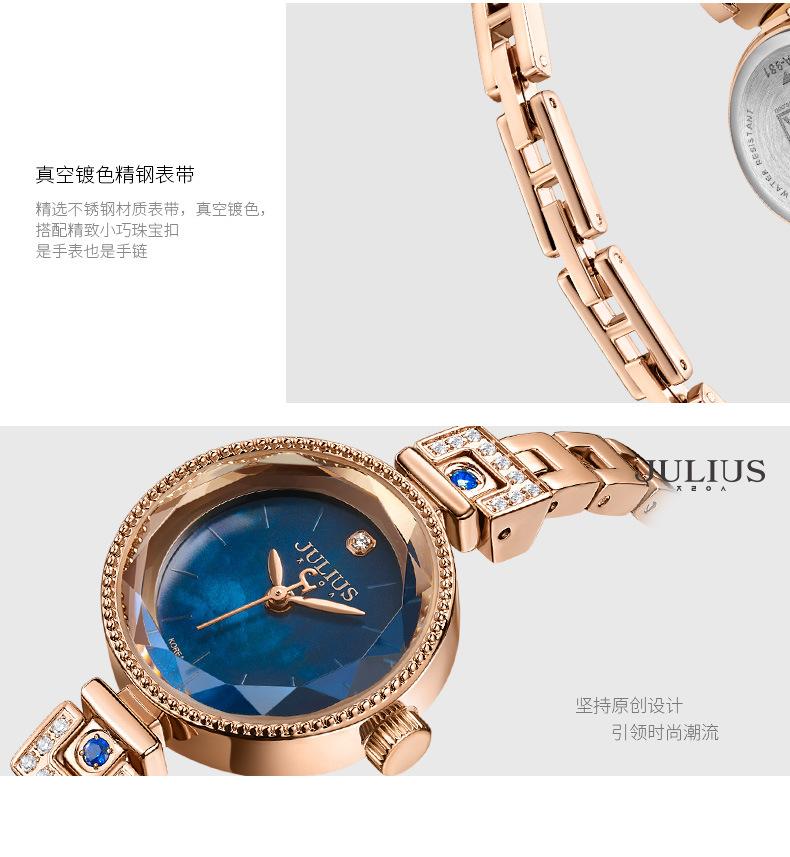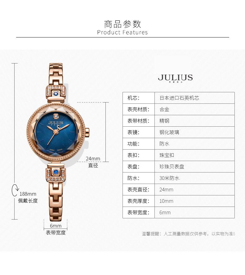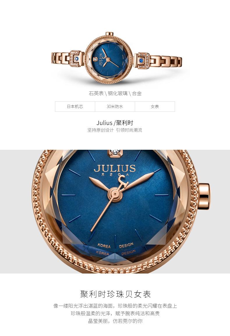 El significado de la marca JULIUS es alegre, único, amoroso, ideal, inusual y brillante. Es un reloj único que te enamorará a primera vista (Just You Will Love, un reloj único y especial). JULIUS toma este nombre y cuenta con siete series principales: Serie Clásica, Serie Emocionante, Serie Brazalete, Serie Exploración, Serie Pareja, Serie Hombre y Serie Edición Limitada.