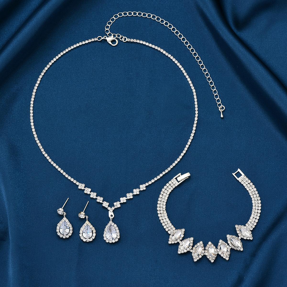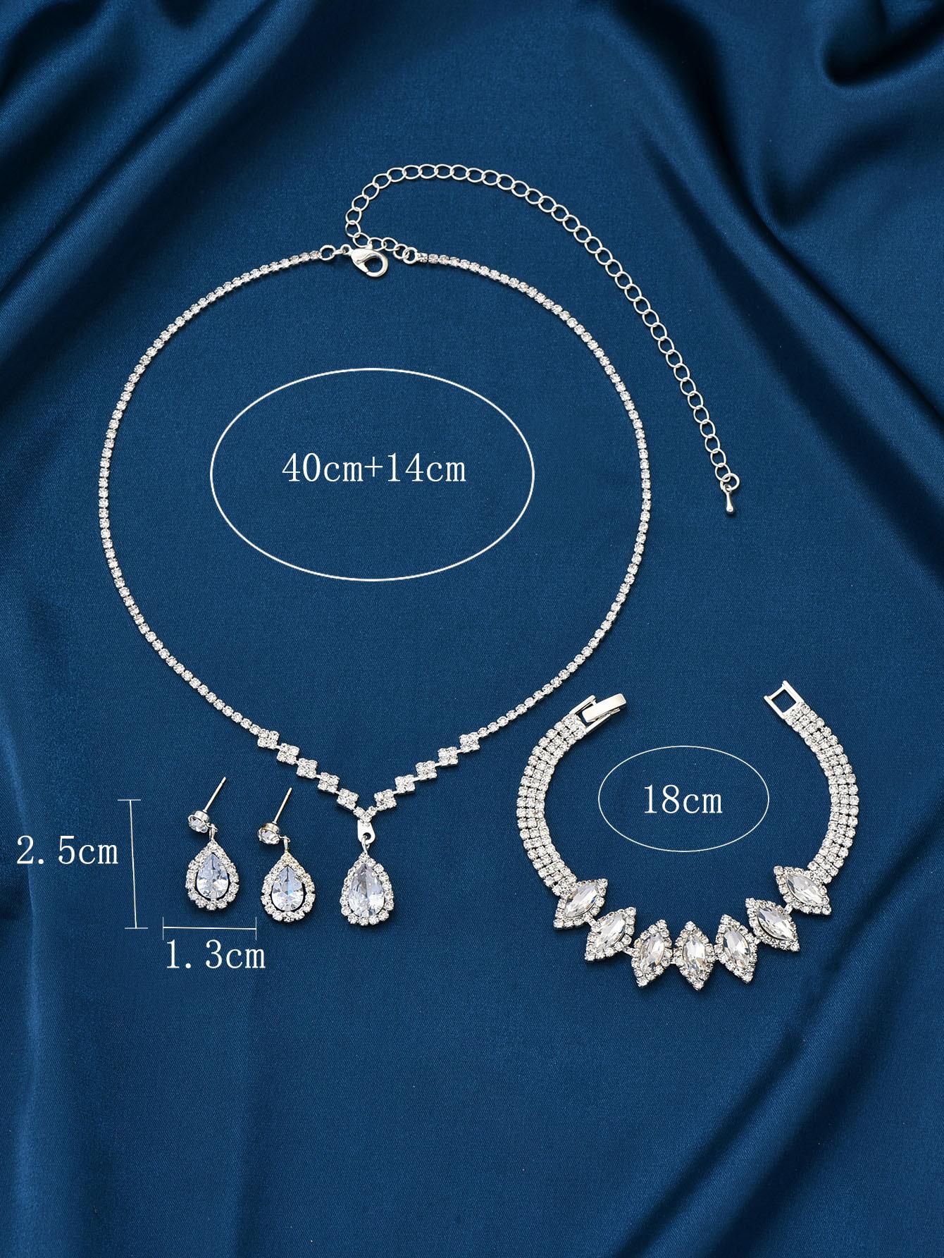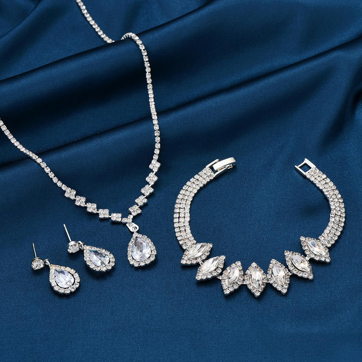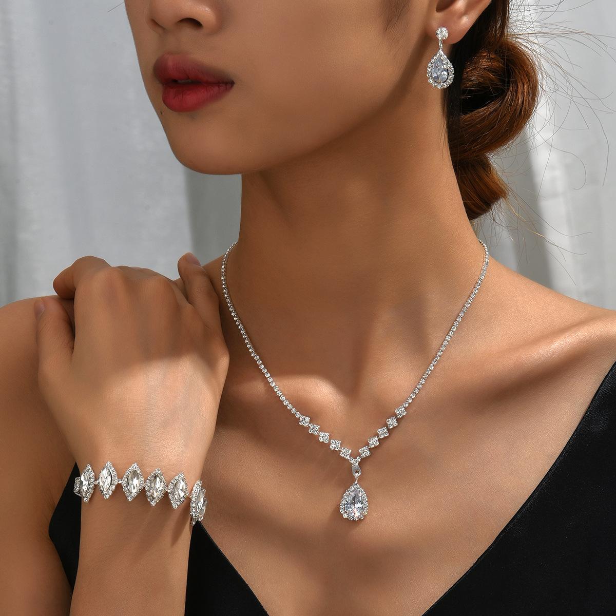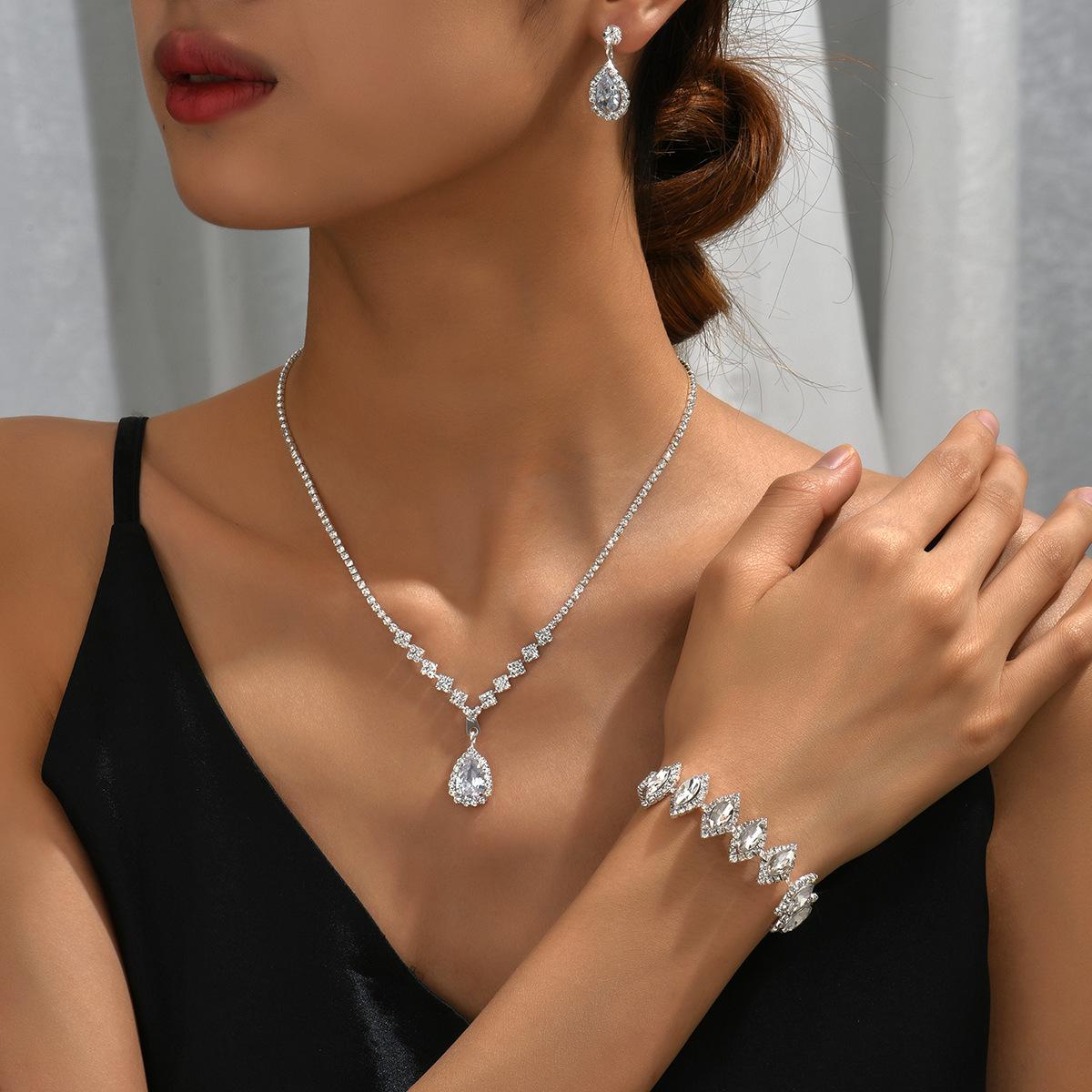Vestido Europeo y Americano Gota de Agua Zircón Diamante de Imitación Collar Aretes Pulsera Estilo Caliente de Amazon Cadena de Garra de Diamantes Completa Juego de Joyería de Tres Piezas