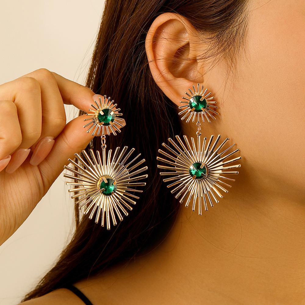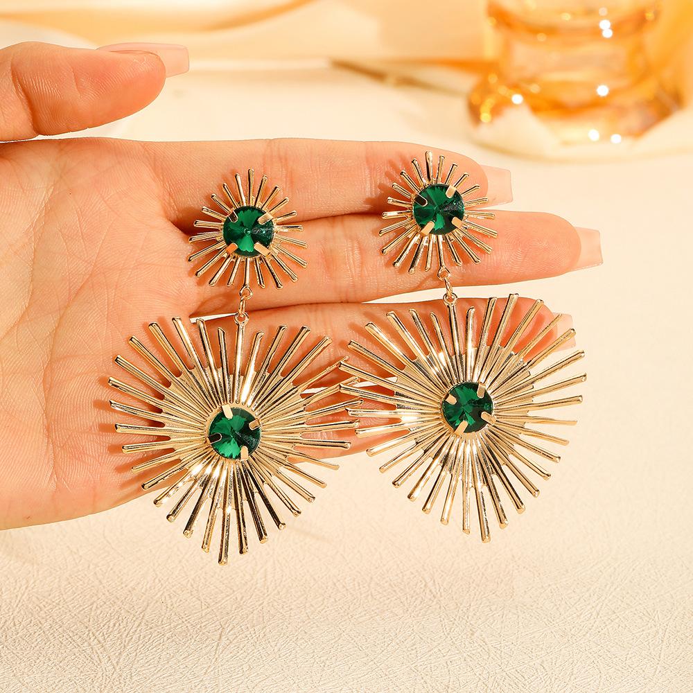 Pendientes de sol esmeralda exagerados con personalidad versátil de estilo lujoso y ligero transfronterizo de Amazon, pendientes femeninos al por mayor