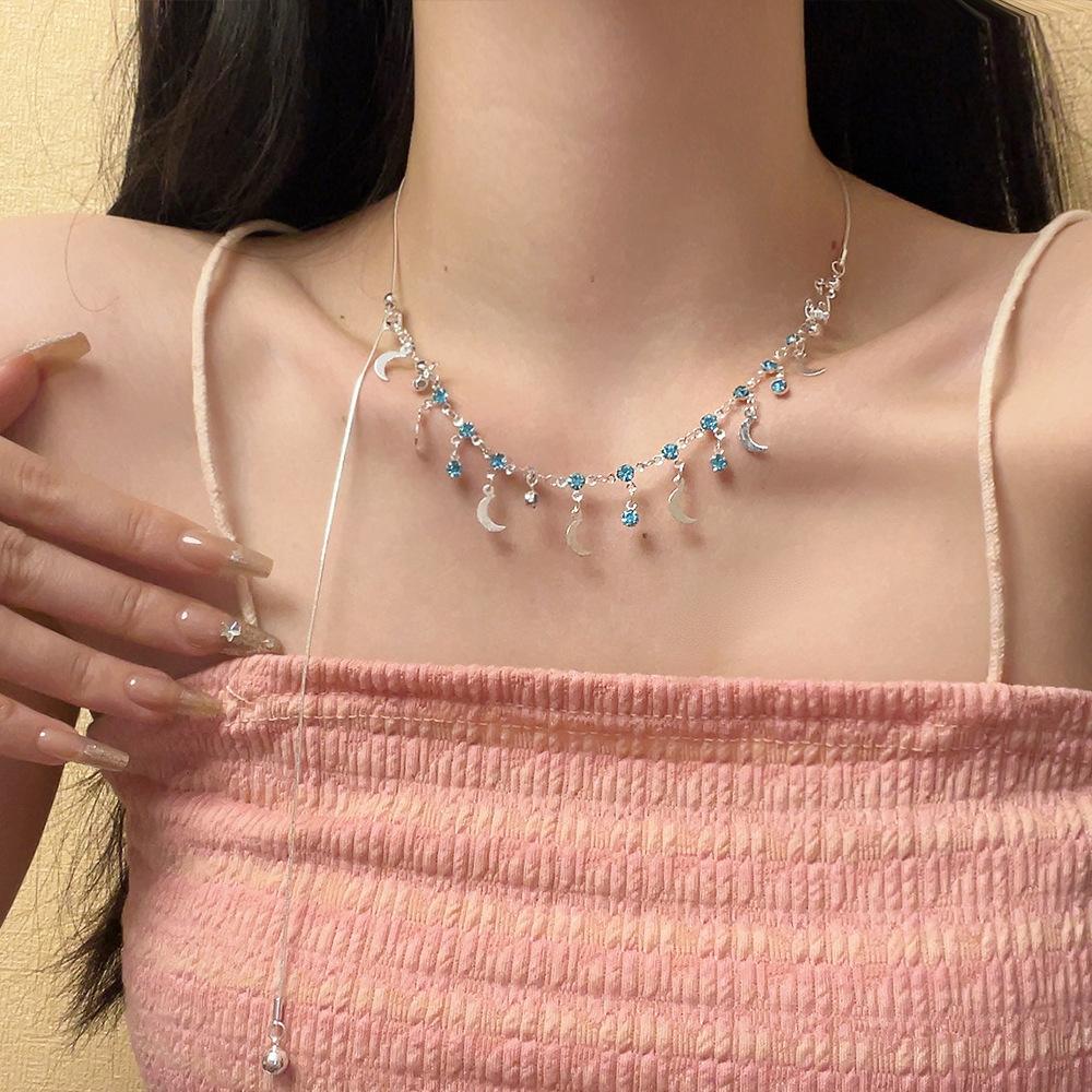 Collar con borla de luna de circonita azul para mujer, cadena de clavícula de nicho elegante, de lujo, ligera y exquisita, combina con todo.