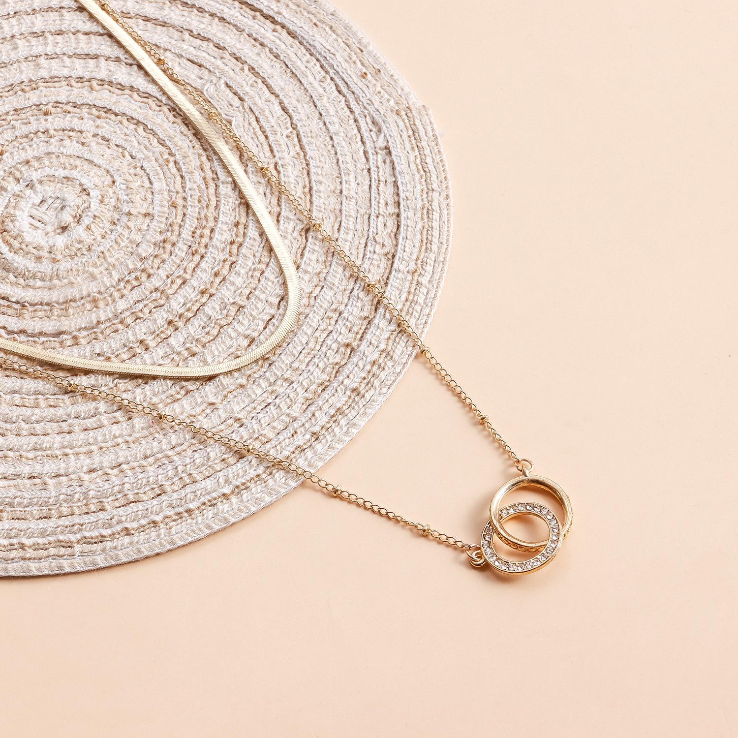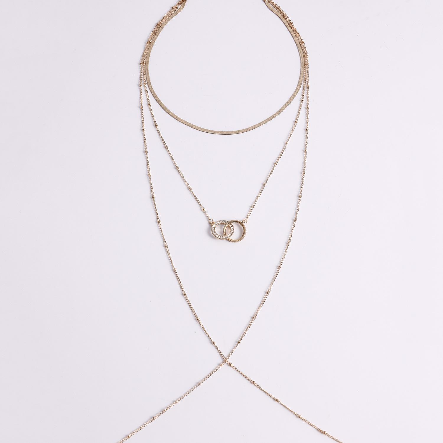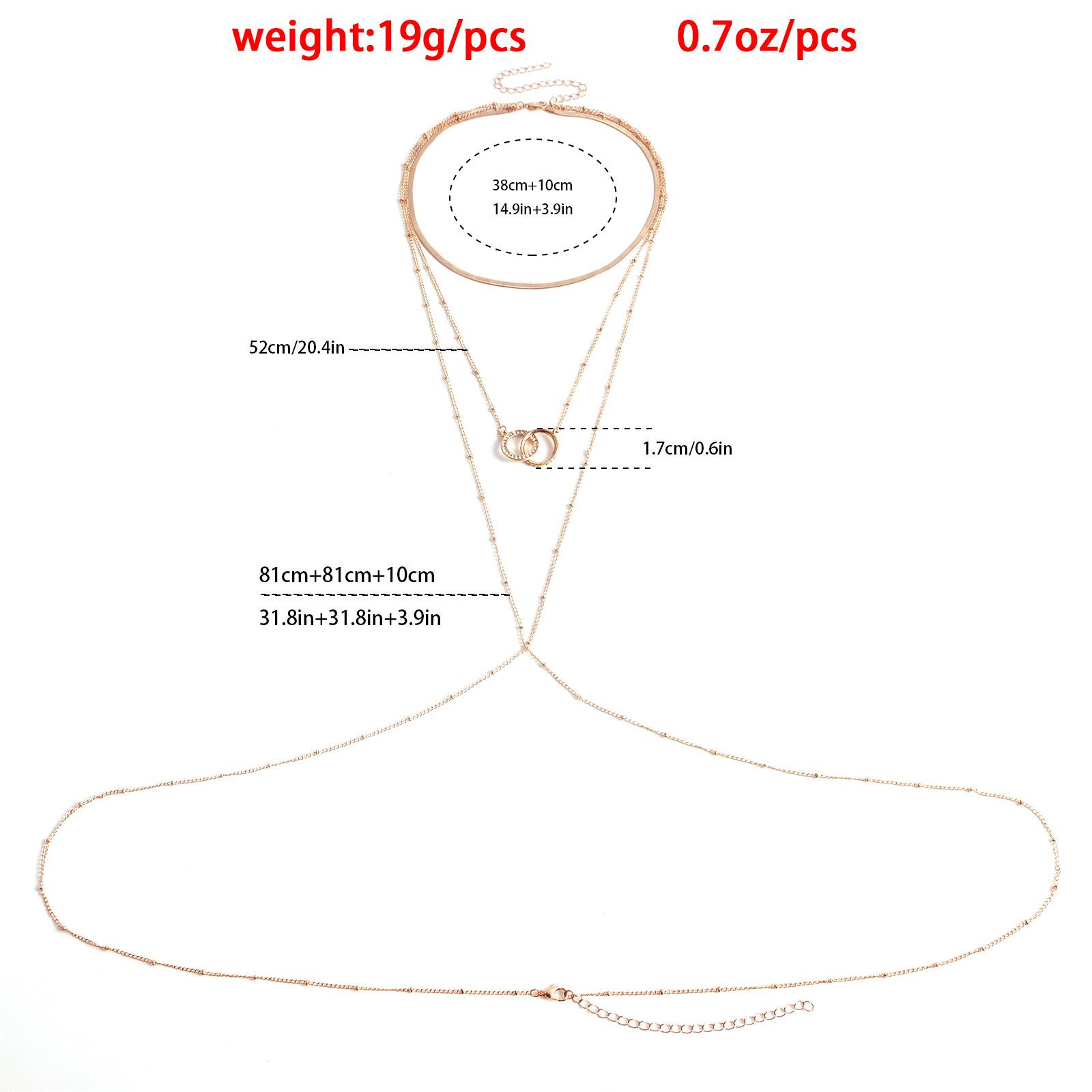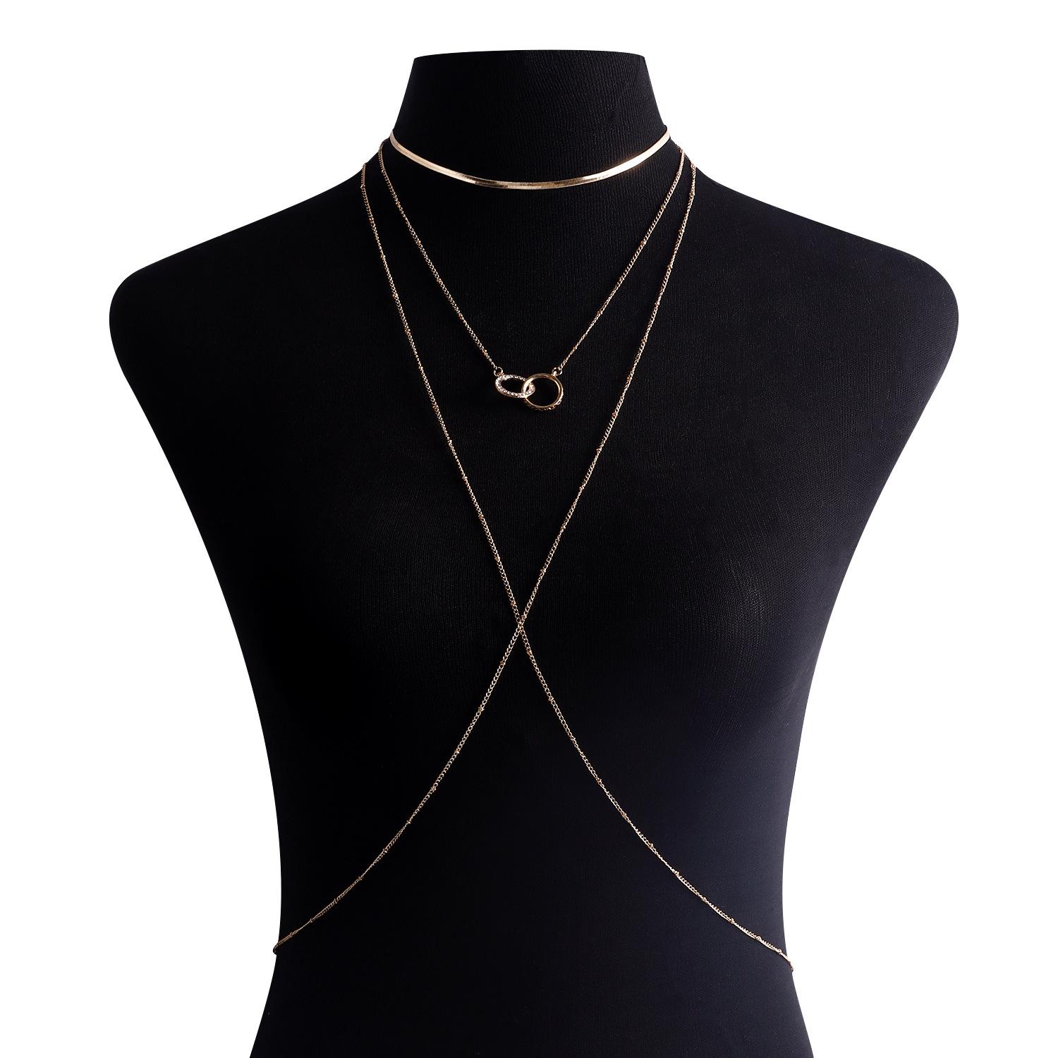 Collar de playa sexy y sencillo con estilo festivo transfronterizo europeo y americano, cadena para el pecho con doble círculo de diamantes, cadena colgante para el cuello y el cuerpo para mujer.