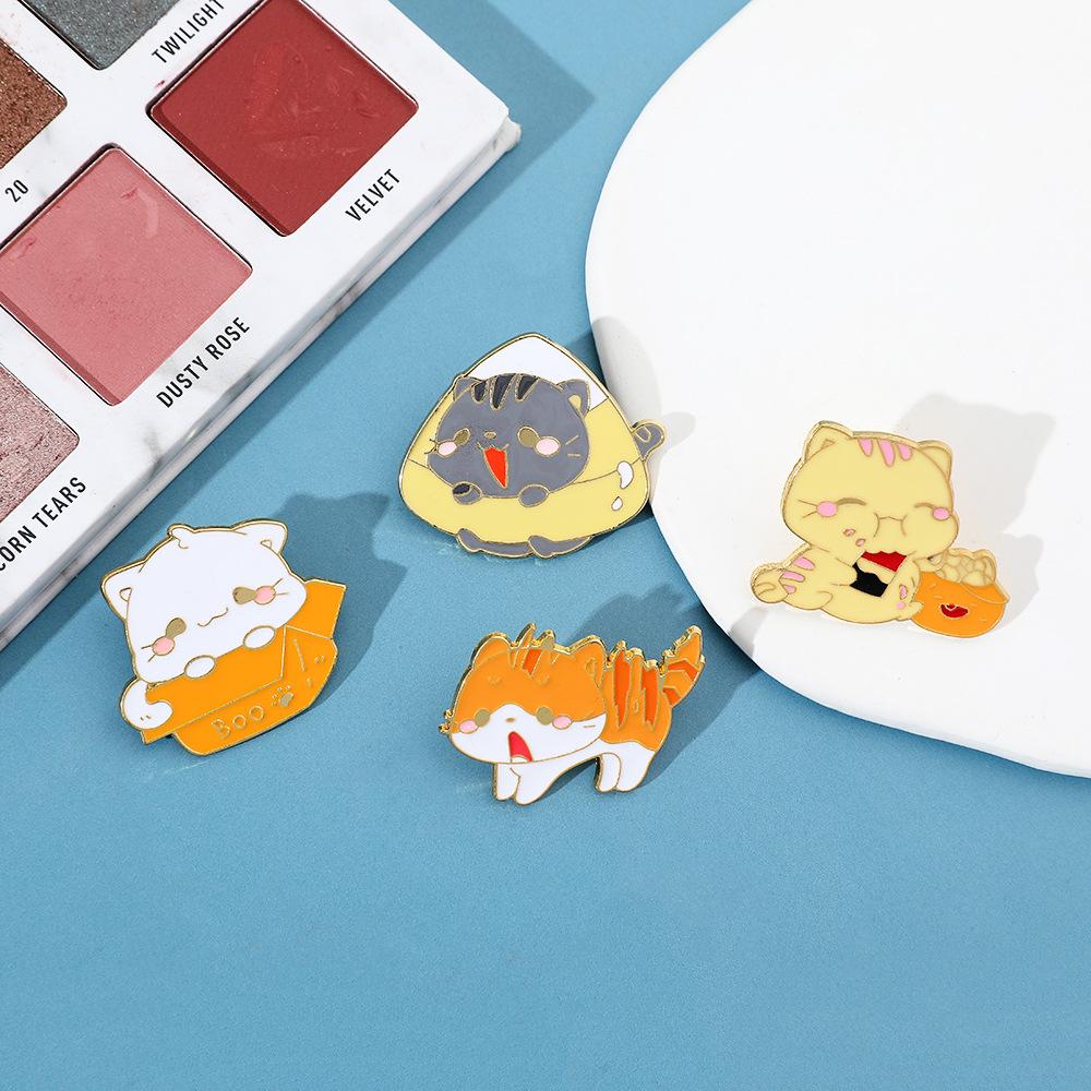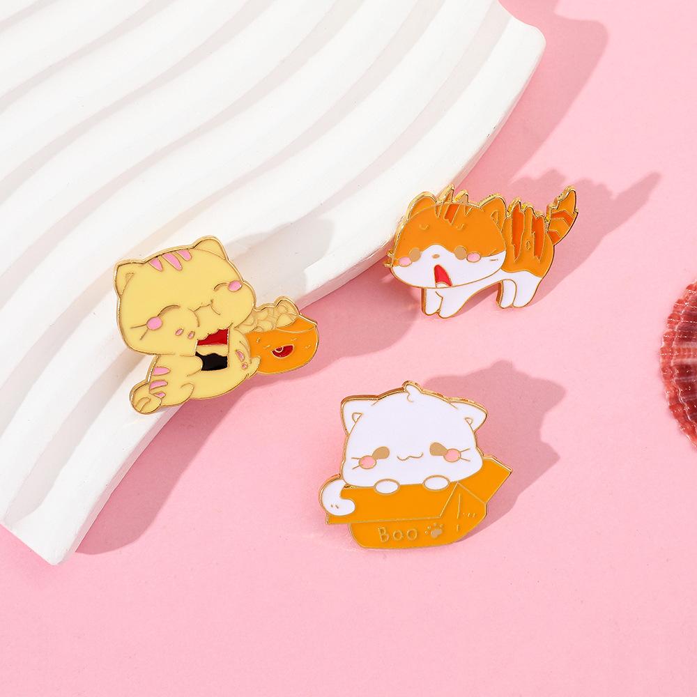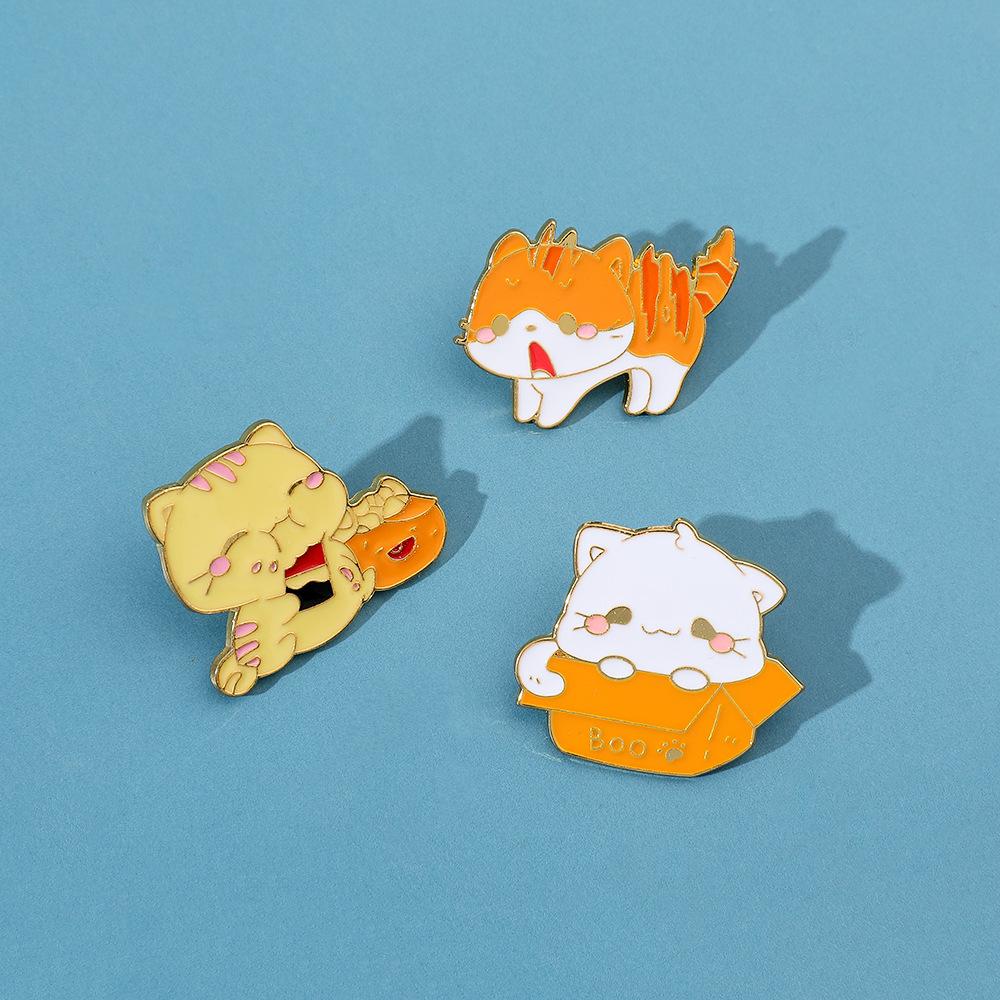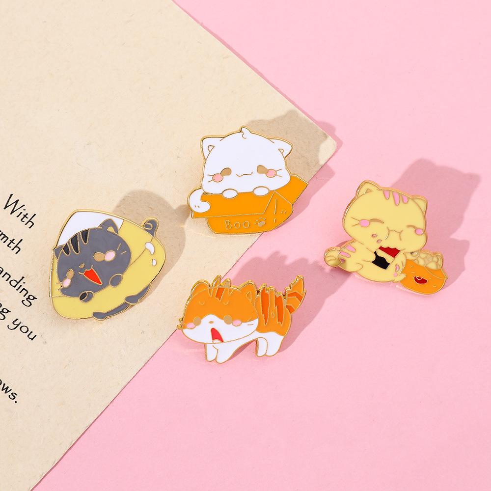 Broche de gato lindo de dibujos animados gatito gato en cartón comiendo asustado insignia de metal accesorios pin