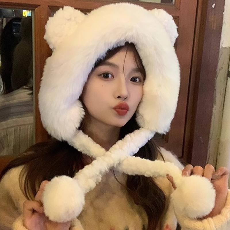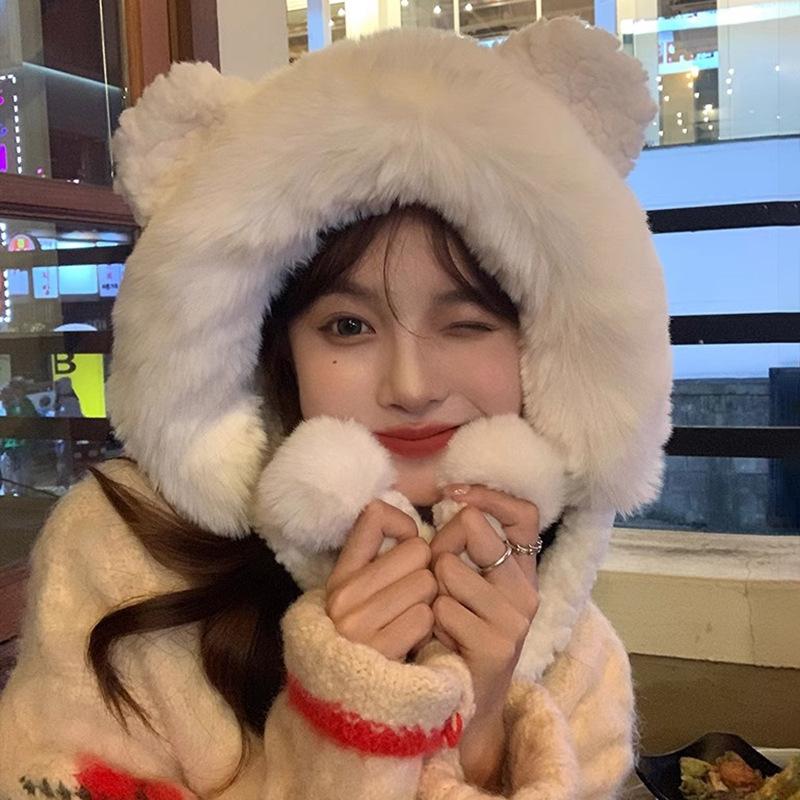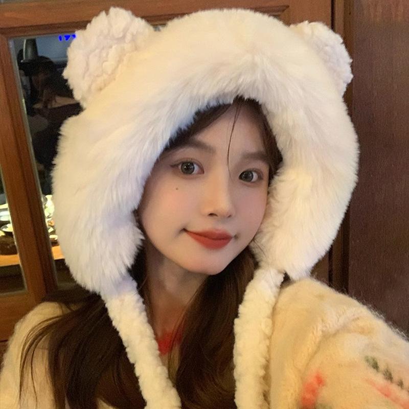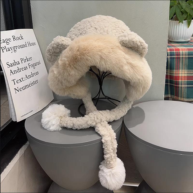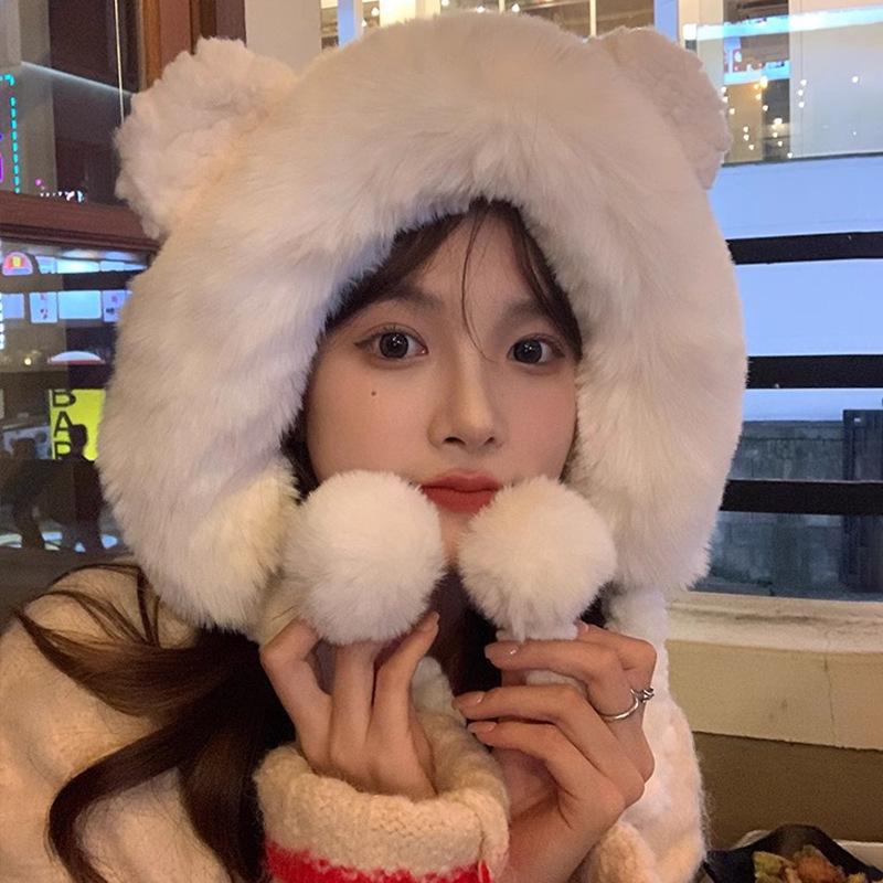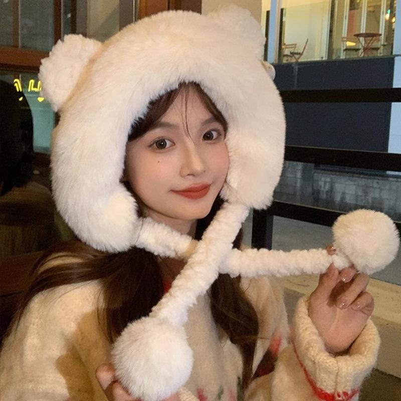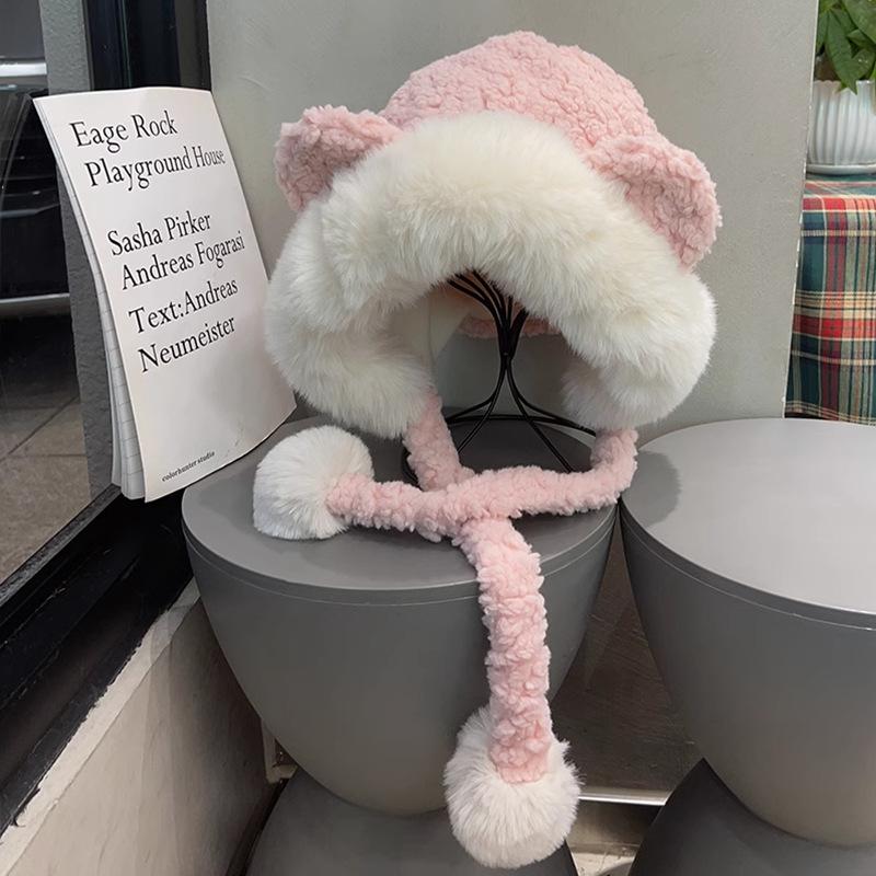 Corea del Sur Red Sombrero tejido con orejas de oso invierno engrosado cálido sombrero Lei Feng femenino orejeras de felpa sombrero de lana a prueba de frío
