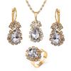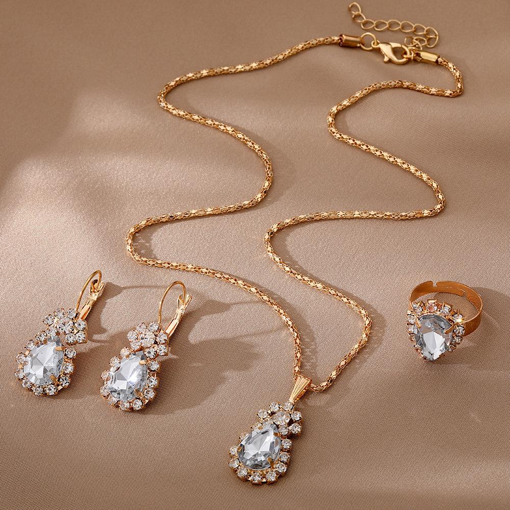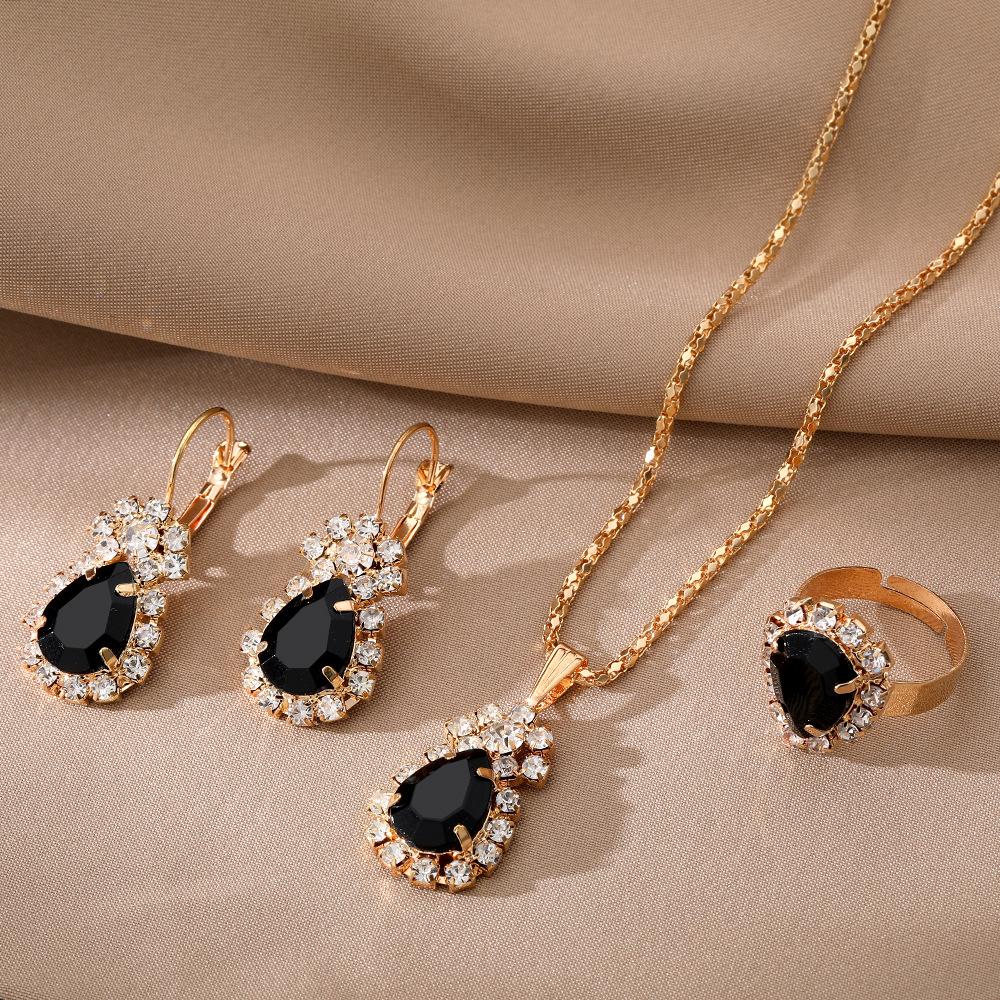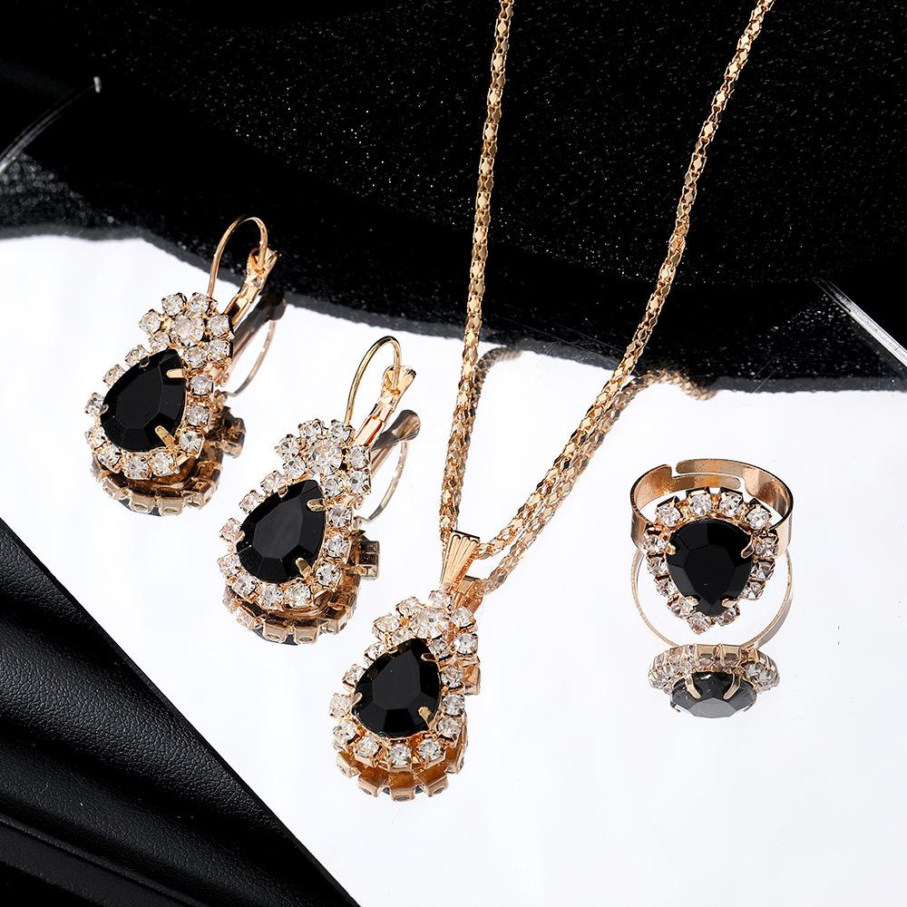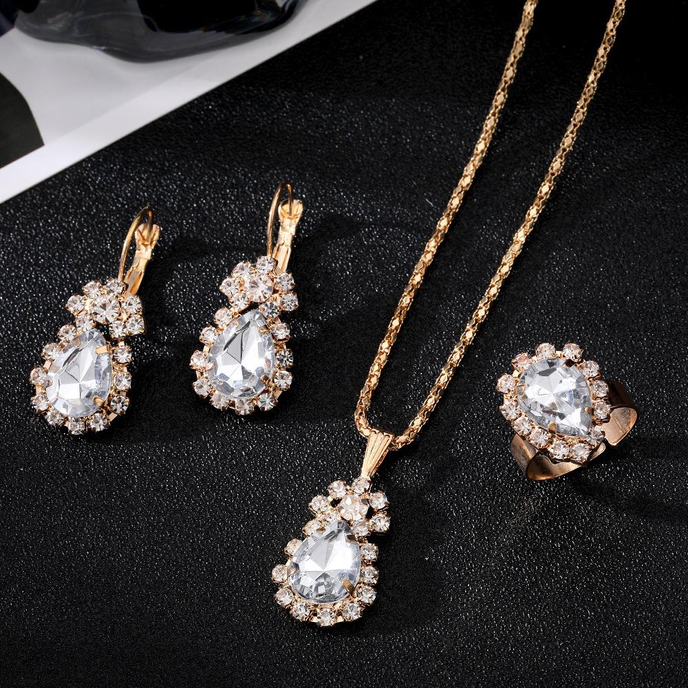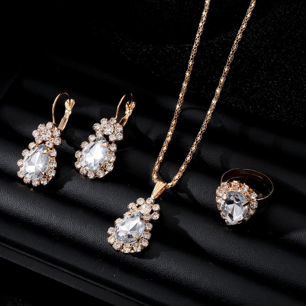 Conjunto de joyería de collar y pendientes de circonita transfronterizos europeos y americanos para mujer, elegante y ligero anillo de gemas de lujo, conjunto de tres piezas de joyería de gota de agua
