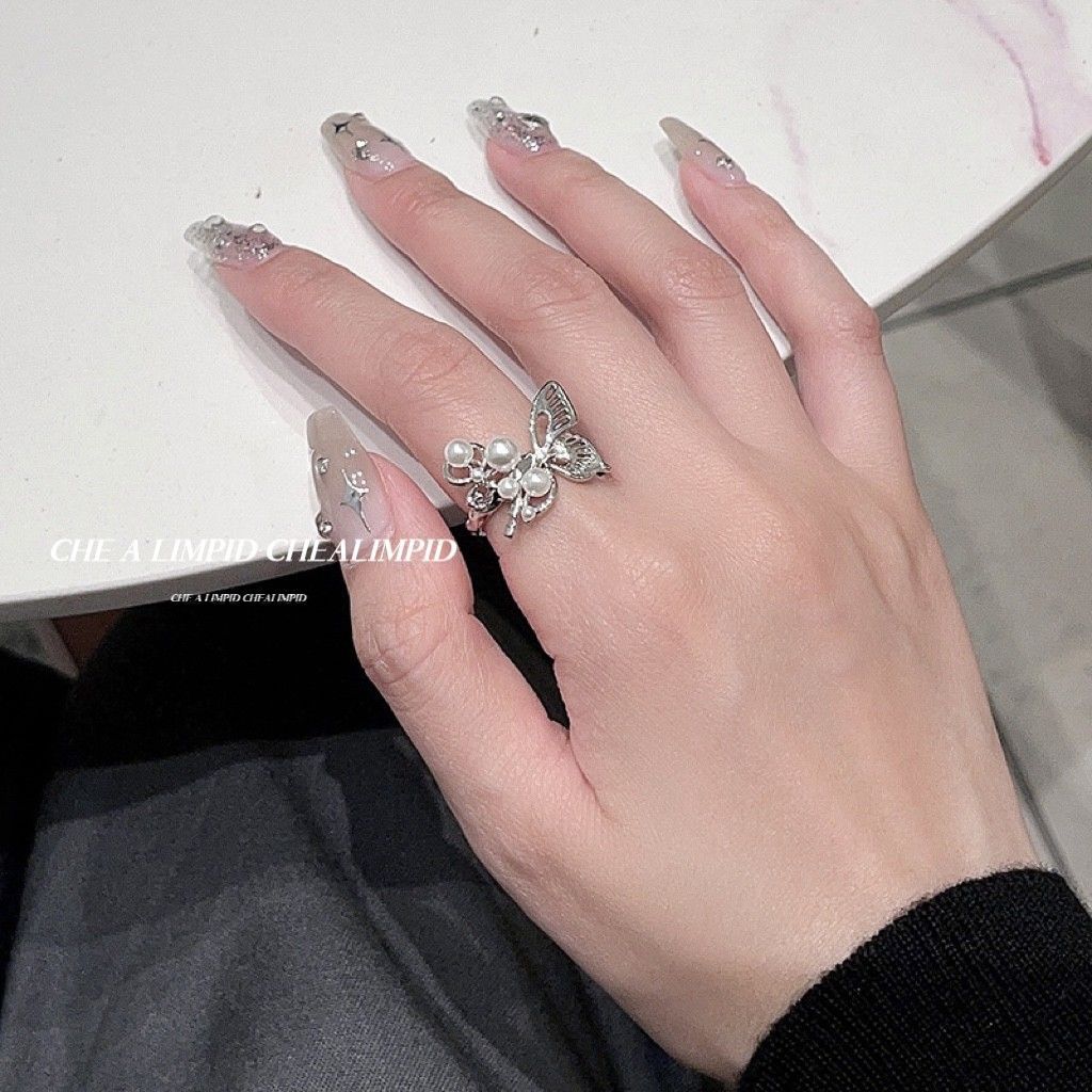 Anillo de acero de titanio con diseño de nicho, diseño de mariposa y perla, para mujer, estilo ins, resistente a la decoloración, anillo con personalidad para el dedo índice.