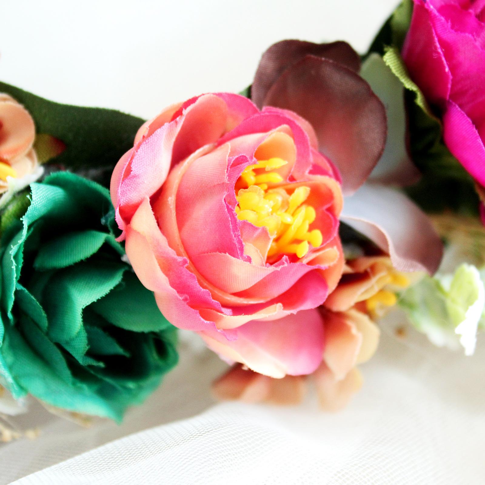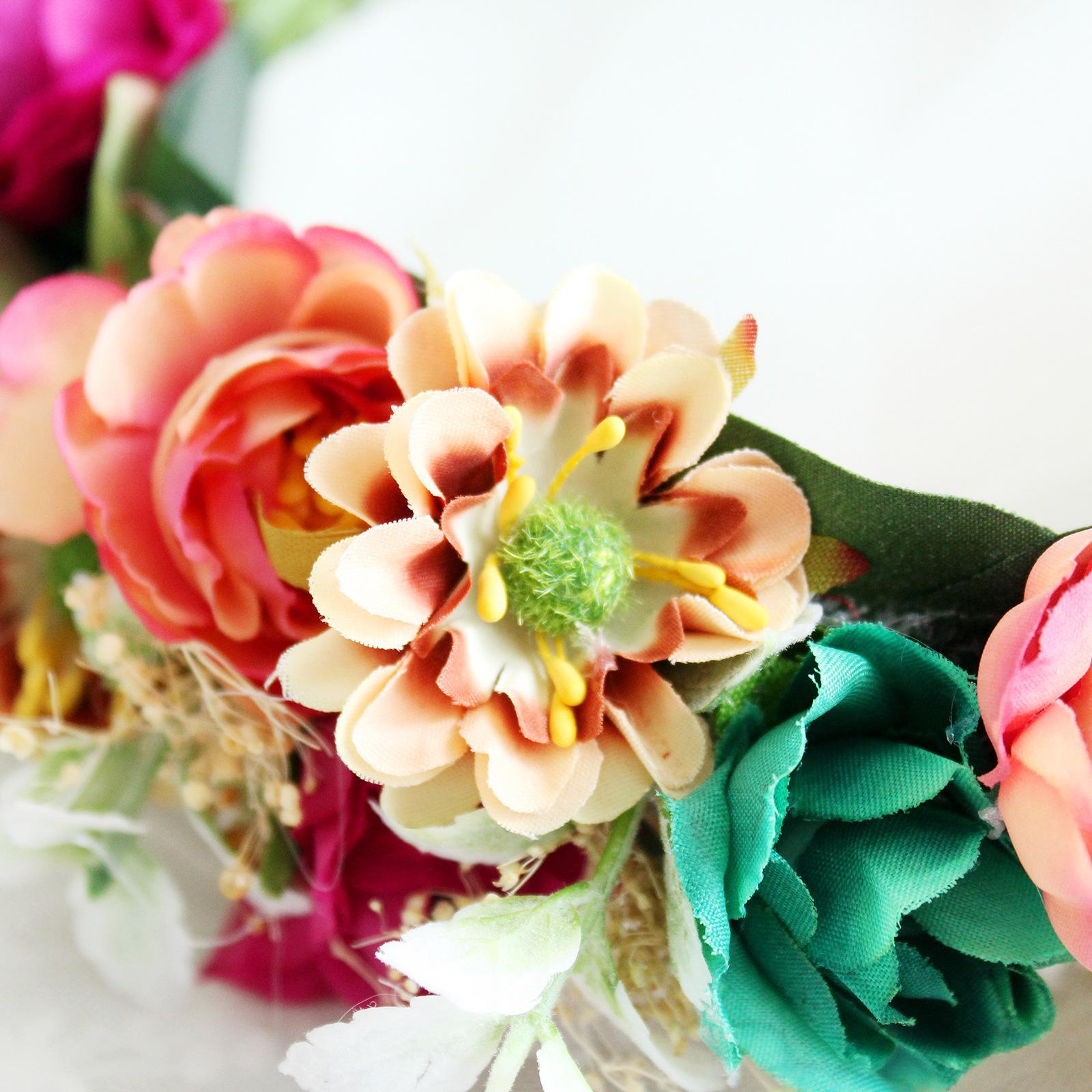 Material: Las flores están hechas de buenas telas y no se deforman fácilmente; los accesorios de hojas verdes utilizados están hechos de plástico simulado; el interior de la corona está torcido con alambre de hierro y decorado con nube de bebé natural.(El aliento de bebé se cae fácilmente, así que manéjelo con cuidado)